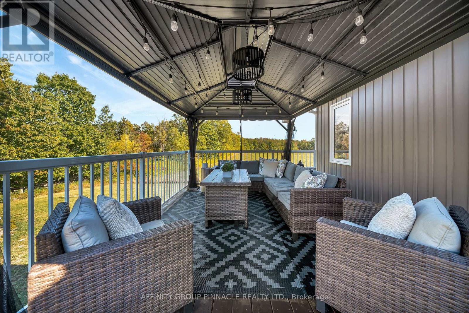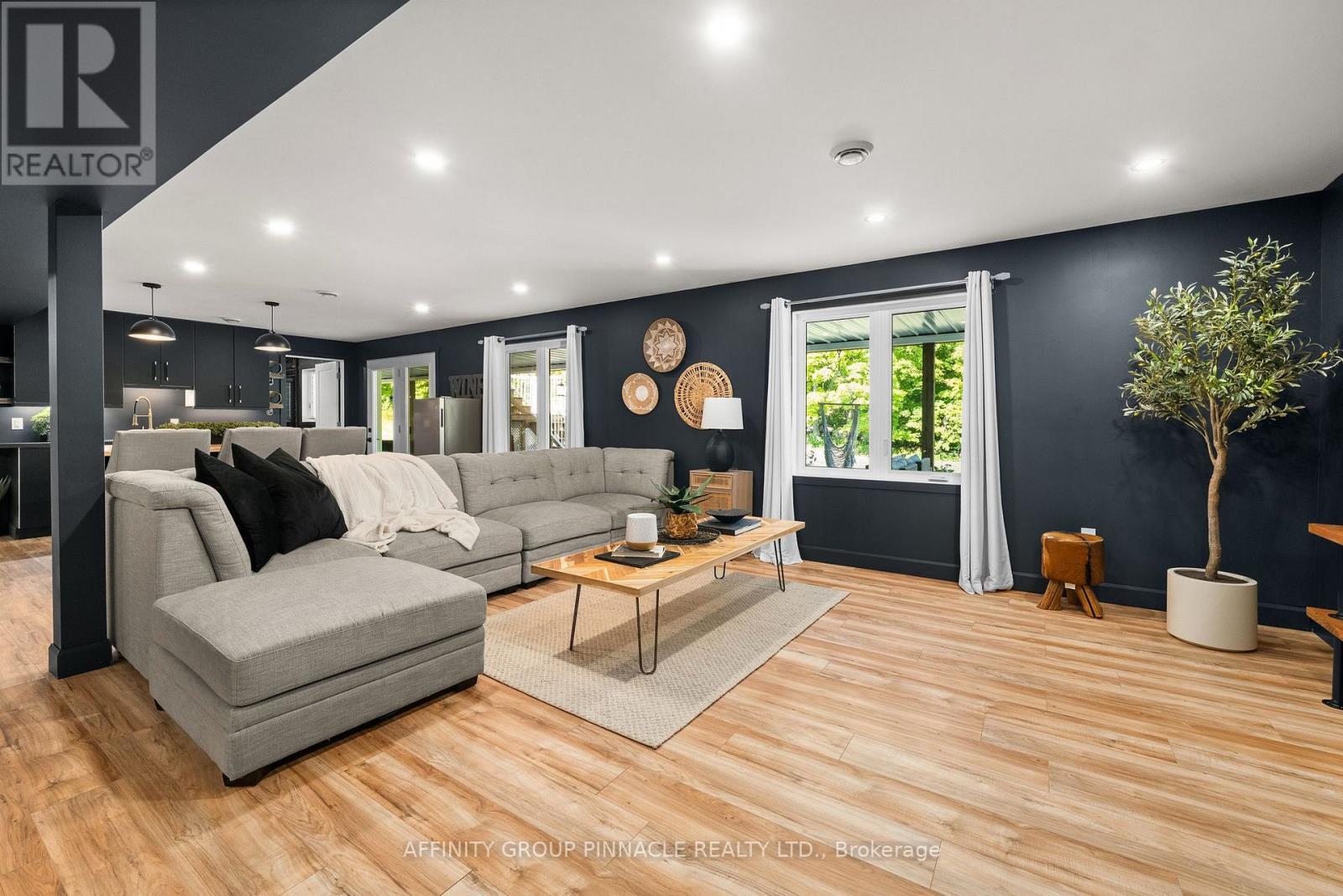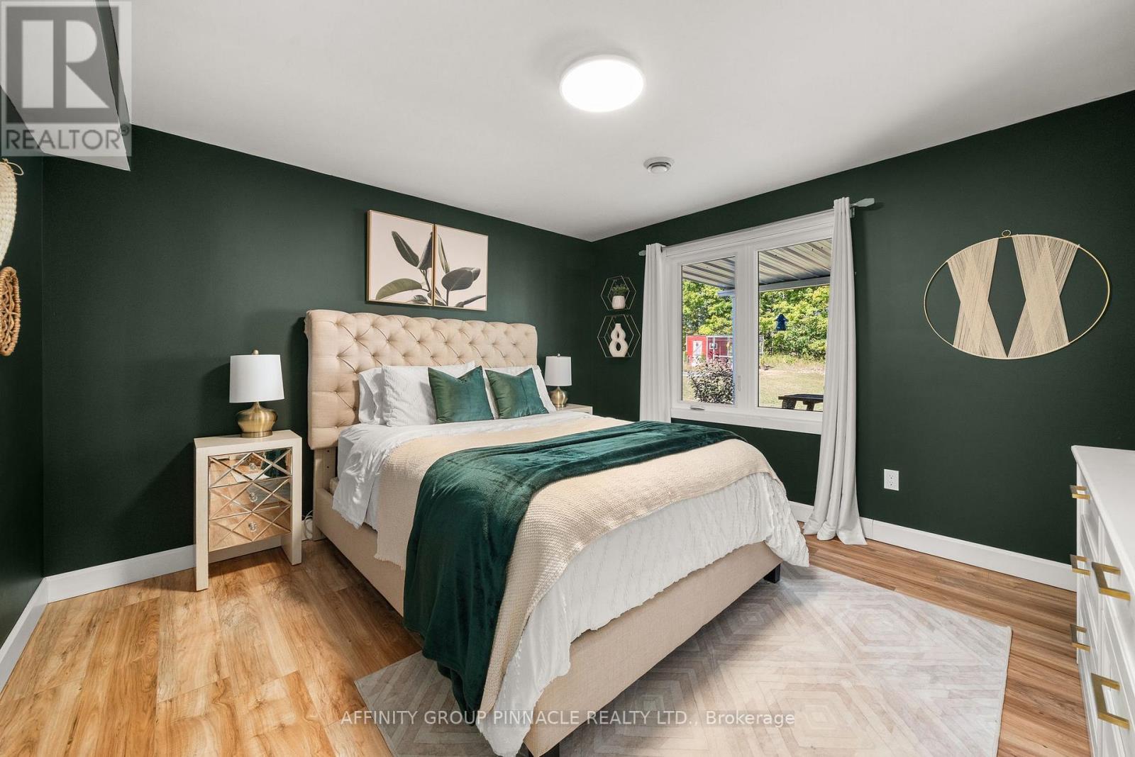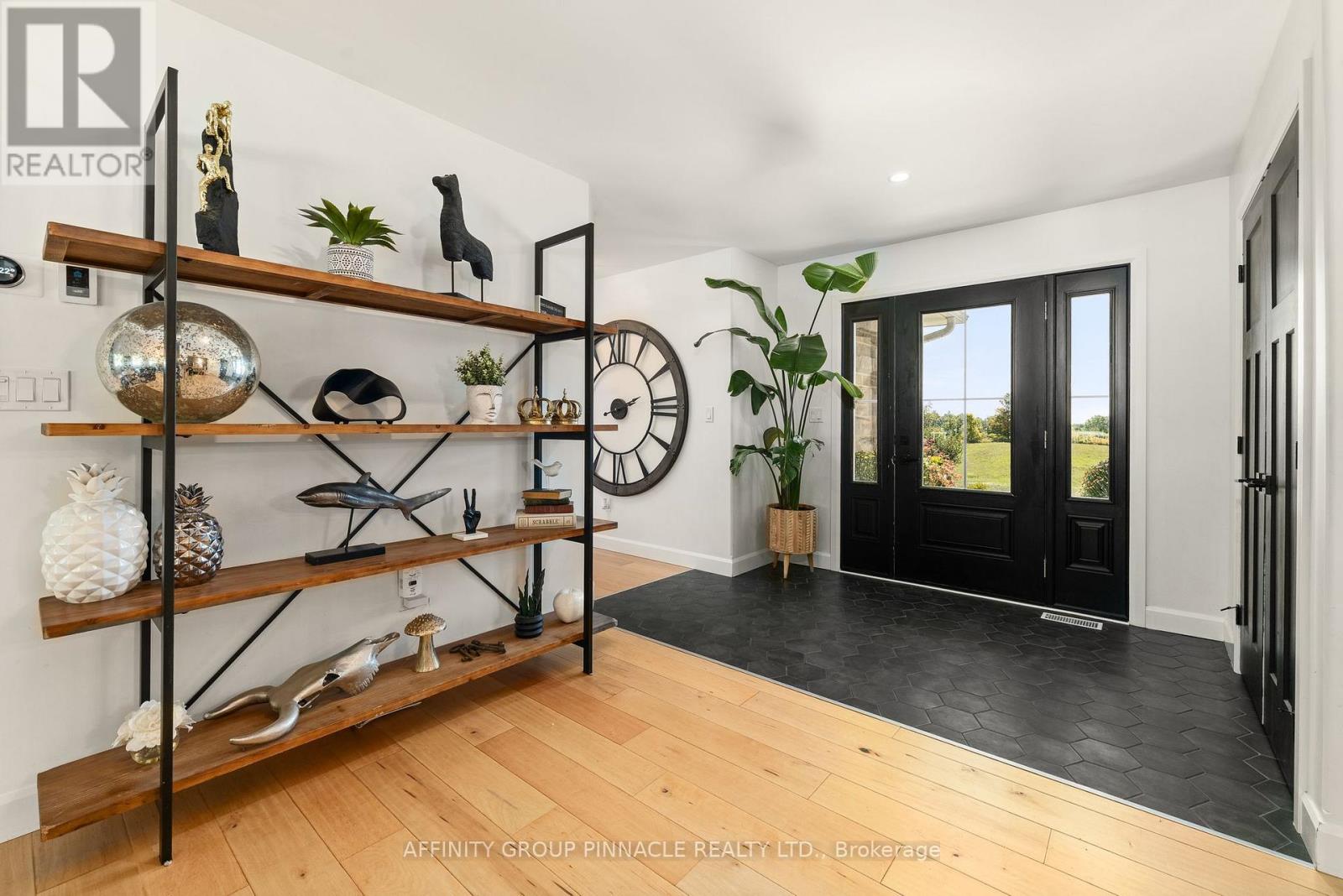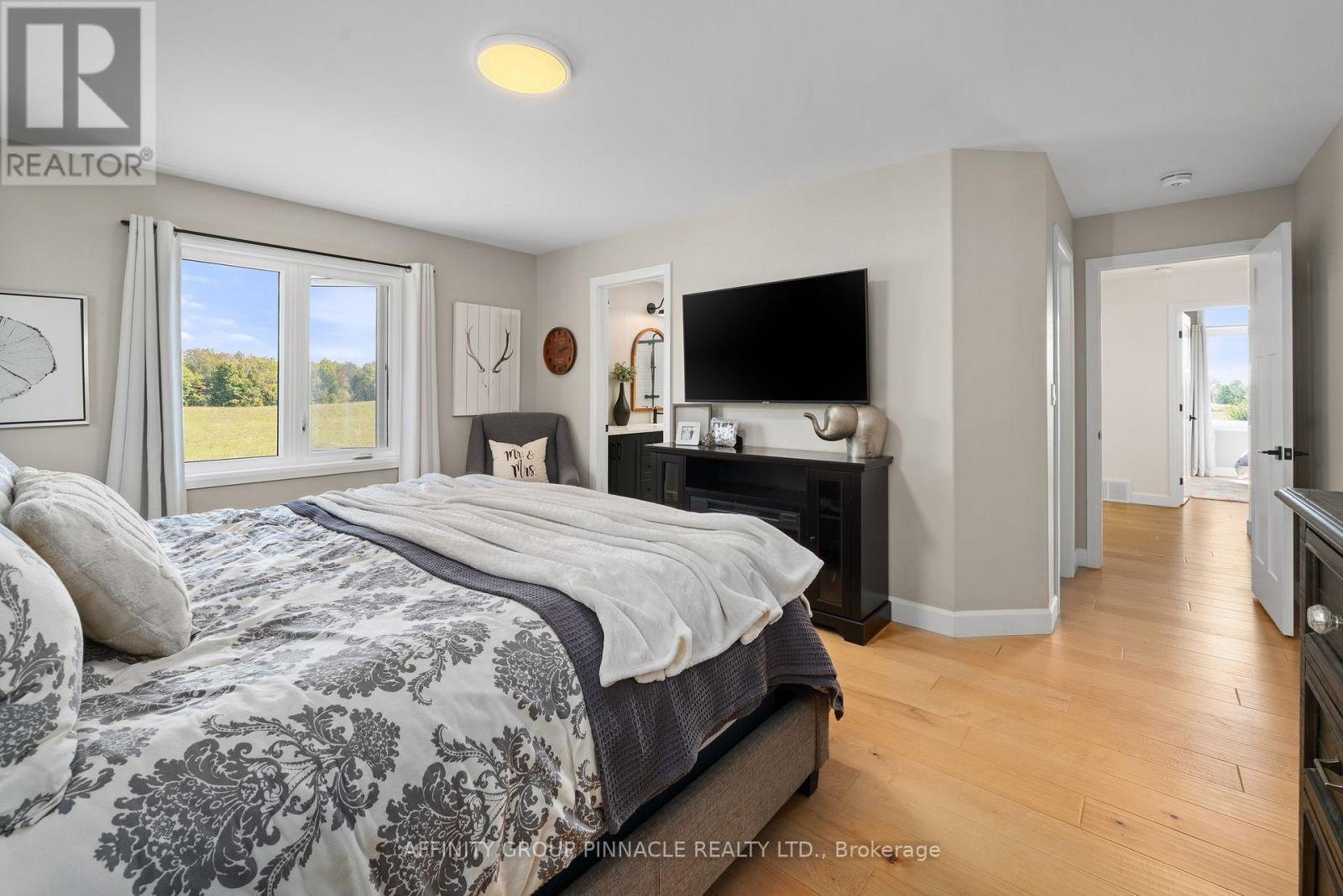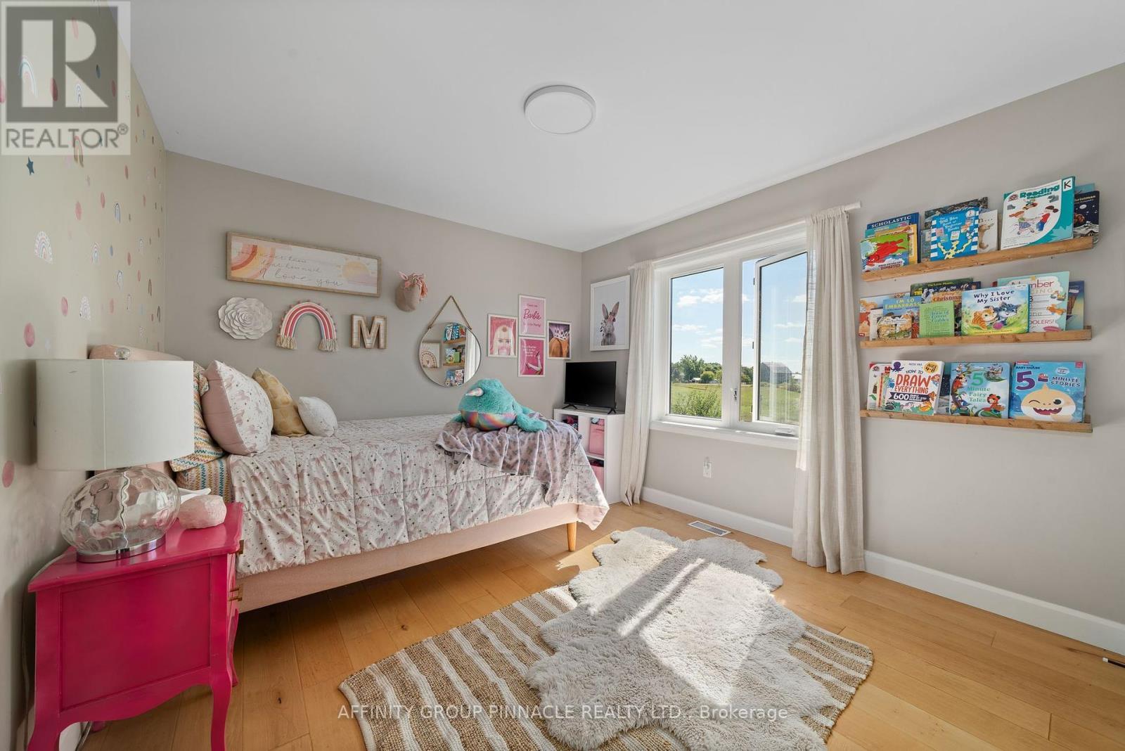 This 4 bedroom 3 bath 1756 square foot bungalow is over the top. Built in 2021 and situated on an amazing 15 acre property surrounded by fields and forest. From the moment you walk through the welcoming foyer into the huge open concept kitchen, dining and living room with vaulted ceiling and hardwood throughout. you' ll feel at home. Quartz counters, spacious island and stainless steel appliances. Walk out to a massive deck with a sitting and BBQ gazebo overlooking a lovely back yard complete with pool, chicken coop and fire pit area. Mainfloor has Laundry, 3 bedrooms, an ensuite and separate entrance to the double garage. The newly finished lower level boasts an incredible bright rec room an office, an exercise room and another bedroom, and an inviting wet bar area. Walkout to a covered patio and enjoy a quiet relaxing sitting area. This lovely home is still under Tarion warranty, and agreement with the farmer keeps taxes low. (id:51158)