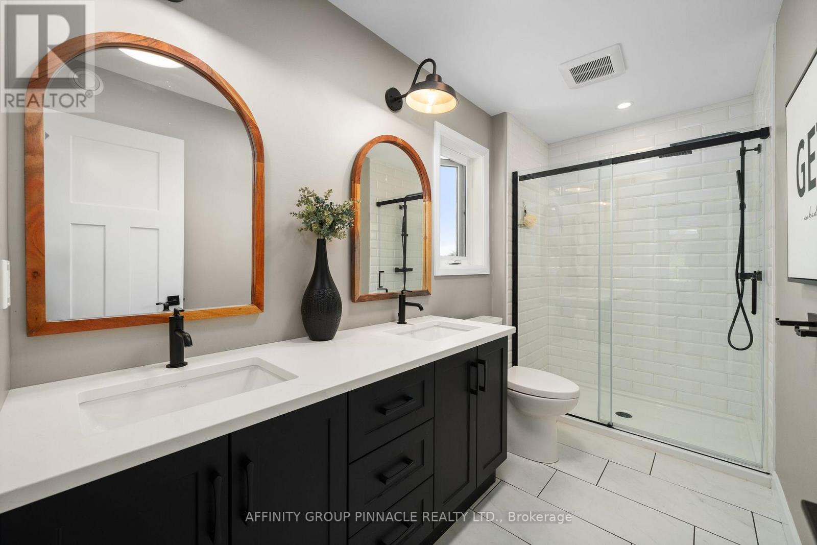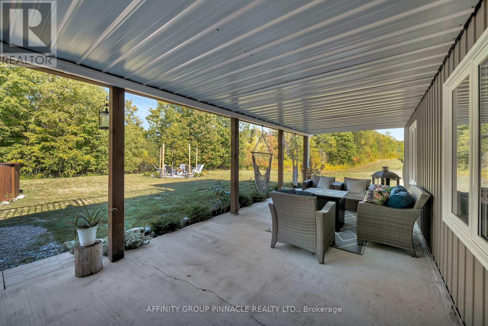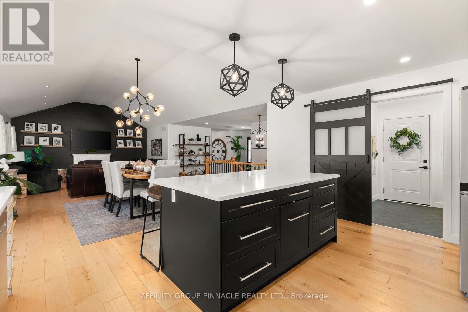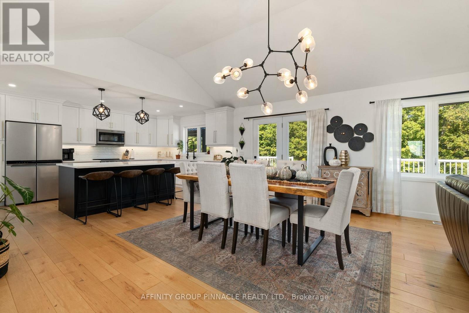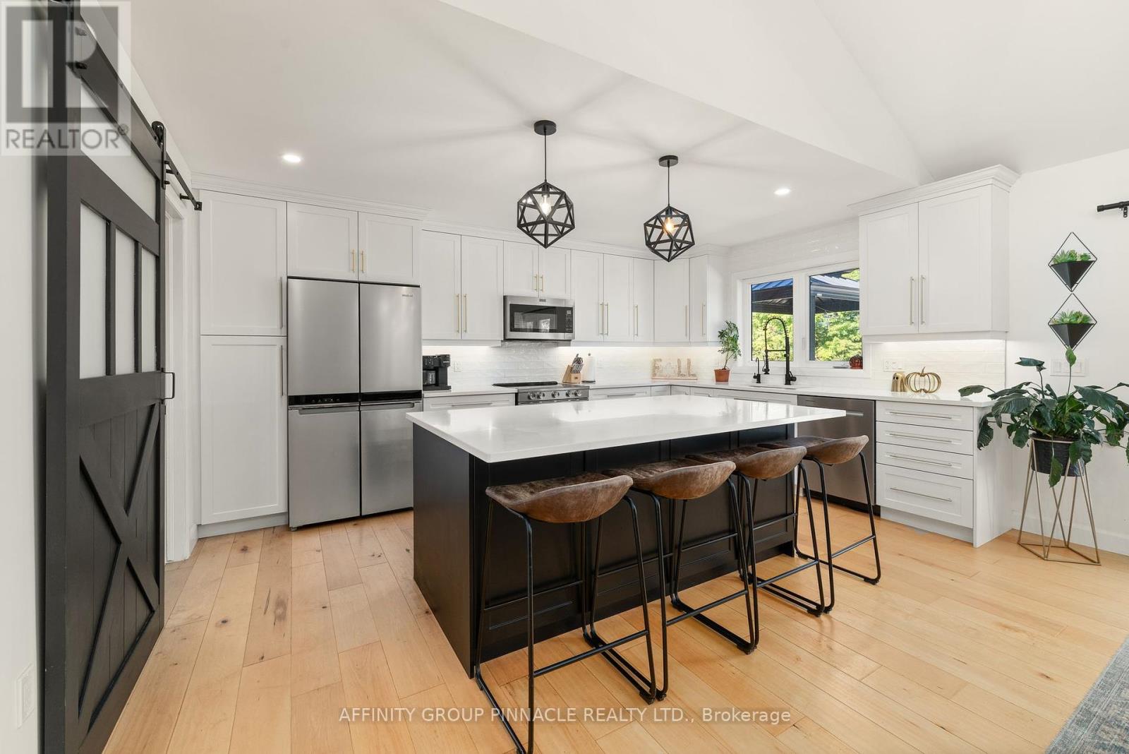 This 4 bedroom 3 bath 1756 square foot bungalow is over the top. Built in 2021 and situated on an amazing 15 acre property surrounded by fields and forest. From the moment you walk through the welcoming foyer into the huge open concept kitchen, dining and living room with vaulted ceiling and hardwood throughout. you' ll feel at home. Quartz counters, spacious island and stainless steel appliances. Walk out to a massive deck with a sitting and BBQ gazebo overlooking a lovely back yard complete with pool, chicken coop and fire pit area. Mainfloor has Laundry, 3 bedrooms, an ensuite and separate entrance to the double garage. The newly finished lower level boasts an incredible bright rec room an office, an exercise room and another bedroom, and an inviting wet bar area. Walkout to a covered patio and enjoy a quiet relaxing sitting area. This lovely home is still under Tarion warranty, and agreement with the farmer keeps taxes low. (id:51158)