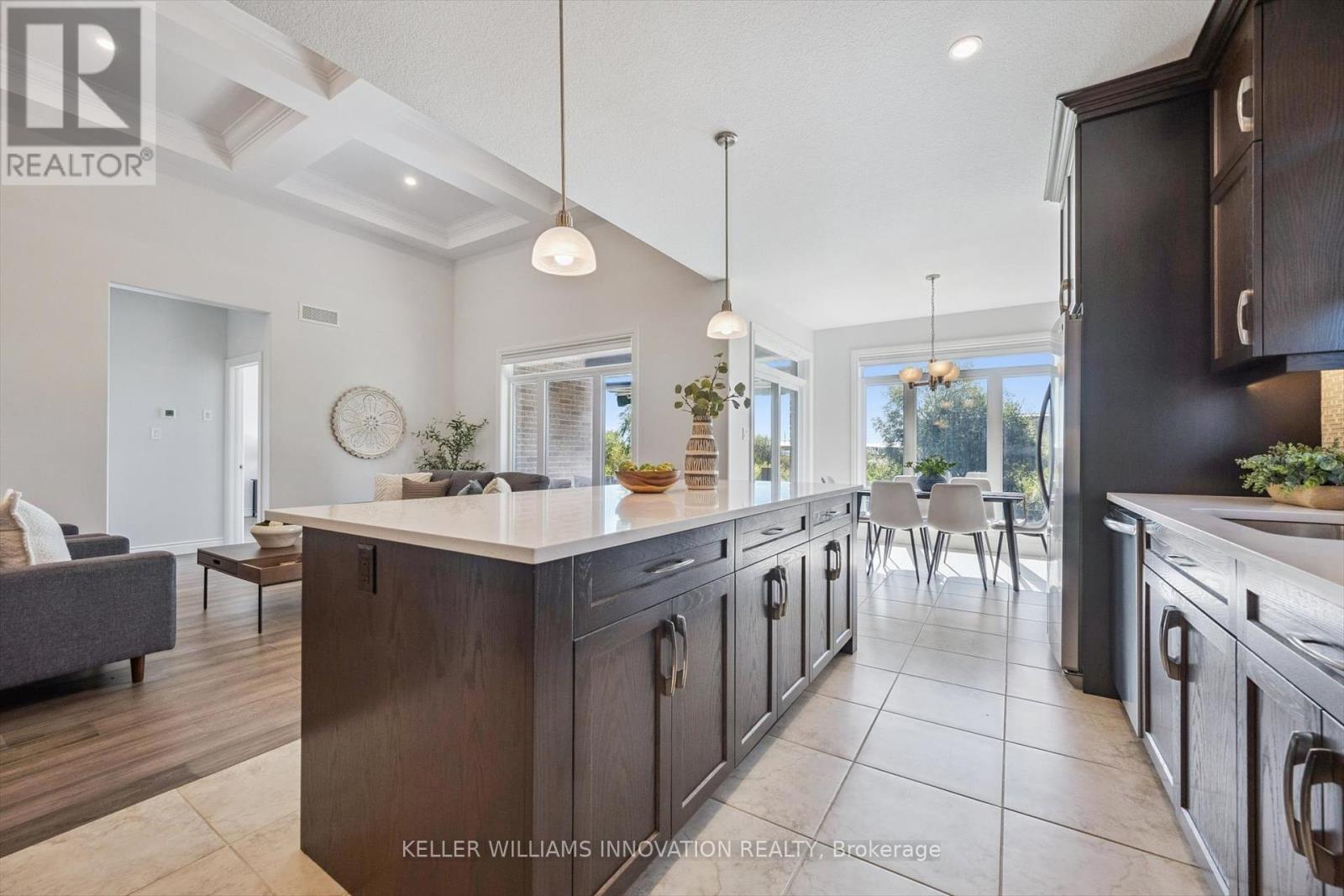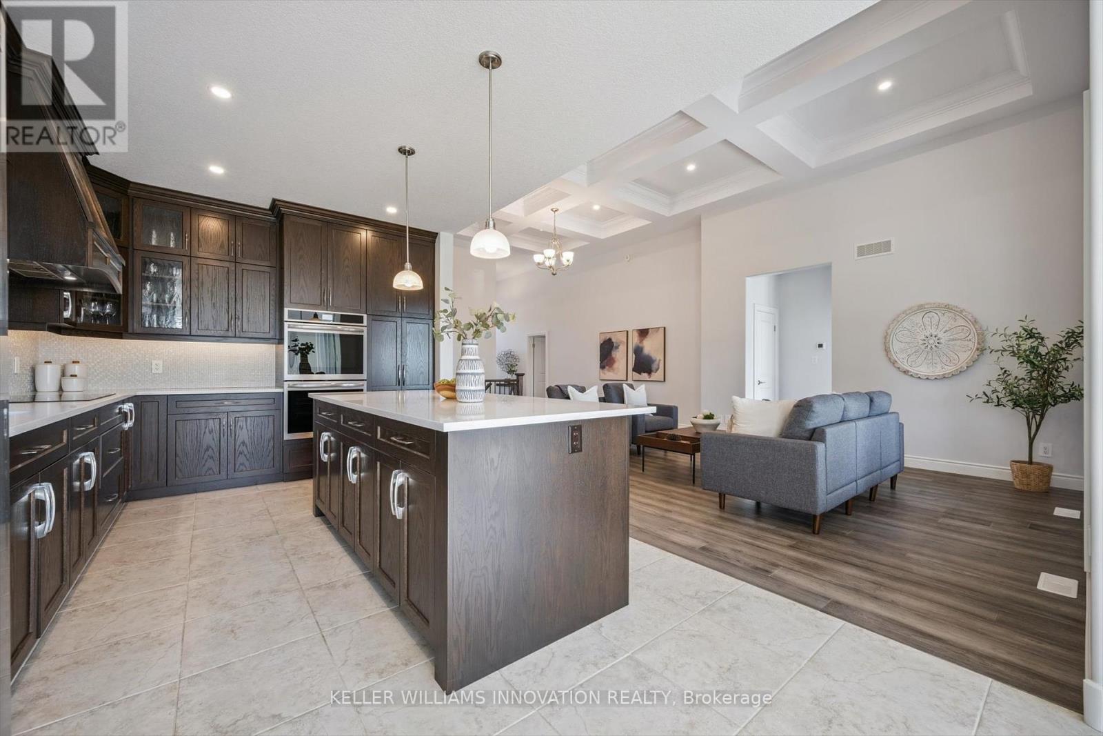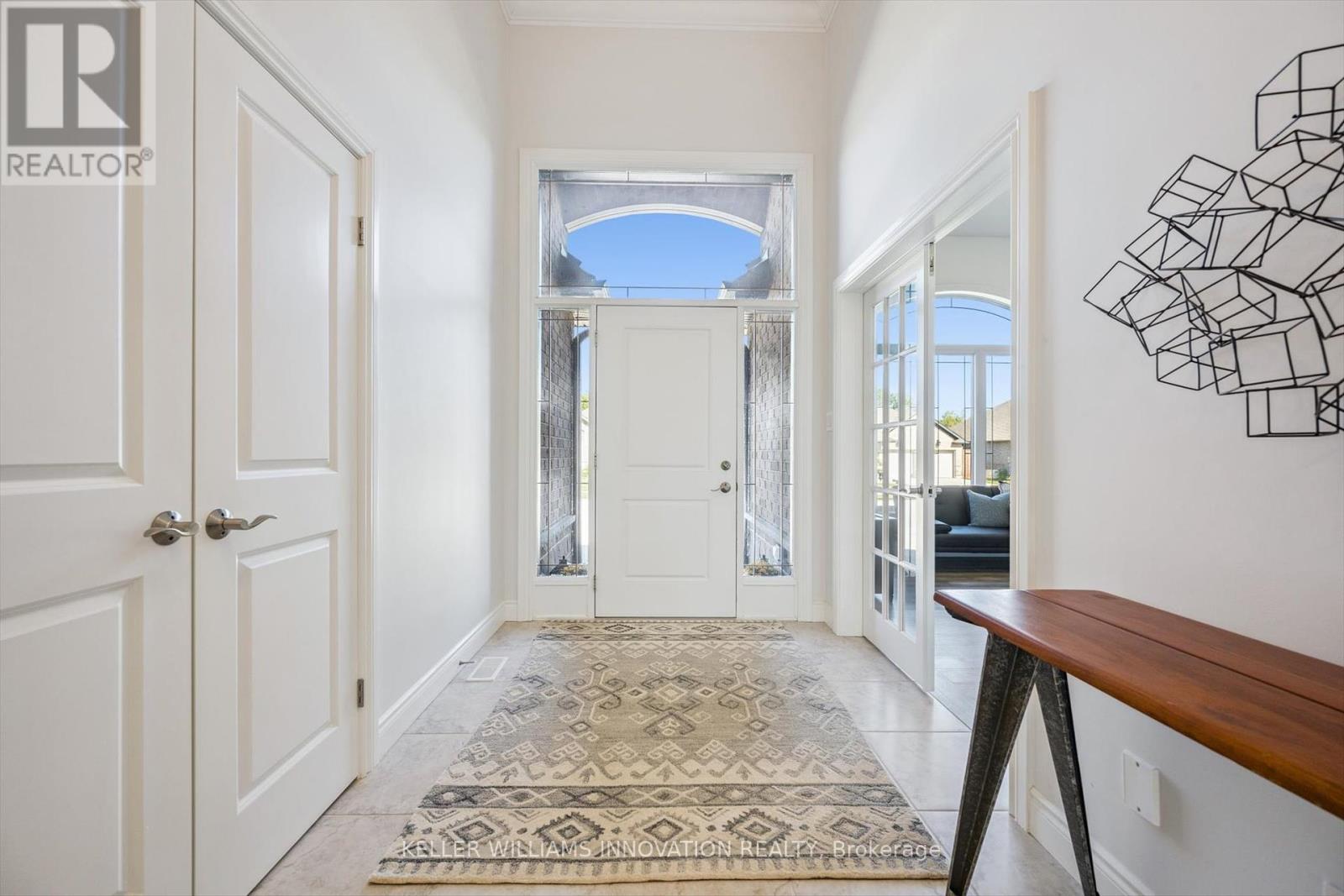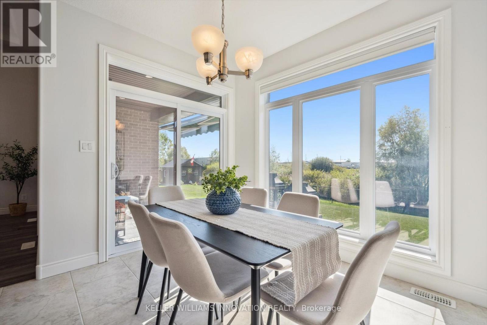Executive bungalow located in the lovely town of Listowel. With over 1,900 sq ft of living space, this modern home has 3 bedrooms and 4 bathrooms - and is move in ready! Adjacent to the front foyer, double French doors lead into the bright front bedroom with big windows, perfect for a home office space or den. Walk past the 2 piece powder room into the open concept great room area. The large modern kitchen has stainless steel appliances and a large island, perfect for hosting guests while you cook. The dinette area has sliding glass doors and large windows looking out in the backyard. The great room has a coffered ceiling with pot lights and hardwood flooring. The spacious primary bedroom has a walk-in closet and a 5 piece bathroom with double sinks, a glass shower door and a freestanding tub. The additional bedroom found on this floor has its own 3 piece ensuite bathroom with walk-in shower. This floor even has a laundry room, no more dragging your clothes downstairs! The basement with extra large windows, is currently being used as an "at home spa" but the seller is agreeable to return the space to an unfinished basement area, ready to be renovated into a rec room, additional bedrooms or office space. The back covered porch is a perfect spot to watch a rain storm or enjoy the summer shade. The backyard backs out onto a pond, with a fence separating the backyard from the green space behind. Here's your opportunity to live on one of the nicest areas in Listowel, close to shopping, Kinsmen Trail and more! (id:51158)