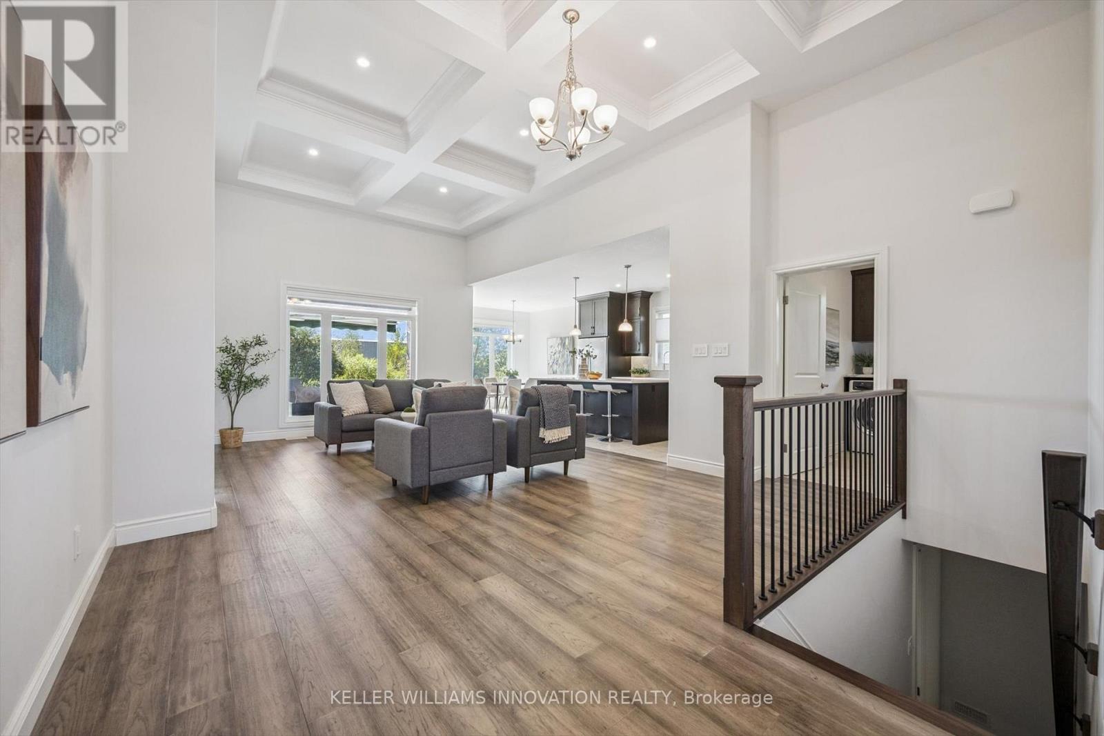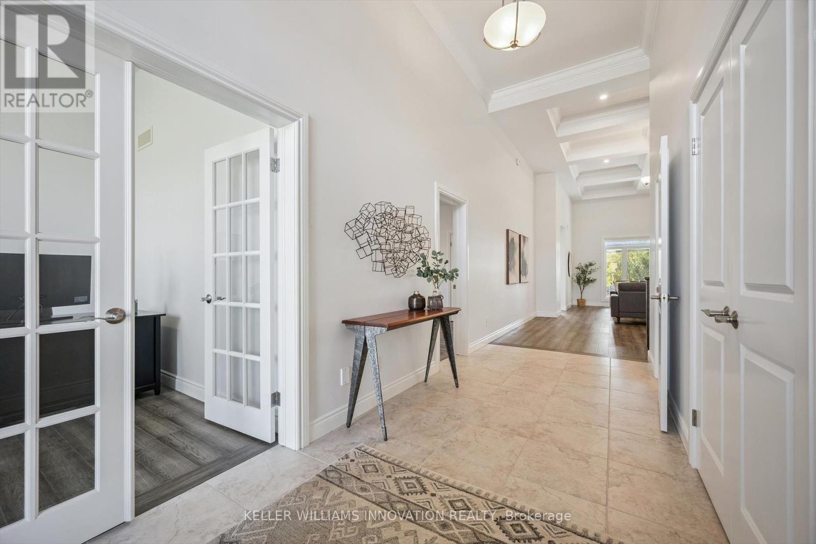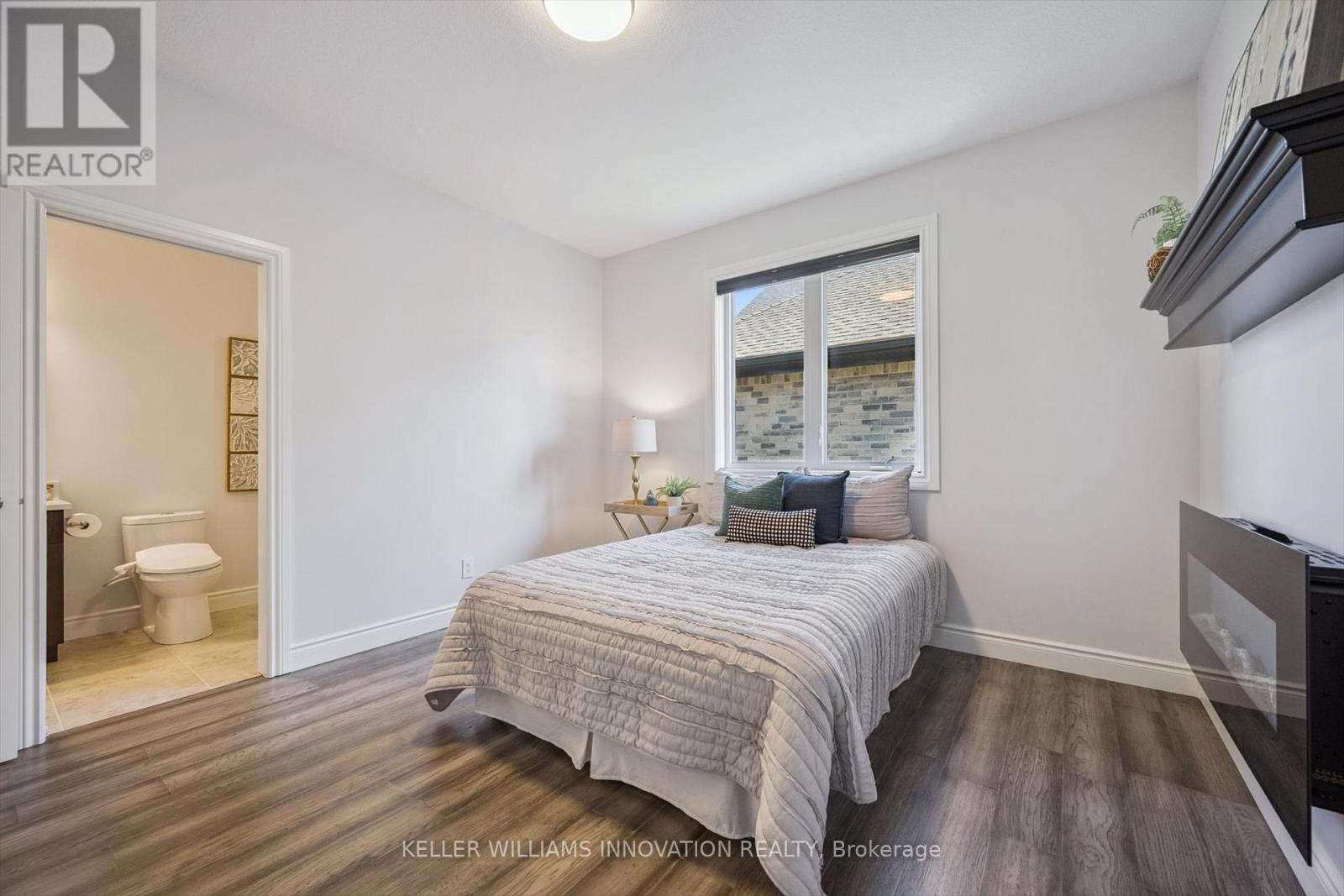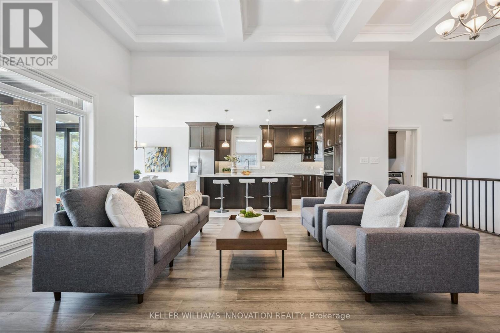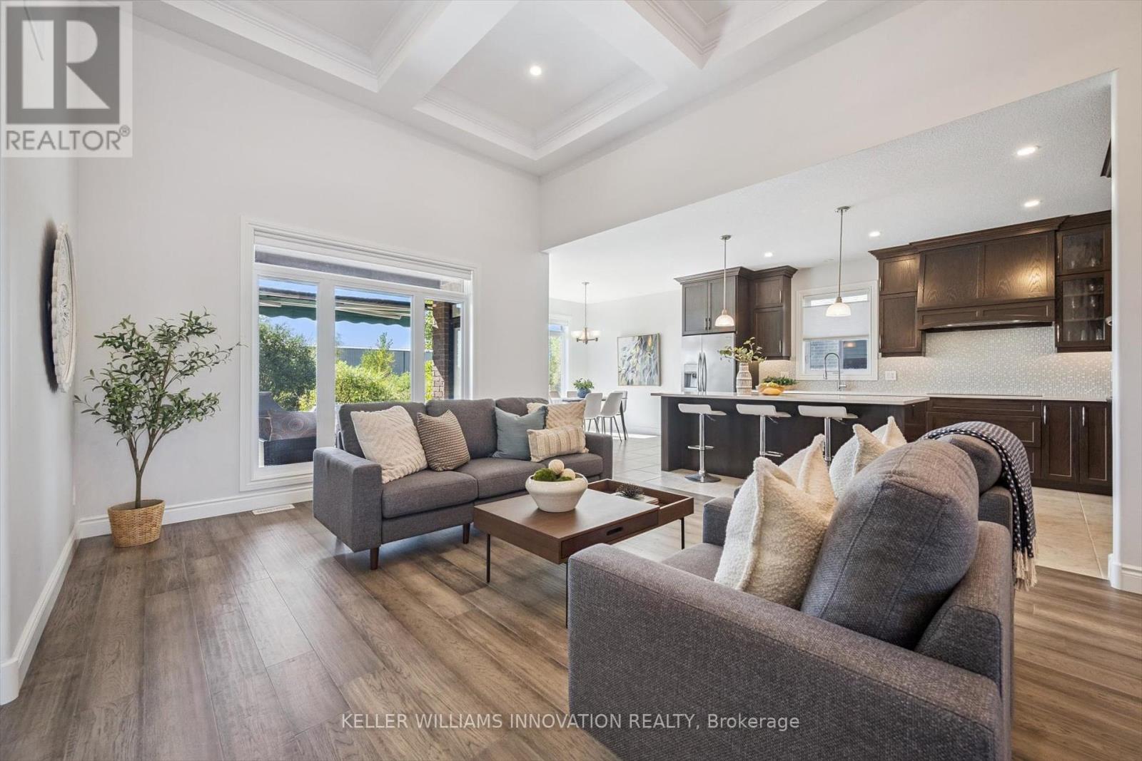 Executive bungalow located in the lovely town of Listowel. With over 1,900 sq ft of living space, this modern home has 3 bedrooms and 4 bathrooms - and is move in ready! Adjacent to the front foyer, double French doors lead into the bright front bedroom with big windows, perfect for a home office space or den. Walk past the 2 piece powder room into the open concept great room area. The large modern kitchen has stainless steel appliances and a large island, perfect for hosting guests while you cook. The dinette area has sliding glass doors and large windows looking out in the backyard. The great room has a coffered ceiling with pot lights and hardwood flooring. The spacious primary bedroom has a walk-in closet and a 5 piece bathroom with double sinks, a glass shower door and a freestanding tub. The additional bedroom found on this floor has its own 3 piece ensuite bathroom with walk-in shower. This floor even has a laundry room, no more dragging your clothes downstairs! The basement with extra large windows, is currently being used as an "at home spa" but the seller is agreeable to return the space to an unfinished basement area, ready to be renovated into a rec room, additional bedrooms or office space. The back covered porch is a perfect spot to watch a rain storm or enjoy the summer shade. The backyard backs out onto a pond, with a fence separating the backyard from the green space behind. Here's your opportunity to live on one of the nicest areas in Listowel, close to shopping, Kinsmen Trail and more! (id:51158)