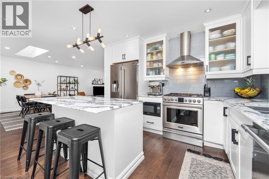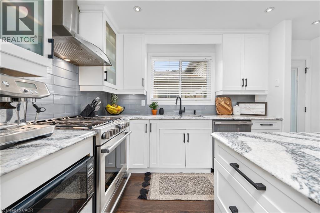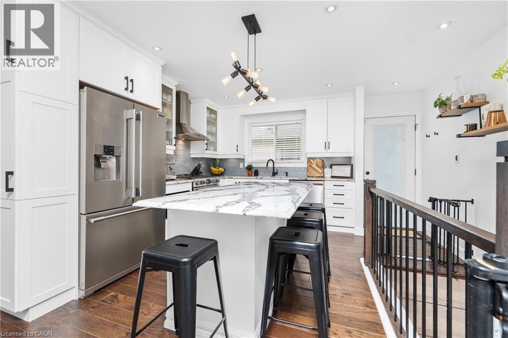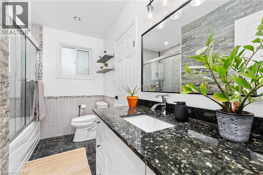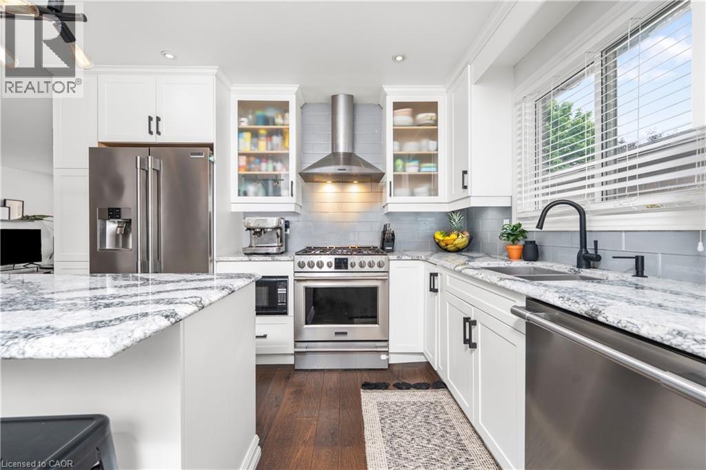 STUNNINGLY UPDATED HOME + BACKING ONTO GREEN SPACE – THIS IS THE ONE!!! This charming detached 4-level backsplit boasts 3 bedrooms, 2 bathrooms, and is located in one of Grimsby’s most sought-after family-friendly neighbourhoods. Backing onto peaceful Pinewood Park and surrounded by mature trees, this beautifully updated home provides the kind of privacy and outdoor connection that’s hard to come by, especially in town. The low-maintenance yard is quiet, easy to care for, and provides direct access to the park—a serene extension of your outdoor space. The main level is gorgeous and has open-concept living and dining areas along with a stunning custom-upgraded kitchen featuring quartz countertops, a large center island with seating, ample storage, and hardwood flooring throughout. The lower level is bright and inviting, featuring large windows that fill the family room with natural light, a cozy gas fireplace, a 3-piece bathroom, and an additional bedroom. The fully finished basement includes a recreation room, office space, and laundry area—providing flexibility for work, play, and relaxation. Step outside to a fully fenced backyard complete with a newer deck and garden shed—perfect for summer gatherings or quiet evenings outdoors. With over 2,100 square feet of finished living space, Cresa separate entrance to the raised lower level (ideal for multi-generational living or a potential accessory suite), and proximity to schools, shopping, and the QEW, this home blends comfort, style, and convenience effortlessly. Set on a quiet crescent backing onto green space, this is truly the perfect family home—peaceful, practical, and ready for you to make it your own. (id:51158)