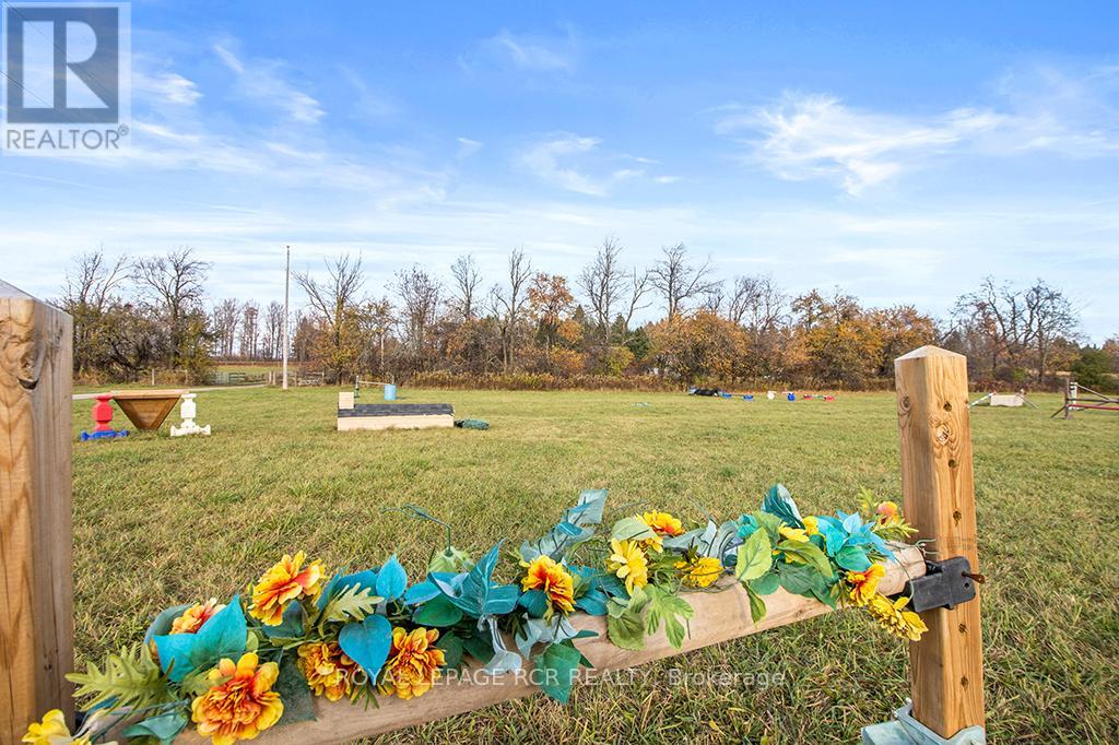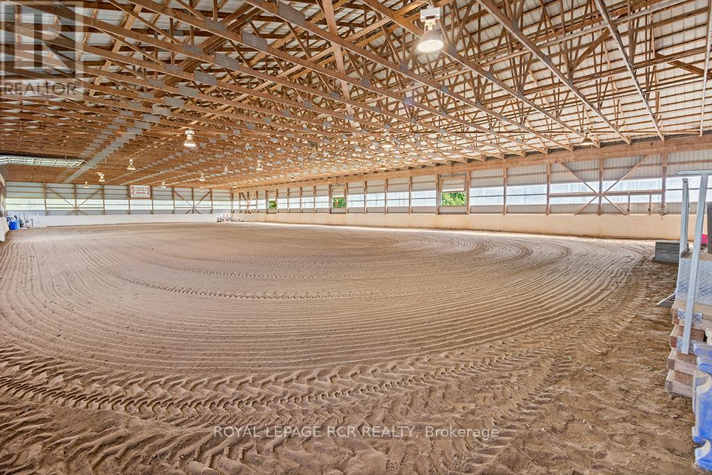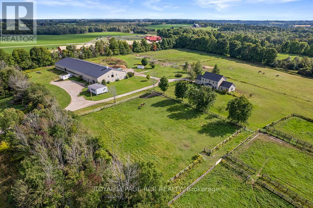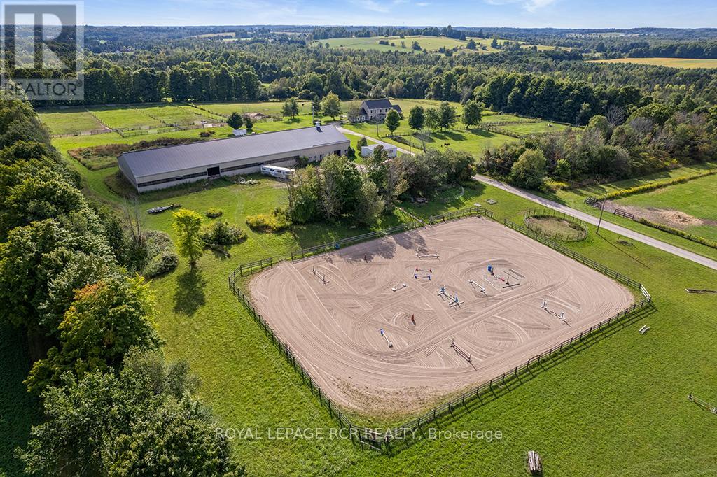 Turnkey 49-Acre Equestrian Facility - Ready for an experienced horse professional to take the reins! Currently operating as a pleasure riding & eventing facility, this property is fully equipped for boarding or training in any discipline, featuring 10 lush paddocks with frost-free hydrants and power for heated troughs, an insulated 20-stall barn with tack room (3-piece bath), feed room, wash stall, and hay loft. Train year-round in the attached 76' x 160' indoor arena with operable windows and premium Whoa Dust footing, or take advantage of the outdoor jumping field, 150' x 200' sand ring, and grass dressage field. Two productive hayfields add income potential or self-sufficiency, while a 23' x 30' heated portable with hydro can serve as an office, guest quarters, or studio. The 2,877 sq. ft. home (1997) offers a sophisticated, comfortable base of operations. Wide-plank, hand-scraped hickory hardwood and cathedral ceilings set the tone, while the chefs kitchen with Wolf cooktop and leathered granite counters flows into the dining area and Great Room with beamed cathedral ceiling. Flexible accommodation includes a main-floor bedroom with ensuite and three additional bedrooms upstairs, plus renovated bathrooms with heated floors and towel warmers. The primary retreat features a dressing room, walk-in closet with organizers, and a spa-inspired ensuite. An unspoiled walk out lower level offers even more possibilities. Updates designed for efficiency and peace of mind include a 2024 cold-climate heat pump with propane backup, a Generac generator to power farm essentials, and durable Goodfellow siding. The Pella windows are also energy efficient. Located minutes from Angelstone, Meadowlarke North, and Palgrave, this property is an entrepreneurs dream for a fully operational equestrian boarding or training business. (id:51158)