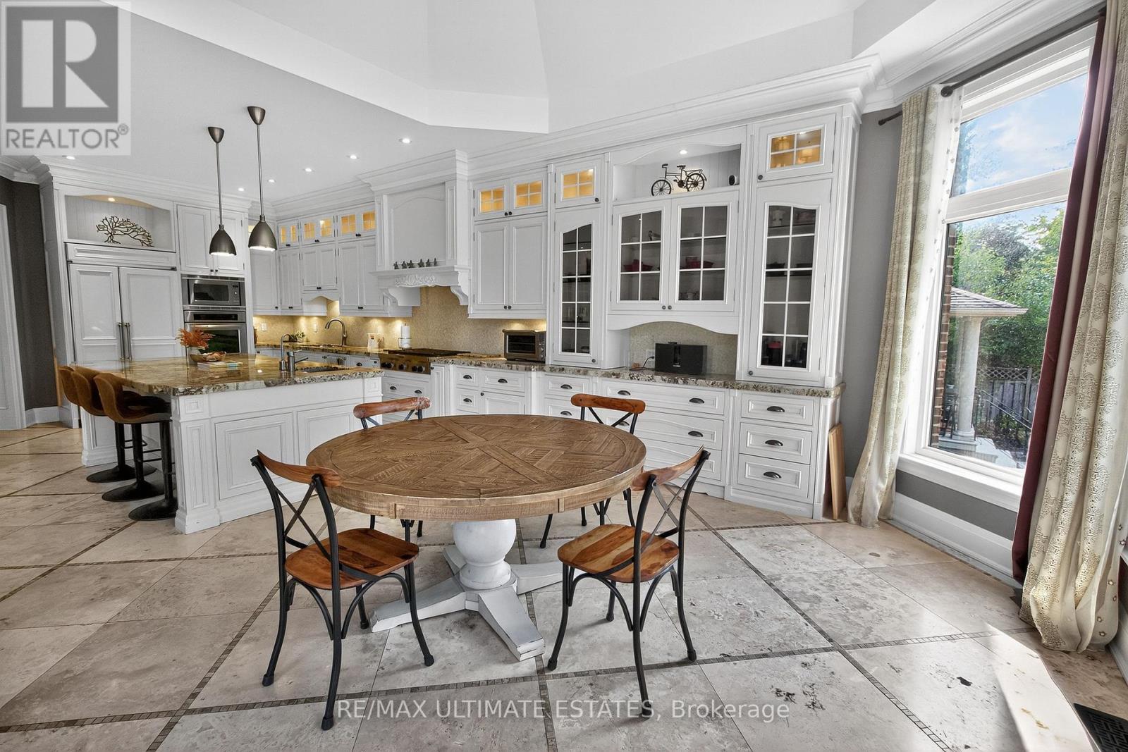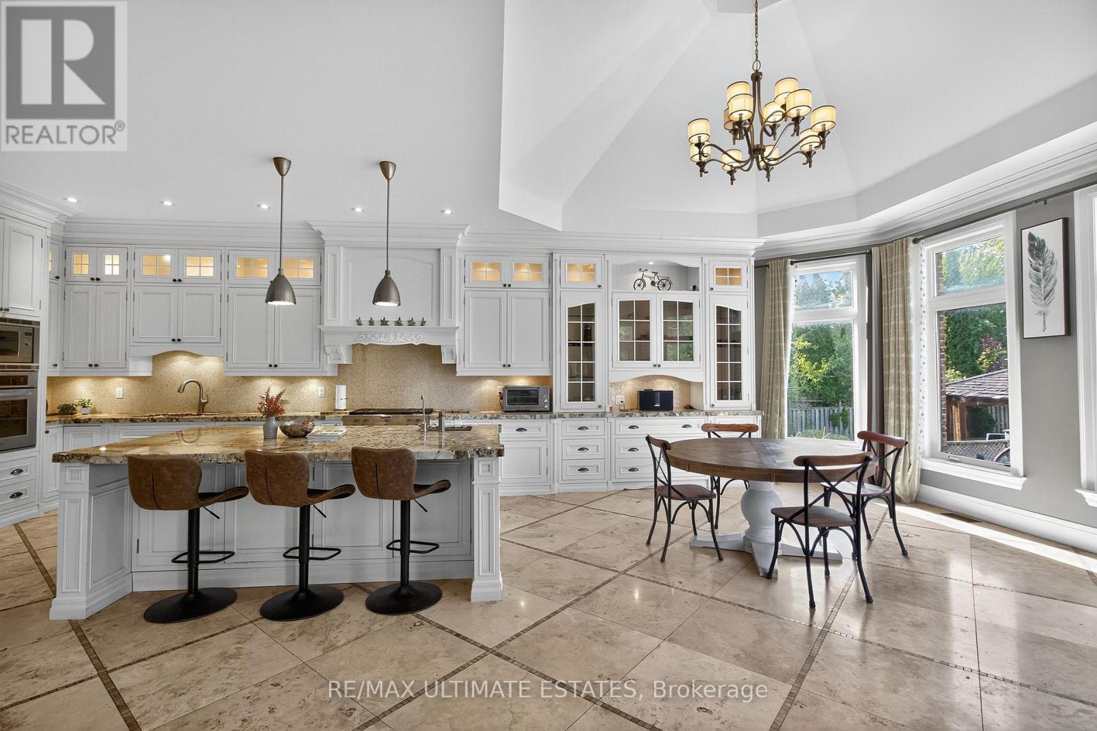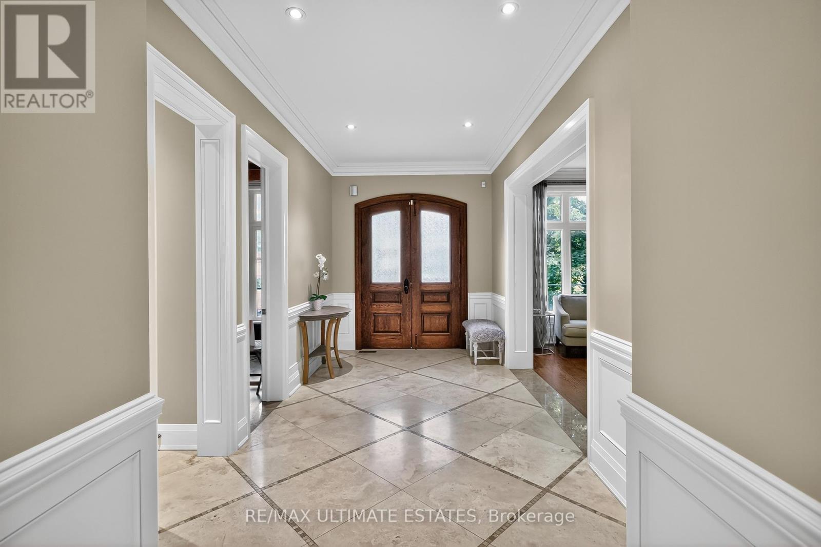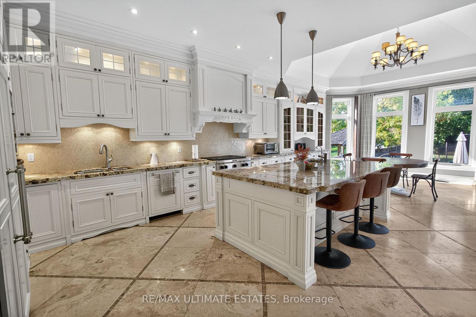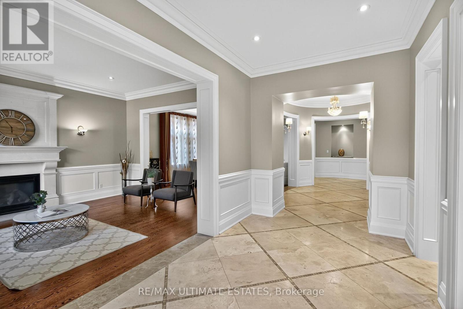 A distinguished South Richvale address on a rare 45 x 240 lot. The natural stone façade and sunlit south exposure lead to interiors featuring ten-foot main and nine-foot second ceilings, refined millwork and wainscoting, limestone, marble, and wide-plank hardwood, coffered details, a skylight, and three fireplaces. A bespoke chefs kitchen centres on an oversized island, twin sinks, granite counters, under cabinet lighting and integrated appliances, with a breakfast area stepping to a private terrace and an estate depth garden. A quiet main floor office with custom built-ins. The finished walk-up lower level offers above-grade windows, a generous L-shaped recreation space, a guest bedroom and a three-piece bath. Walk to Yonge Street and minutes to Highway 407. (id:51158)