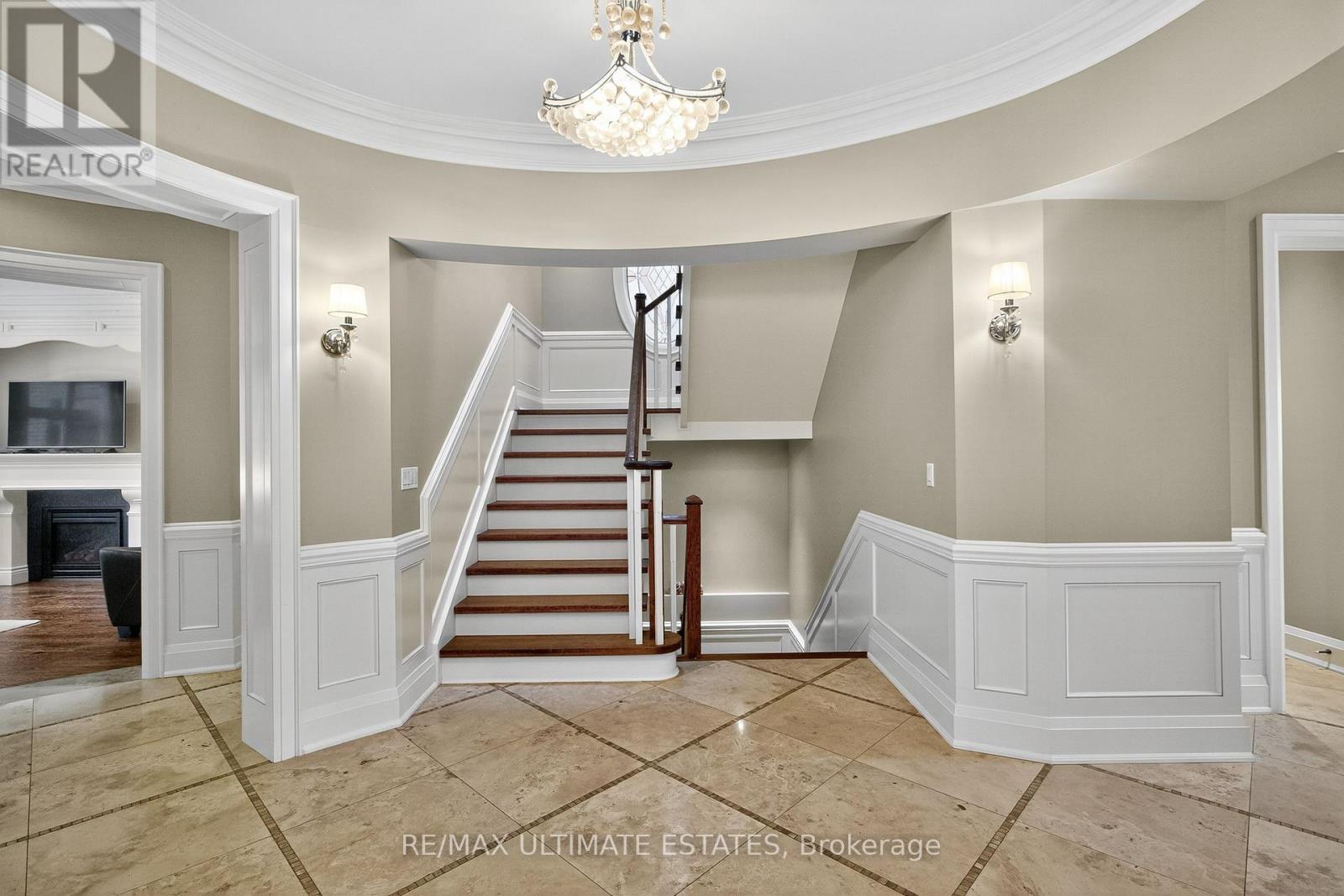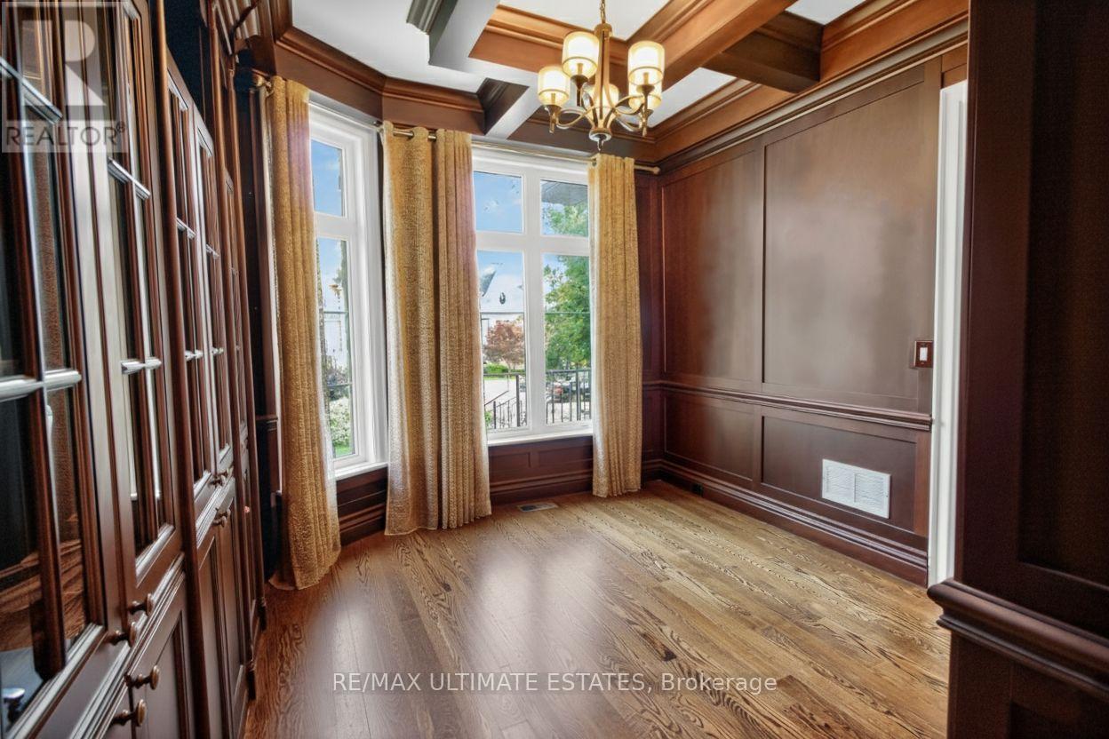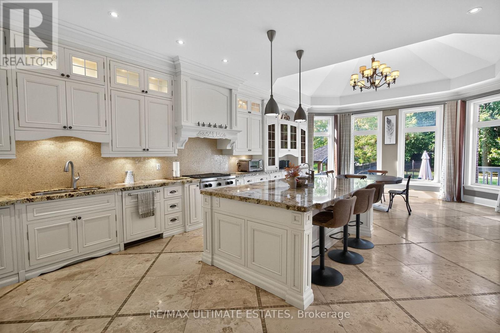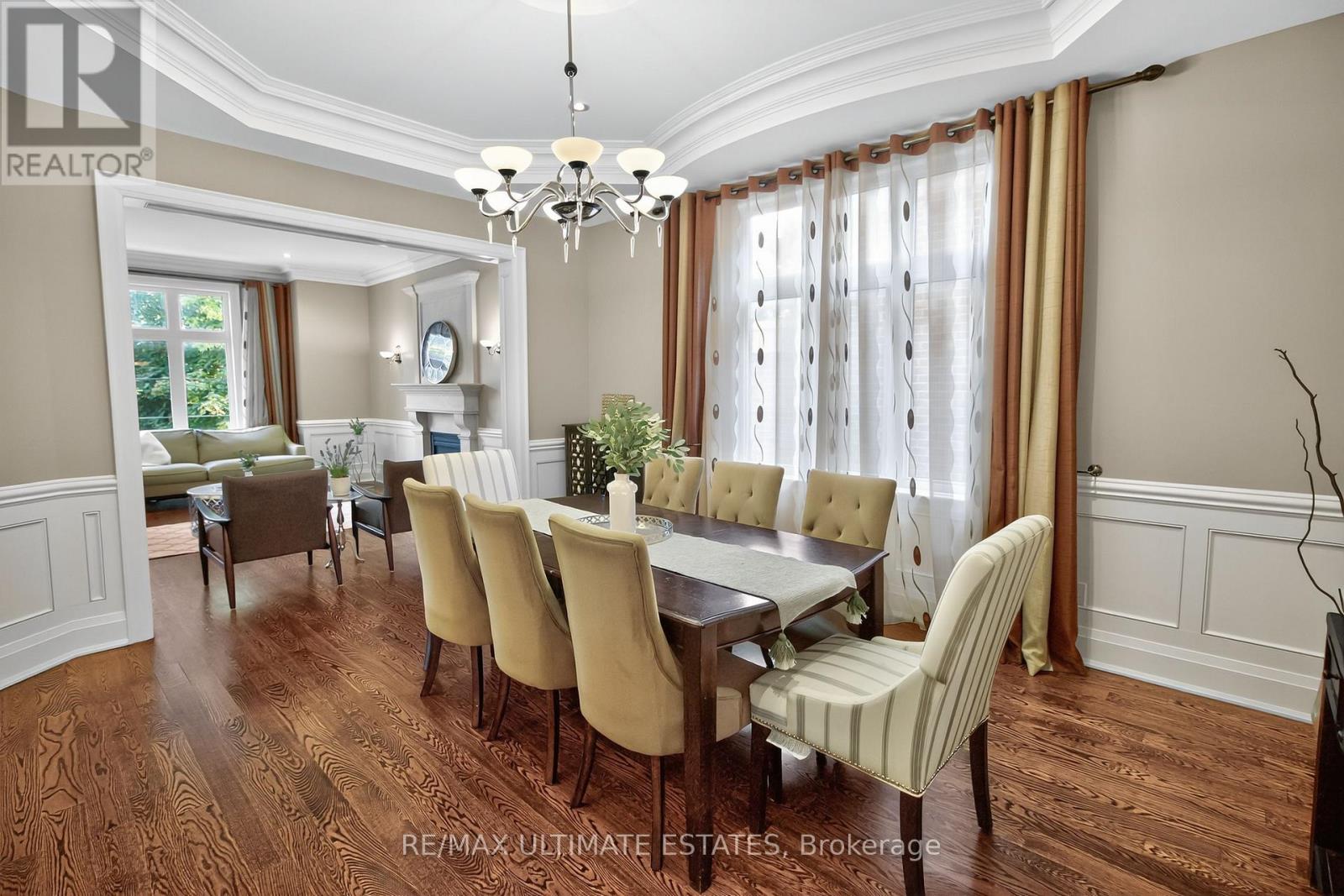 A distinguished South Richvale address on a rare 45 x 240 lot. The natural stone façade and sunlit south exposure lead to interiors featuring ten-foot main and nine-foot second ceilings, refined millwork and wainscoting, limestone, marble, and wide-plank hardwood, coffered details, a skylight, and three fireplaces. A bespoke chefs kitchen centres on an oversized island, twin sinks, granite counters, under cabinet lighting and integrated appliances, with a breakfast area stepping to a private terrace and an estate depth garden. A quiet main floor office with custom built-ins. The finished walk-up lower level offers above-grade windows, a generous L-shaped recreation space, a guest bedroom and a three-piece bath. Walk to Yonge Street and minutes to Highway 407. (id:51158)