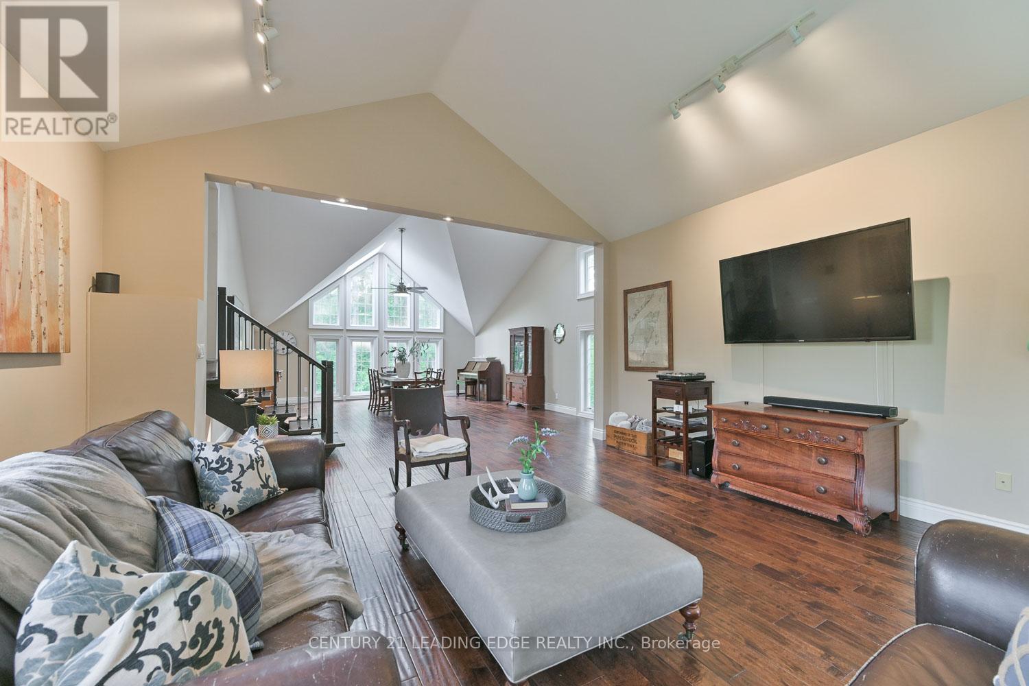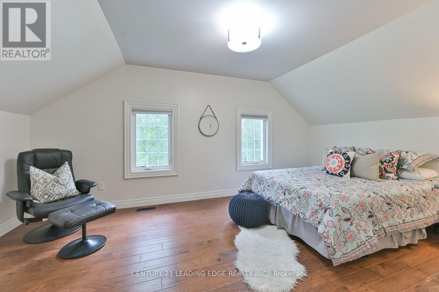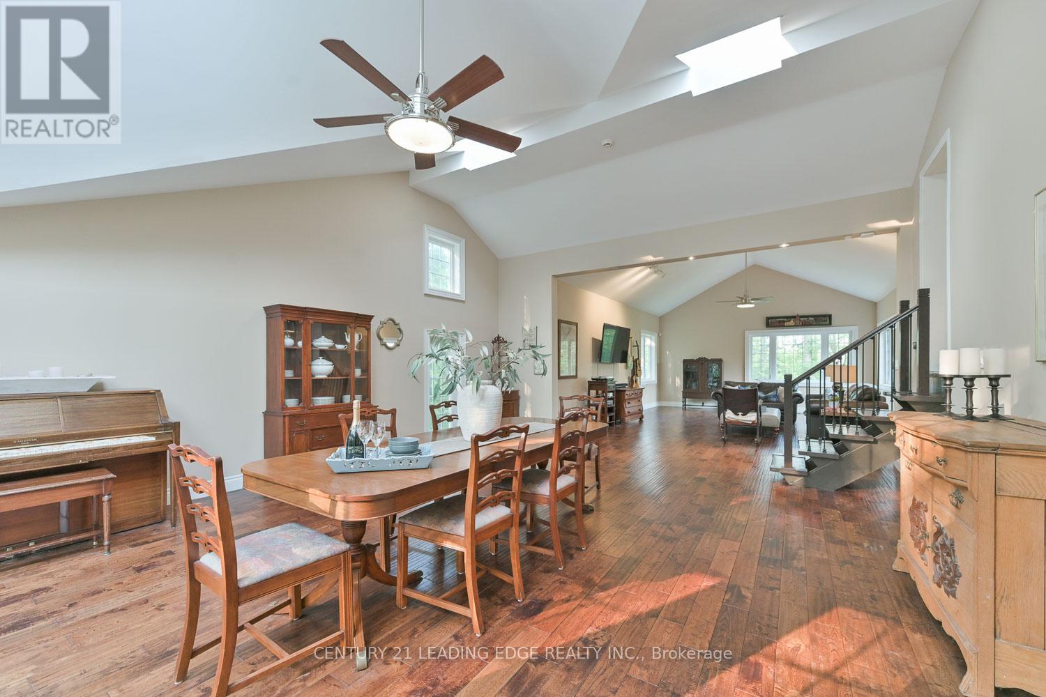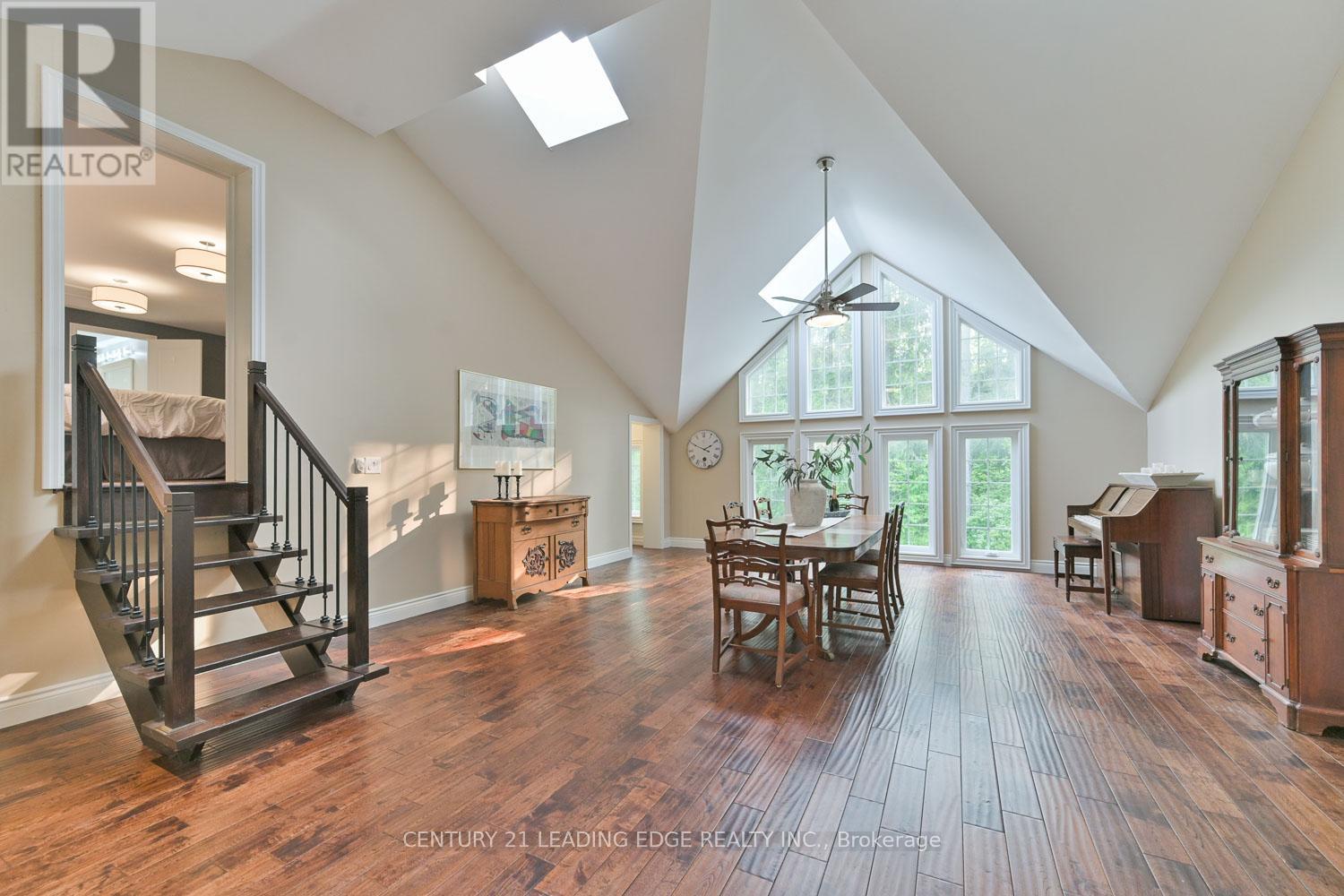 Nestled on 8.33 acres of pristine, unspoiled land, this exceptional one of a kind property offers the tranquility of Muskoka with the convenience of suburban living. Lovingly restored in 2014, the home blends timeless modern finishes with a layout ideal for growing or multi-generational families. Every detail of the exterior was updated during the restoration including the roof, soffits, eaves, windows, and exterior doors. The expansive grounds include a 10' x 10' storage shed, a separate 20' x 30' heated workshop, and a charming chicken coop for those with a passion for hobby farming. A 1000 sq ft. detached guest house which is just a short stroll from the main home features a sitting area with kitchenette, bathroom and a 2nd floor loft, a cozy and private space for visitors. Inside, the main home features a unique and versatile layout with dual staircases and distinct wings that flow seamlessly together. The main floor of this 3800 sq ft home boasts an open-concept chef-inspired kitchen overlooking the living and dining areas. Adding more convenience to this space is a powder room and laundry room with additional storage. The upper level offers a stunning great room and dining area with soaring cathedral ceilings and architecturally inspired windows that flood the space with natural light. The luxurious primary suite is a true retreat, featuring a spa-inspired ensuite and walk-out to a glass-enclosed balcony. With a total of 5 bedrooms & 5 bathrooms this property provides plenty of room for the whole family. Enjoy chilly evenings in the enclosed sunroom or take in panoramic views from the multi-level deck overlooking the rolling greenery and serene surroundings. Whether you're entertaining, gardening, or simply unwinding, this property offers the perfect backdrop. (id:51158)