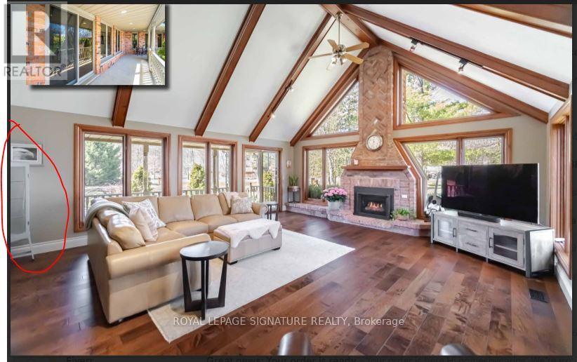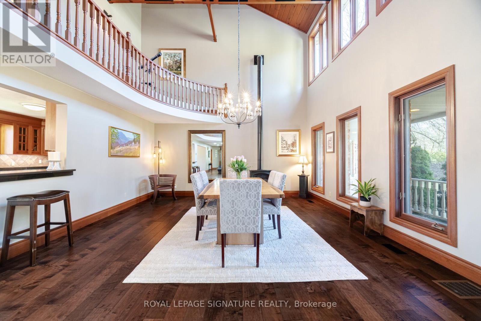 Stunning, One-of-a-Kind Architectural Masterpiece!!!This exceptional country residence captivates from the very first glance with unmatched curb appeal and distinctive design. A true architectural gem, the home showcases custom exposed timber and iron construction, offering a dramatic welcome with soaring 26-foot ceilings in the foyer & great room. Anchoring the space is a striking gas stove and dramatic staircase just two of of the many bespoke touches throughout. The chefs kitchen is a showstopper in its own right, thoughtfully positioned between the great room & the expansive rear deck. Designed for seamless indoor-outdoor living, its perfect for entertaining on any scale, from intimate gatherings to grand events incorporating the sparkling heated saltwater pool, hot tub, deck, & beyond. Prepare to be awestruck yet again in the window-walled family room, where vaulted ceilings rise above a stunning floor-to-ceiling brick fireplace. Here, panoramic views of the beautifully manicured grounds, create a tranquil yet breathtaking backdrop for family gatherings. The main floor offers 2 bedrooms, including an expansive primary suite that feels like a private retreat. It features a luxurious 5-piece spa-style bath w/glass shower enclosure, a generous walk-in closet & direct access to the deck through a private walkout. Additional features include renovated 3 piece bath & laundry rm. The sweeping, open-riser circular staircase leads to the equally impressive upper level. Here you'll find two spacious bedrooms, a sleek and modern 3-piece bathroom, and a versatile loft-style den or studio area. The open-to-below wrap around balcony offers a front-row seat to the craftsmanship of the handcrafted artistry that defines this remarkable home. For the hobbyist or DIY, an incredible bonus awaits: heated 1,200 sq ft- accessory building, fully equipped with a 3-piece bathroom. This versatile space is ideal for a workshop, studio- home gym, the possibilities are endless! (id:51158)