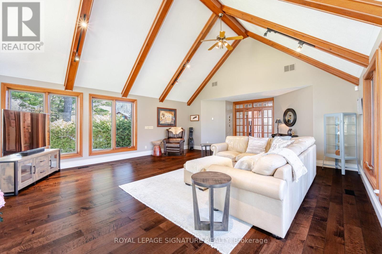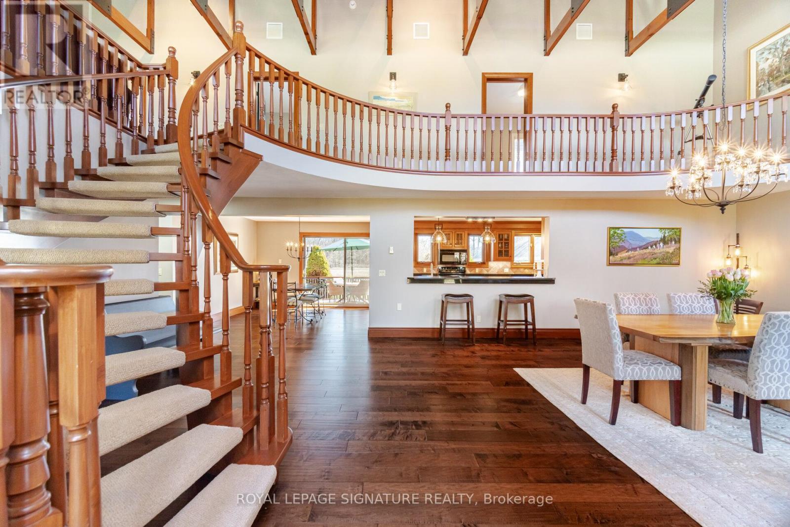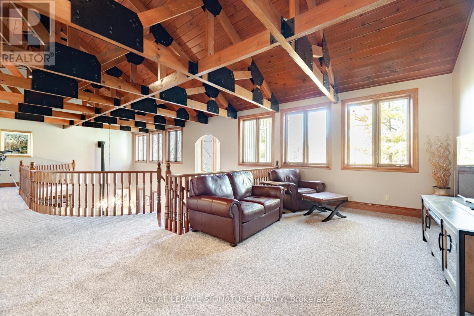 Stunning Country Estate !!! This One-of-a-Kind Masterpiece captivates from the very first glance with unmatched curb appeal and it's distinctive design. A true architectural gem, the home showcases custom exposed timber and iron construction, offering a dramatic welcome with soaring 26-foot ceilings in the foyer & great room. Anchoring the space is a striking gas stove and dramatic staircase just two of of the many bespoke touches throughout. The chefs kitchen is a showstopper in its own right, thoughtfully positioned between the great room & the expansive rear deck. Designed for seamless indoor-outdoor living, its perfect for entertaining on any scale, from intimate gatherings to grand events incorporating the sparkling heated saltwater pool, hot tub, deck, & beyond. Prepare to be awestruck yet again in the window-walled family room, where vaulted ceilings rise above a stunning floor-to-ceiling brick fireplace. Here, panoramic views of the beautifully manicured grounds, create a tranquil yet breathtaking backdrop for family gatherings. The main floor offers 2 bedrooms, including an expansive primary suite that feels like a private retreat. It features a luxurious 5-piece spa-style bath w/glass shower enclosure, a generous walk-in closet & direct access to the deck through a private walkout. Additional features include renovated 3 piece bath & laundry rm. The sweeping, open-riser circular staircase leads to the equally impressive upper level. Here you'll find two spacious bedrooms, a sleek and modern 3-piece bathroom, and a versatile loft-style den or studio area. The open-to-below wrap around balcony offers a front-row seat to the craftsmanship of the handcrafted artistry that defines this remarkable home. For the hobbyist or DIY, an incredible bonus awaits: heated 1,200 sq ft- accessory building, fully equipped with a 3-piece bathroom. This versatile space is ideal for a workshop, studio- home gym, the possibilities are endless! (id:51158)
