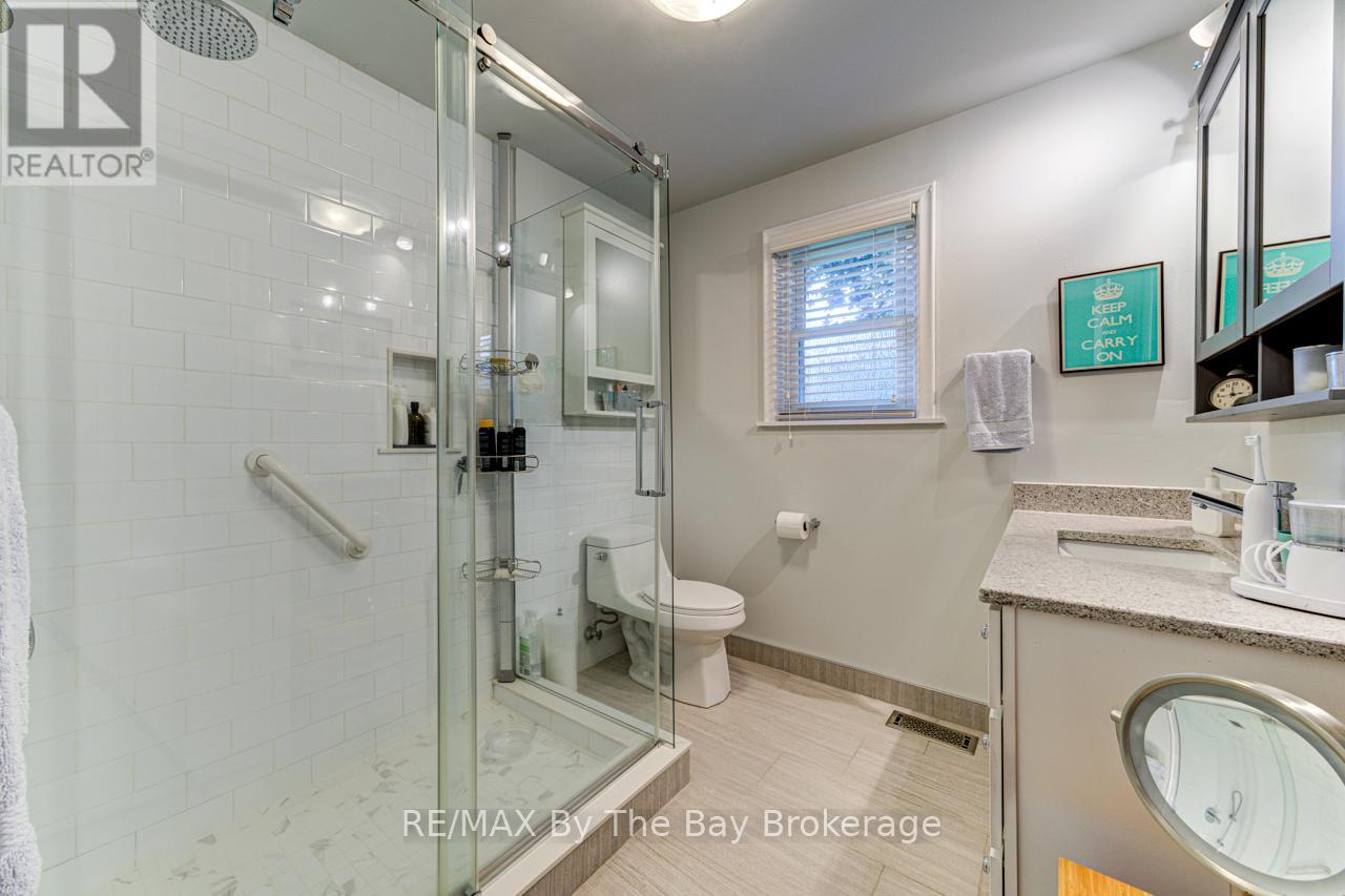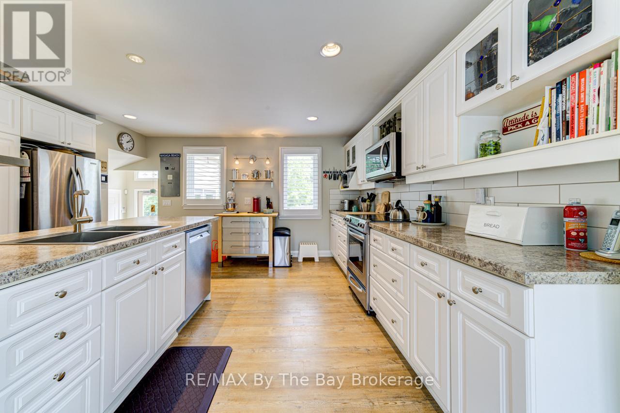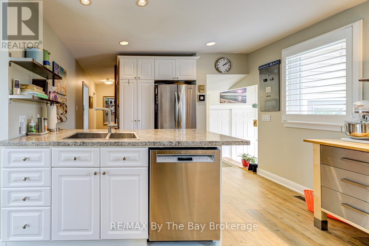One block to the Sandy Beaches of Wasaga! 2500 sqft 4 bedroom, 3 Bathroom , 2 Story home on a 100x145 double lot with frontages on Mosley and Old Mosley Streets. This unique home in the original Village of Wasaga is meticulously maintained with beautiful landscaping, sprinkler system & wrought iron fencing. The interior features a large updated kitchen, modern flooring, ample natural light from large windows with California shutters and a walkout to the oversized front deck with glass railings. The upper level features a large Master suite with a private deck, 3pc bath, and huge walk-in closet with window. Office/bedroom on upper level. The lower level has a wet bar, 2 large living areas, 3pc bath, and sauna. Laundry room with pantry. Gas fireplace along with forced air gas furnace. Central air. Detached 24'x24' Garage with large loft. 2 Garden sheds. Official Plan allows for Development opportunities such as: Semi/ Townhouse/ Apartment/ Accessory Dwelling Unit. In proximity to Beach Area 1. (id:51158)