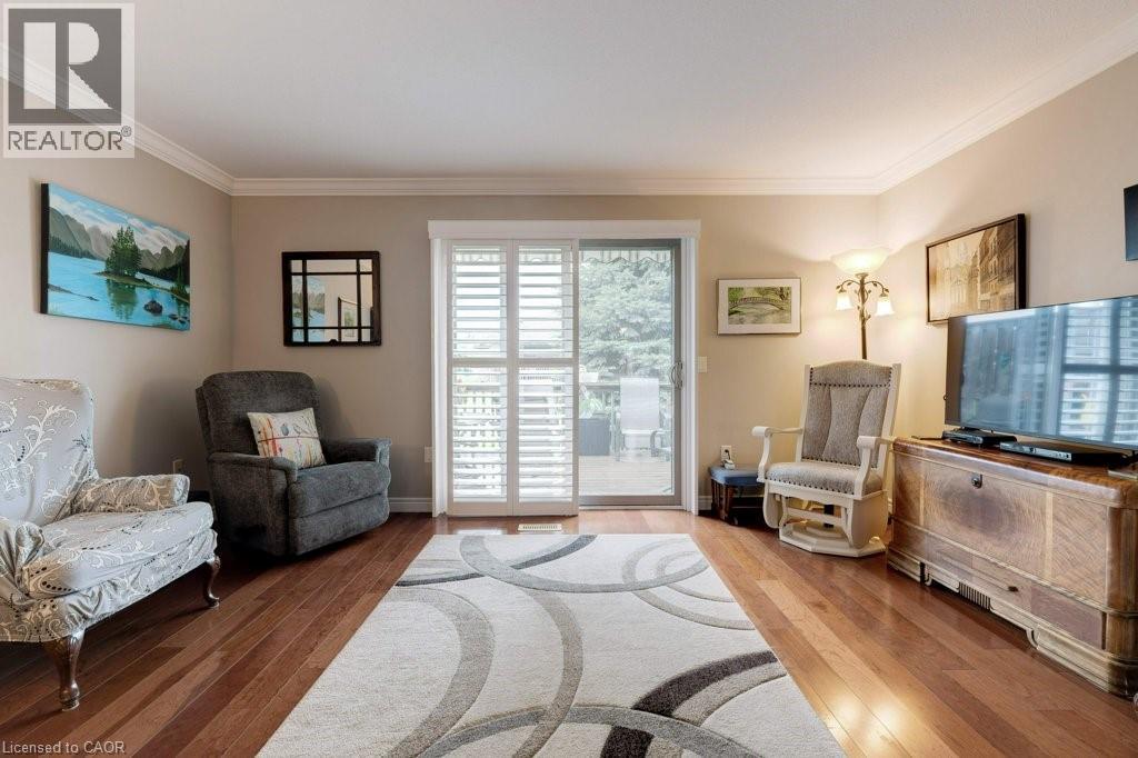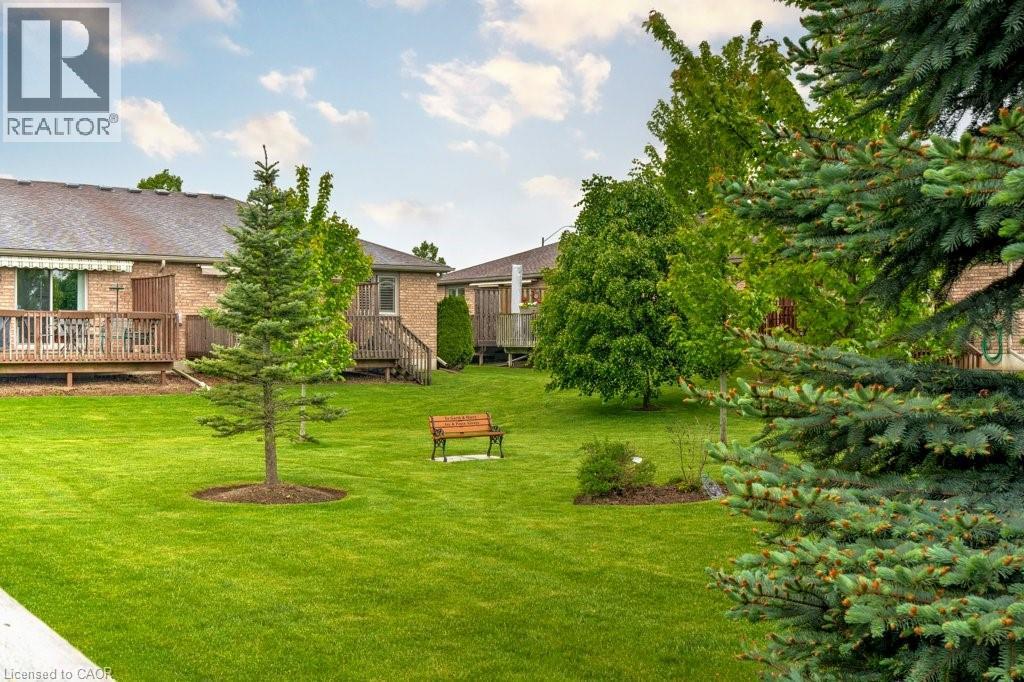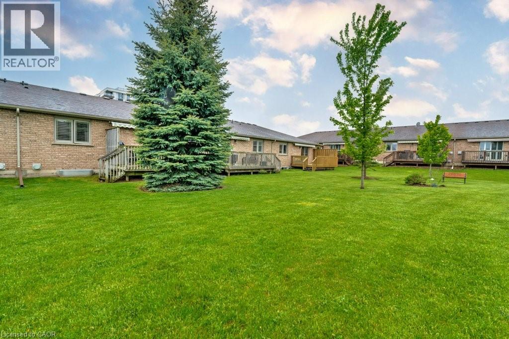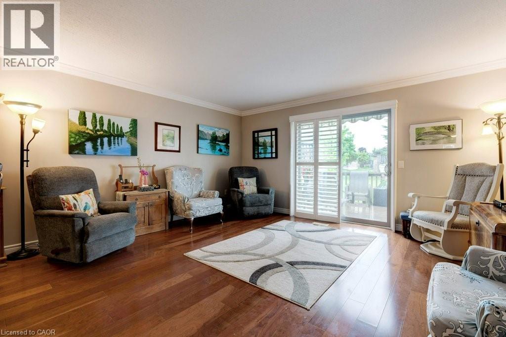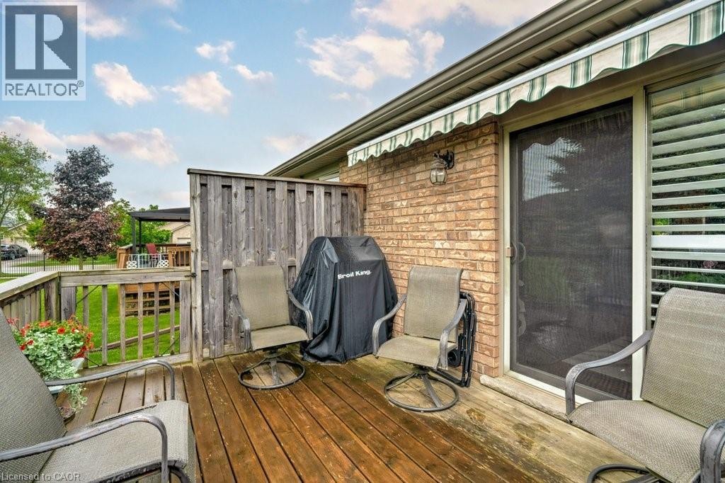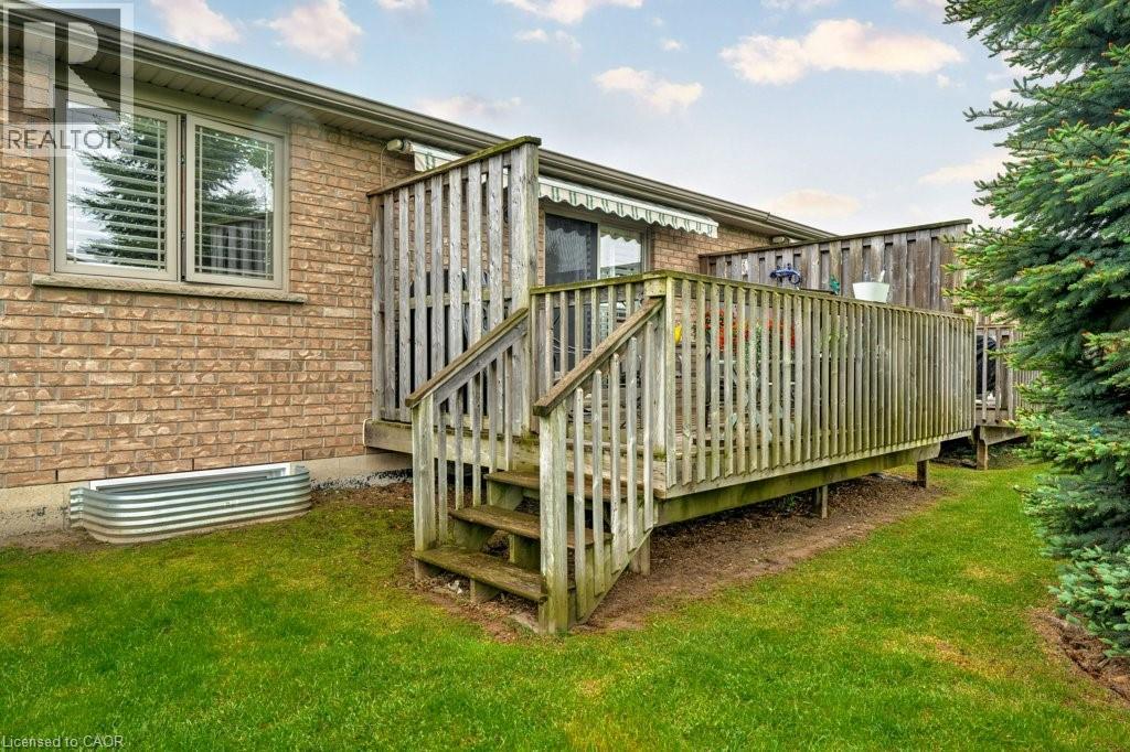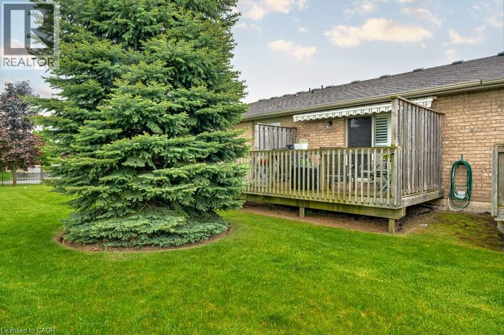 PRICED TO SELL! A Tranquil Bungalow Townhome Backing Onto Greenspace. This lovingly maintained 2+1 bedroom townhome with a den offers effortless, low-maintenance living in a desirable, well-managed condo community. Set within beautifully landscaped grounds, this home invites you to relax and unwind without the hassle of outdoor upkeep. Step inside to a bright, open-concept main floor featuring hardwood floors and California shutters throughout. The open living room leads to a private deck through sliding glass doors complete with a remote-controlled awning, overlooking a peaceful greenbelt and mature trees. It’s the perfect setting for your morning coffee or an evening glass of wine. The stylish kitchen is equipped with stainless steel appliances, including a newer stove and a fridge with built-in ice maker, pot lights with dimmers, a raised breakfast bar with seating, and a handy pantry. Just off the kitchen, the generous dining area easily accommodates a full-size table and hutch for all your entertaining needs. The main floor primary bedroom is impressively sized, with room for a California King bed, two wardrobes, and nightstands. It features dual closets, a ceiling fan, and direct access to a 4-piece semi-ensuite bath. The second bedroom also enjoys great natural light, a ceiling fan and california shutters. A convenient laundry closet on the main floor, houses a brand-new washer. Downstairs, you’ll find a finished basement with an additional bedroom (featuring egress windows), a gas fireplace, and a private den/office with French doors, ideal for guests or working from home. The 3-piece bathroom includes a glass shower enclosure. Additional highlights include ample basement storage, a water softener, reverse osmosis system, and a recently updated furnace and AC. If you're looking for easy living in a quiet, friendly community close to everything Brantford has to offer, this is the one. (id:51158)