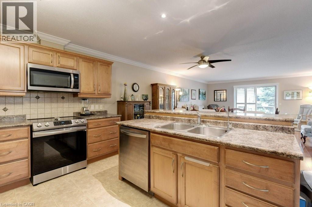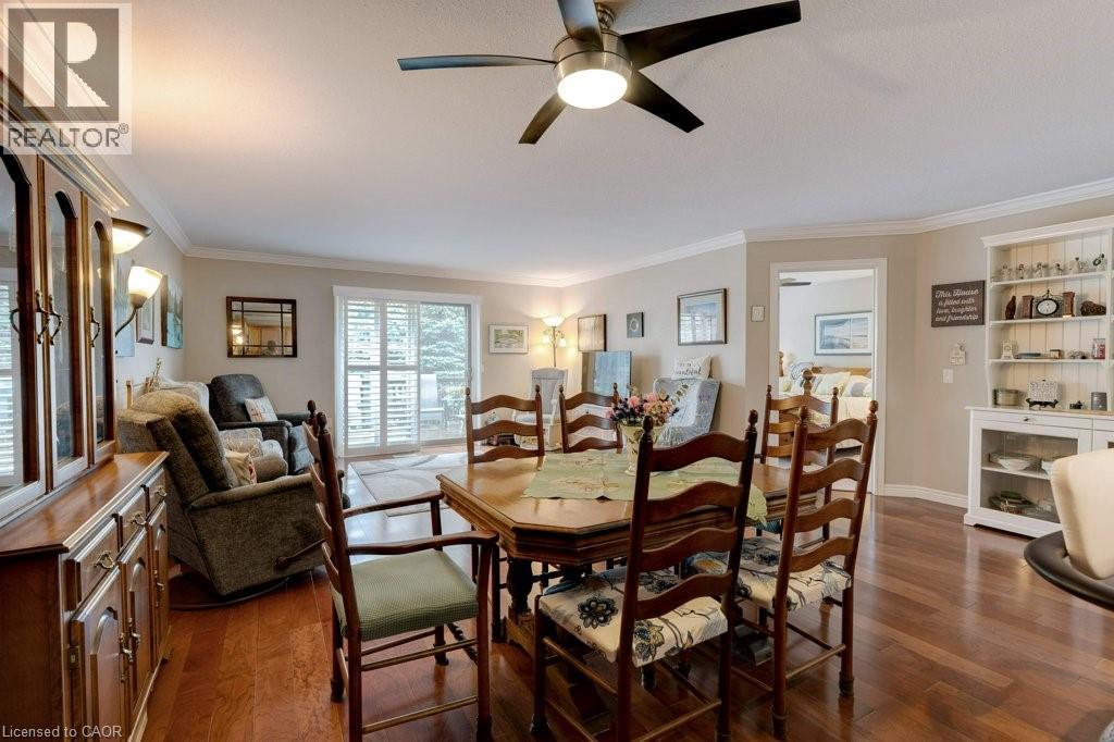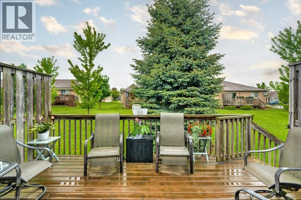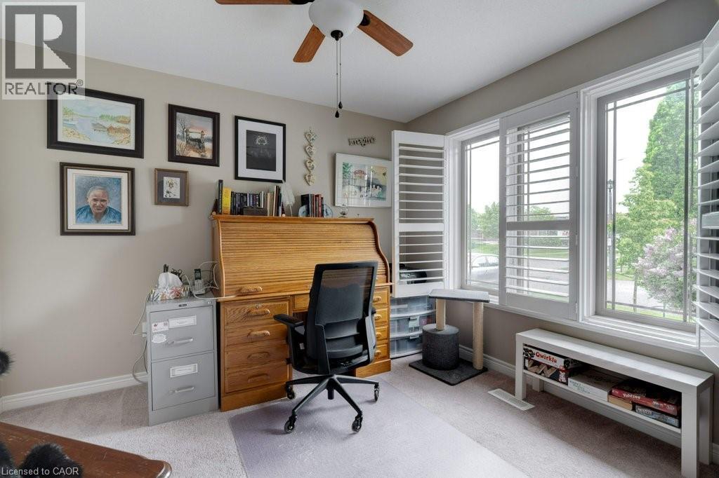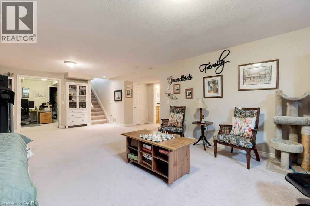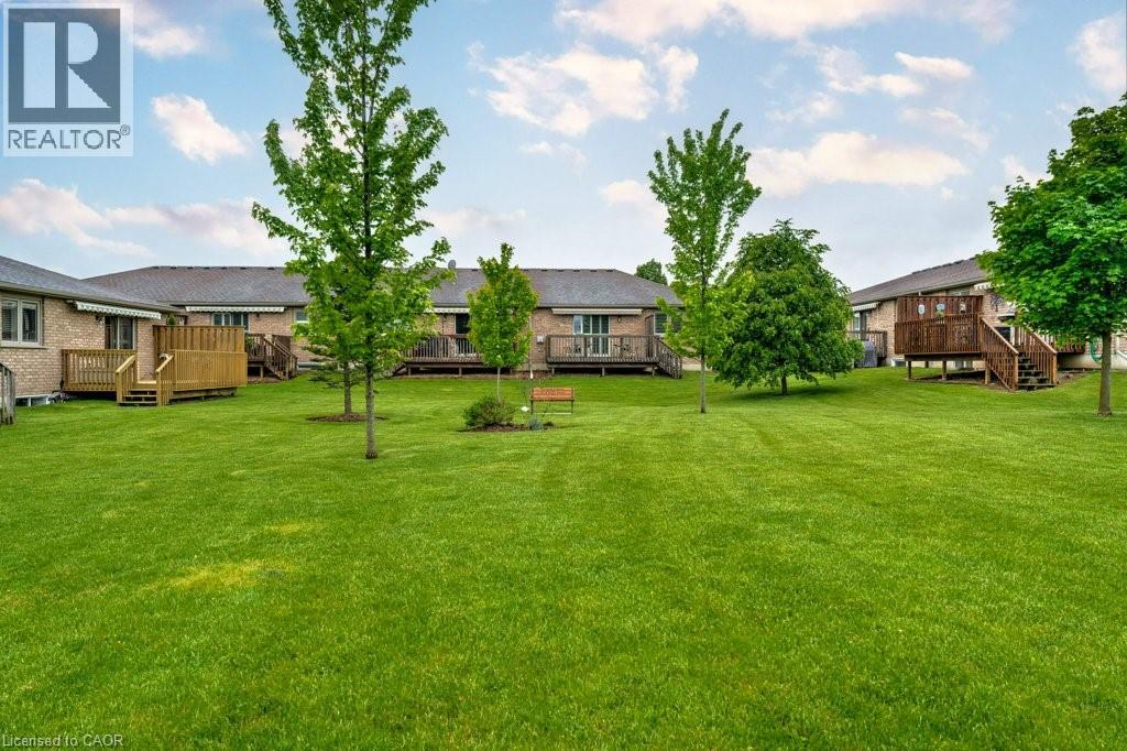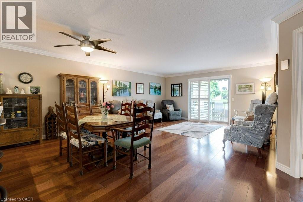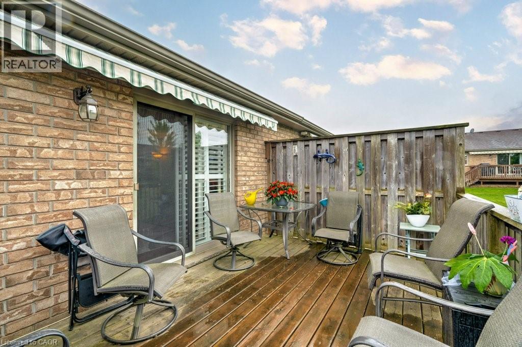 PRICED TO SELL! A Tranquil Bungalow Townhome Backing Onto Greenspace. This lovingly maintained 2+1 bedroom townhome with a den offers effortless, low-maintenance living in a desirable, well-managed condo community. Set within beautifully landscaped grounds, this home invites you to relax and unwind without the hassle of outdoor upkeep. Step inside to a bright, open-concept main floor featuring hardwood floors and California shutters throughout. The open living room leads to a private deck through sliding glass doors complete with a remote-controlled awning, overlooking a peaceful greenbelt and mature trees. It’s the perfect setting for your morning coffee or an evening glass of wine. The stylish kitchen is equipped with stainless steel appliances, including a newer stove and a fridge with built-in ice maker, pot lights with dimmers, a raised breakfast bar with seating, and a handy pantry. Just off the kitchen, the generous dining area easily accommodates a full-size table and hutch for all your entertaining needs. The main floor primary bedroom is impressively sized, with room for a California King bed, two wardrobes, and nightstands. It features dual closets, a ceiling fan, and direct access to a 4-piece semi-ensuite bath. The second bedroom also enjoys great natural light, a ceiling fan and california shutters. A convenient laundry closet on the main floor, houses a brand-new washer. Downstairs, you’ll find a finished basement with an additional bedroom (featuring egress windows), a gas fireplace, and a private den/office with French doors, ideal for guests or working from home. The 3-piece bathroom includes a glass shower enclosure. Additional highlights include ample basement storage, a water softener, reverse osmosis system, and a recently updated furnace and AC. If you're looking for easy living in a quiet, friendly community close to everything Brantford has to offer, this is the one. (id:51158)