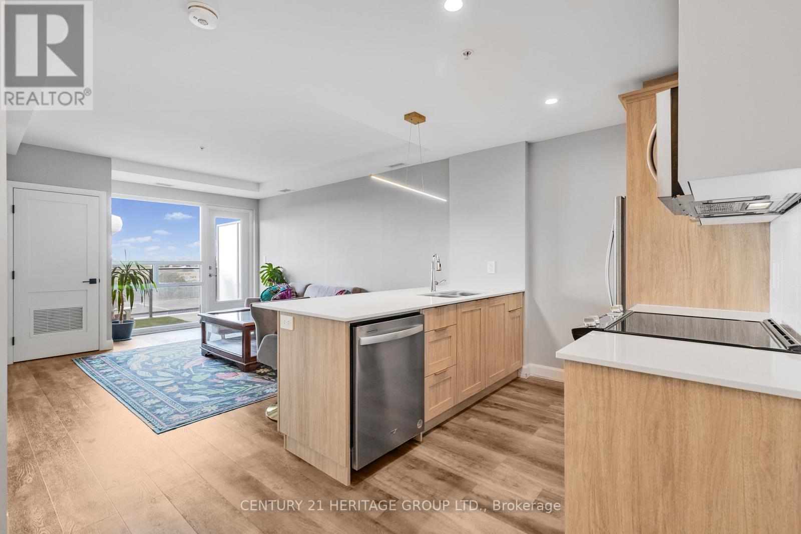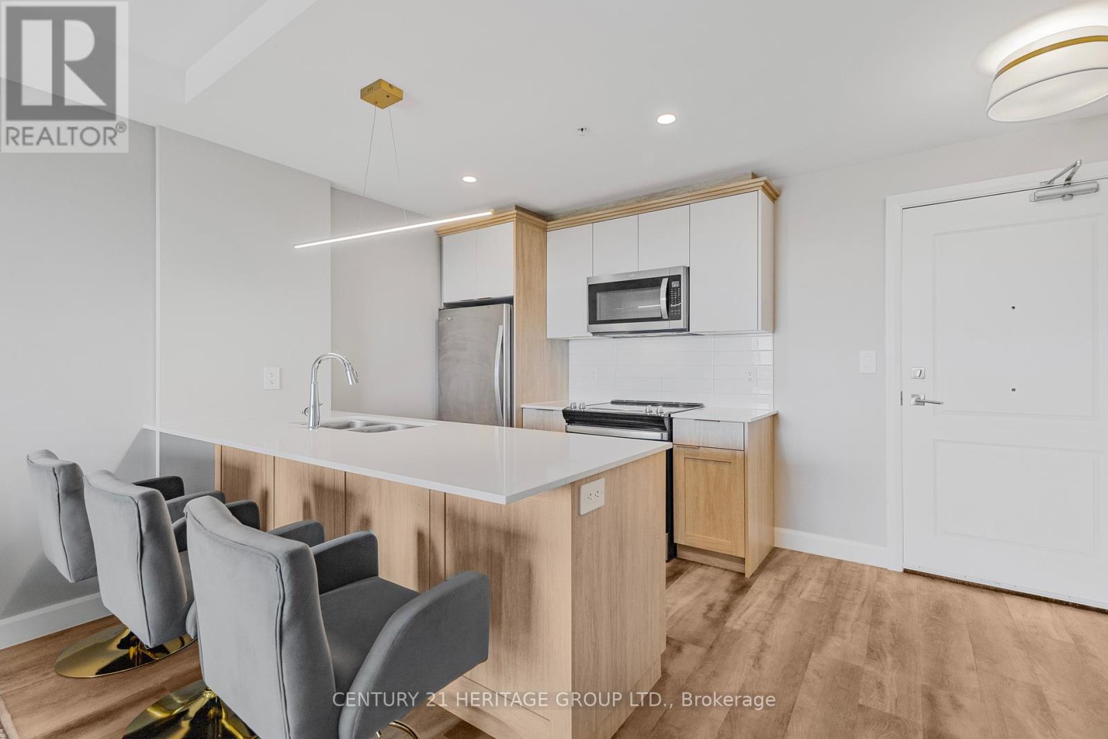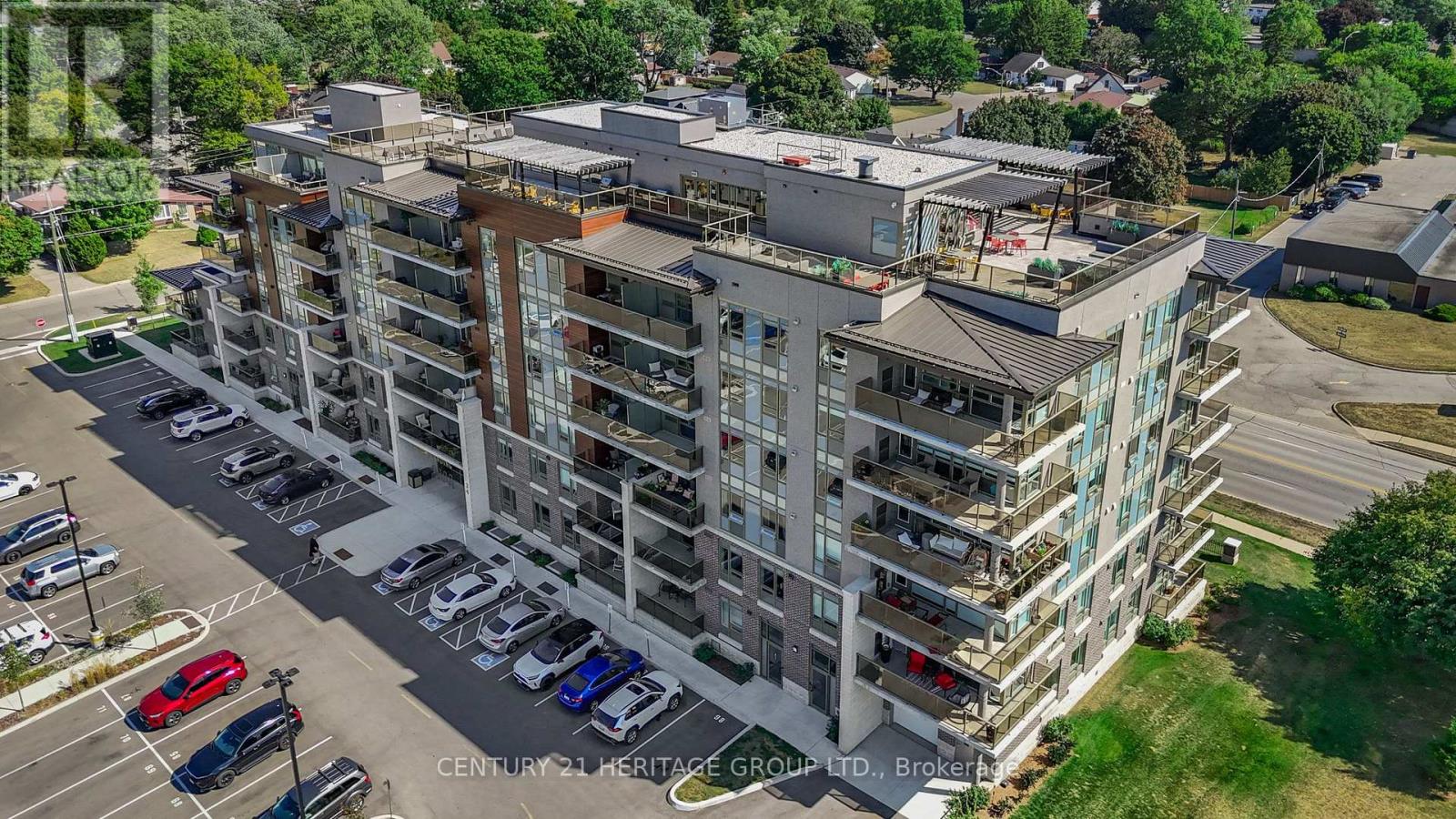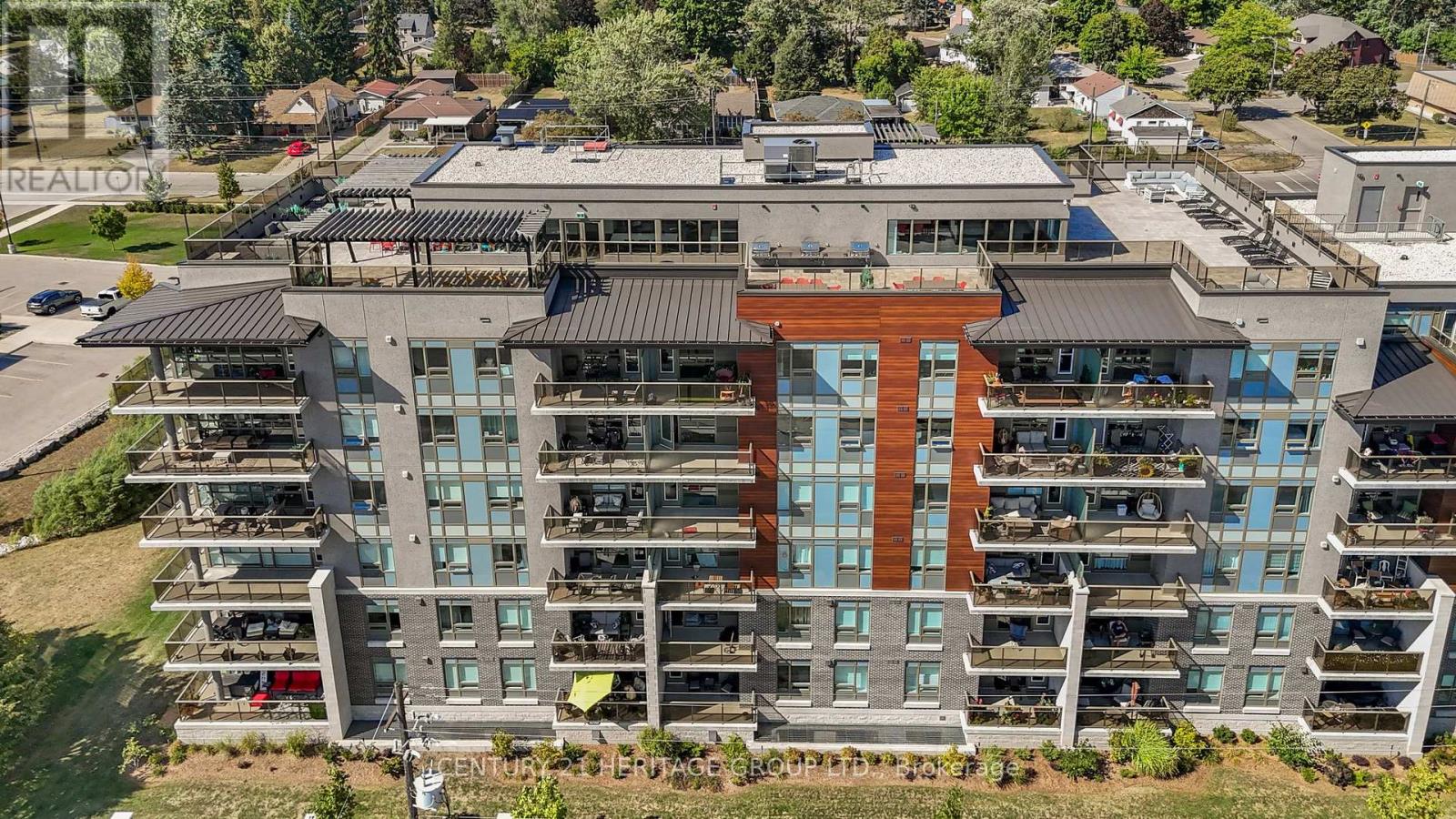$364.78 MonthlyWelcome to this beautiful one-bedroom unit located on the sixth and top floor of the sought-after condo community The Landing in Brantford. This bright, modern suite combines style, comfort, and accessibility in a thoughtfully designed open-concept space. Featuring the upgraded 'Globe Trotter' package; this unit's kitchen has sleek shaker-style cabinetry, quality upgraded appliances, and tasteful finishes throughout. The spacious bathroom has an accessible layout, perfect for those using walkers or wheelchairs. Wide doorways throughout the unit further enhance ease of movement and add to the overall sense of space and luxury. Enjoy quiet mornings or relaxing evenings on your private balcony, with no upstairs neighbours and peaceful views from the top floor. Natural light radiates in, creating a warm and inviting atmosphere throughout. The Landing Condominiums offers a full range of amenities, including a rooftop terrace with panoramic views and BBQs, a cozy library for quiet afternoons, a hidden speakeasy-style lounge for entertaining, a kid's play area, and a modern fitness centre with premium equipment. Ideally located close to shops, restaurants, and essential services, with convenient access to major highways for easy commuting. Whether you're just starting out, downsizing, or investing, this is low-maintenance living in a welcoming community offering the perfect blend of luxury and practicality. Schedule your private showing today and experience life at The Landing. 1 Owned Parking & Locker (id:51158)