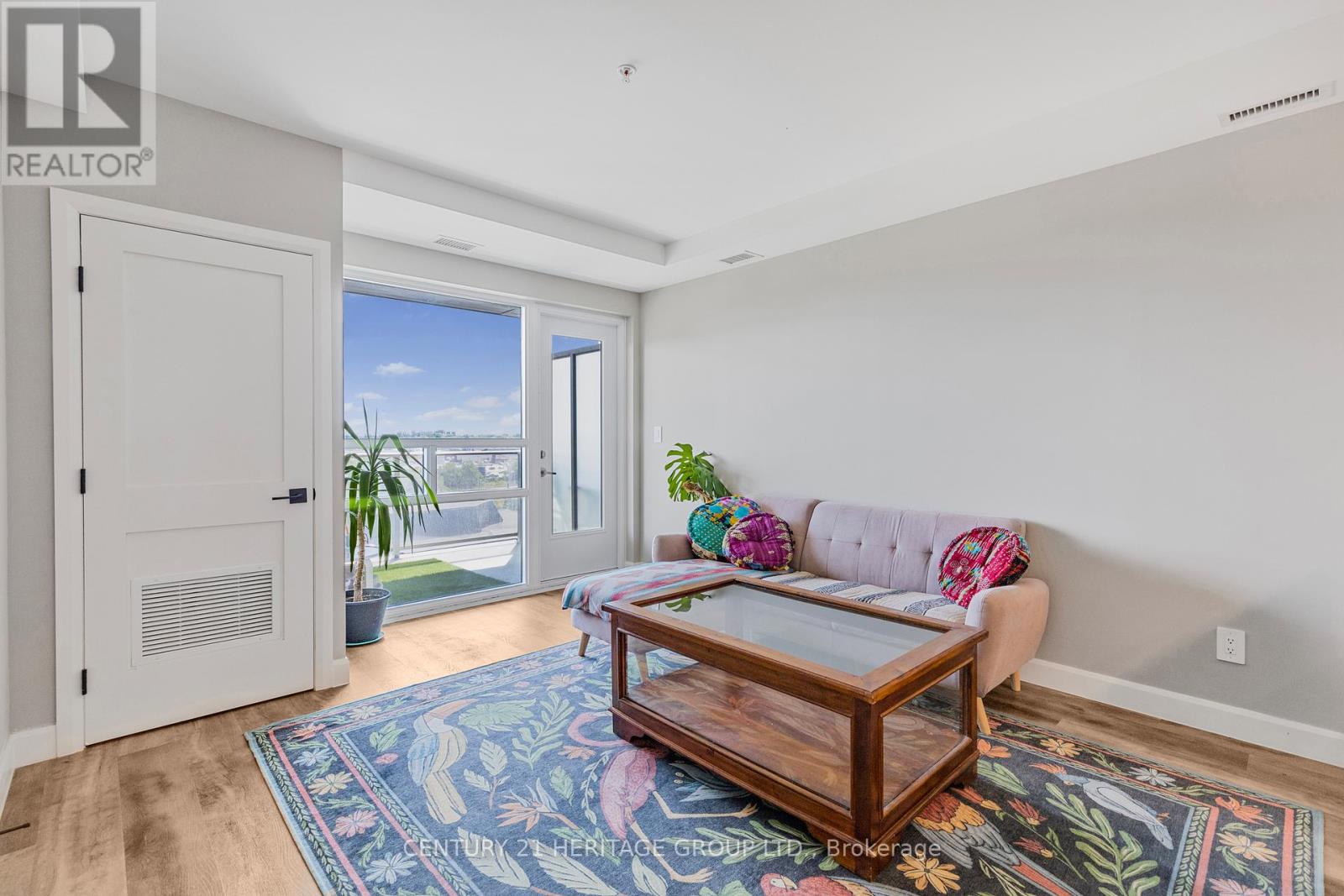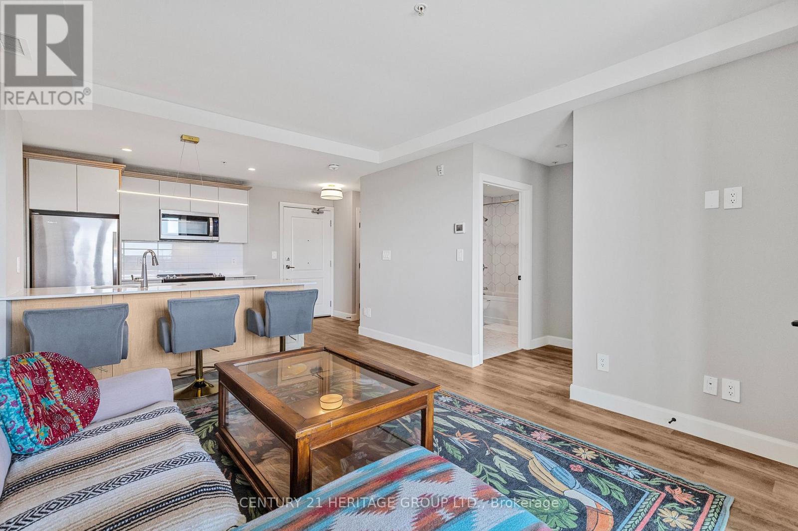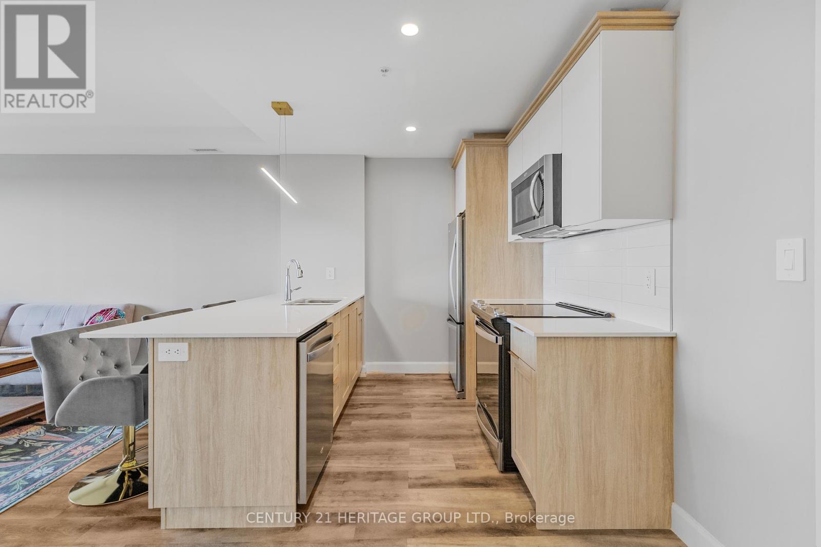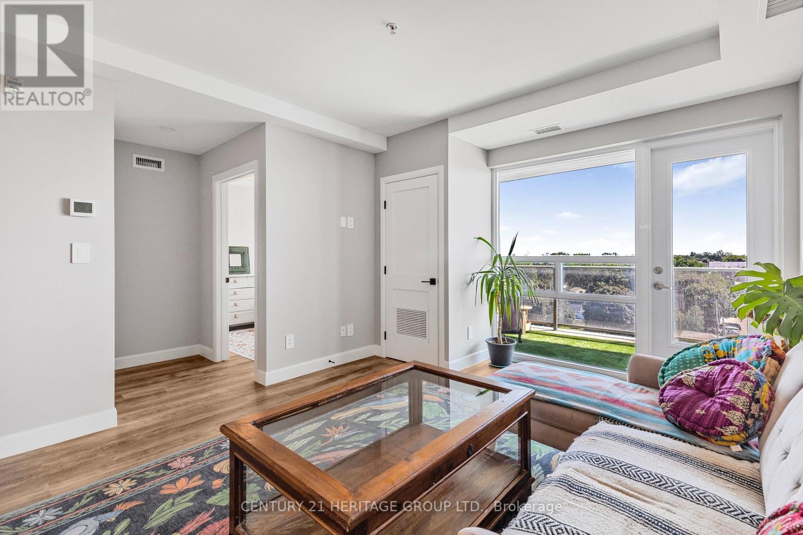 $364.78 MonthlyWelcome to this beautiful one-bedroom unit located on the sixth and top floor of the sought-after condo community The Landing in Brantford. This bright, modern suite combines style, comfort, and accessibility in a thoughtfully designed open-concept space. Featuring the upgraded 'Globe Trotter' package; this unit's kitchen has sleek shaker-style cabinetry, quality upgraded appliances, and tasteful finishes throughout. The spacious bathroom has an accessible layout, perfect for those using walkers or wheelchairs. Wide doorways throughout the unit further enhance ease of movement and add to the overall sense of space and luxury. Enjoy quiet mornings or relaxing evenings on your private balcony, with no upstairs neighbours and peaceful views from the top floor. Natural light radiates in, creating a warm and inviting atmosphere throughout. The Landing Condominiums offers a full range of amenities, including a rooftop terrace with panoramic views and BBQs, a cozy library for quiet afternoons, a hidden speakeasy-style lounge for entertaining, a kid's play area, and a modern fitness centre with premium equipment. Ideally located close to shops, restaurants, and essential services, with convenient access to major highways for easy commuting. Whether you're just starting out, downsizing, or investing, this is low-maintenance living in a welcoming community offering the perfect blend of luxury and practicality. Schedule your private showing today and experience life at The Landing. 1 Owned Parking & Locker (id:51158)