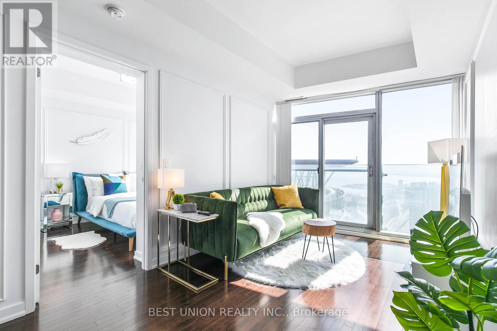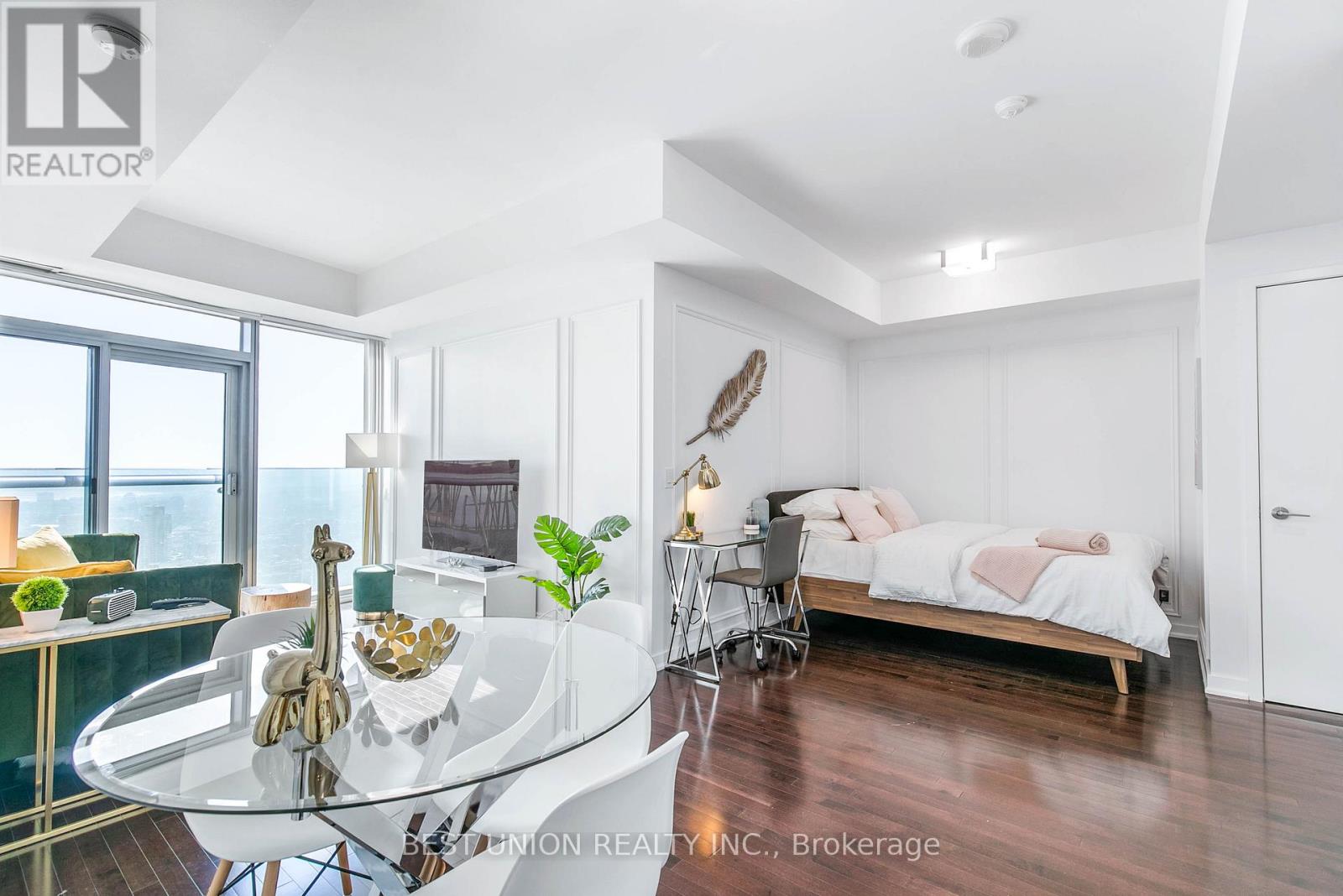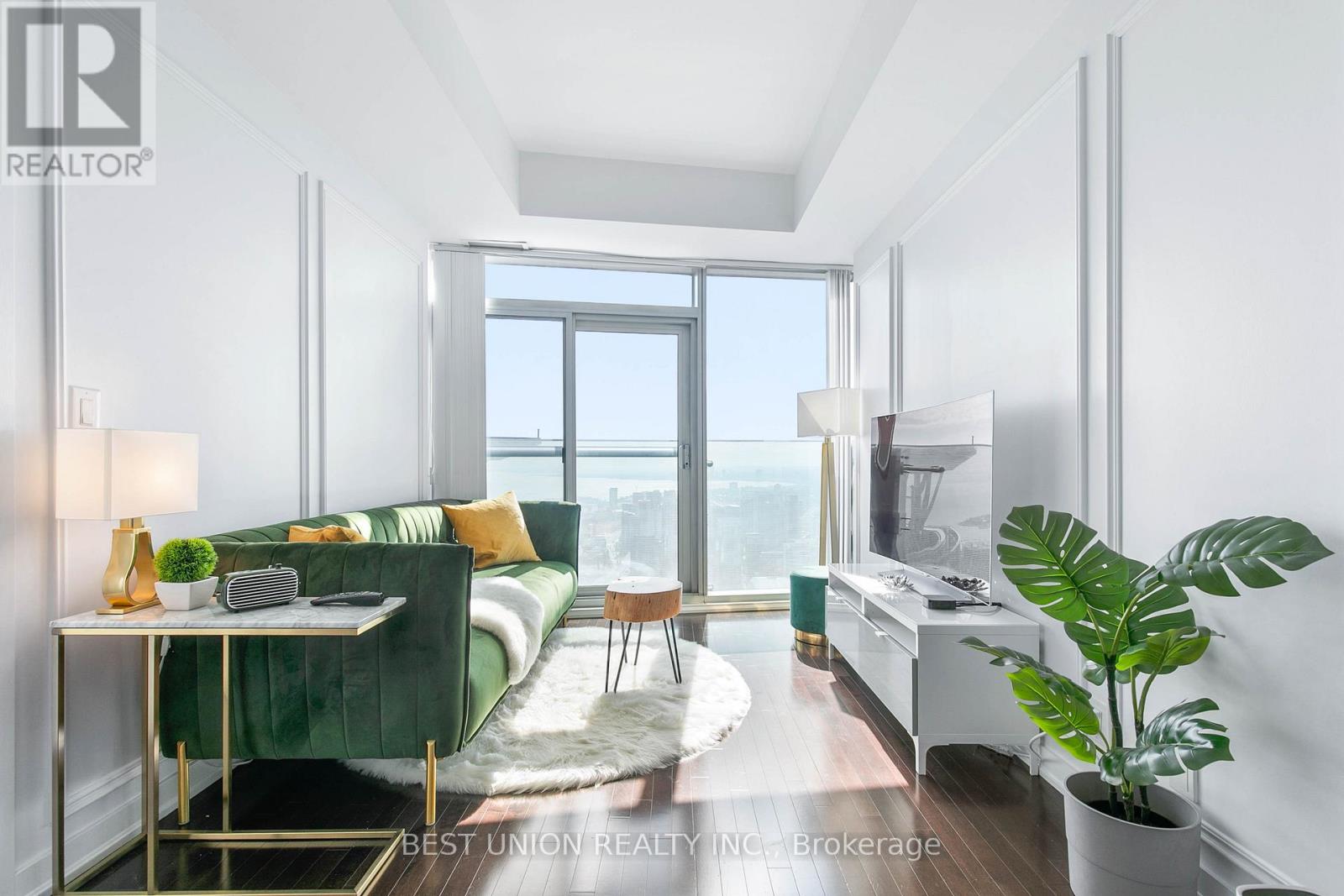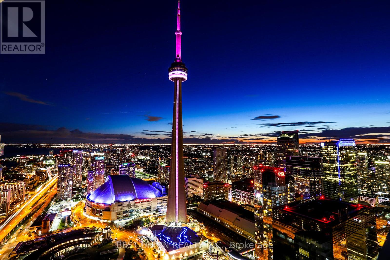 Welcome to ICE Condo 2 at York Centre, an inspired luxury residence combining urban living with waterfront tranquility. This rare 64th-floor unit offers 677 square feet of thoughtfully designed space featuring a premium 1+1 layout, easily convertible into a functional two-bedroom setup. Perched high above the city, the unit showcases breathtaking panoramic views of the Toronto skyline and mesmerizing city lights at night. Finished with hardwood flooring throughout, this unit includes one parking space and one locker for added convenience. Enjoy soaring 9-foot ceilings, floor-to-ceiling windows, and unobstructed west-facing views of the CN Tower and downtown core. The modern kitchen is equipped with high-end finishes, perfectly suited for contemporary lifestyles. Direct PATH access connects you effortlessly to Union Station, Rogers Centre, and other downtown landmarks. Exceptional amenities include a fitness centre, indoor pool, sauna, party room, and 24-hour concierge service. An outstanding opportunity to experience elevated living in one of Torontos most iconic developments. (id:51158)