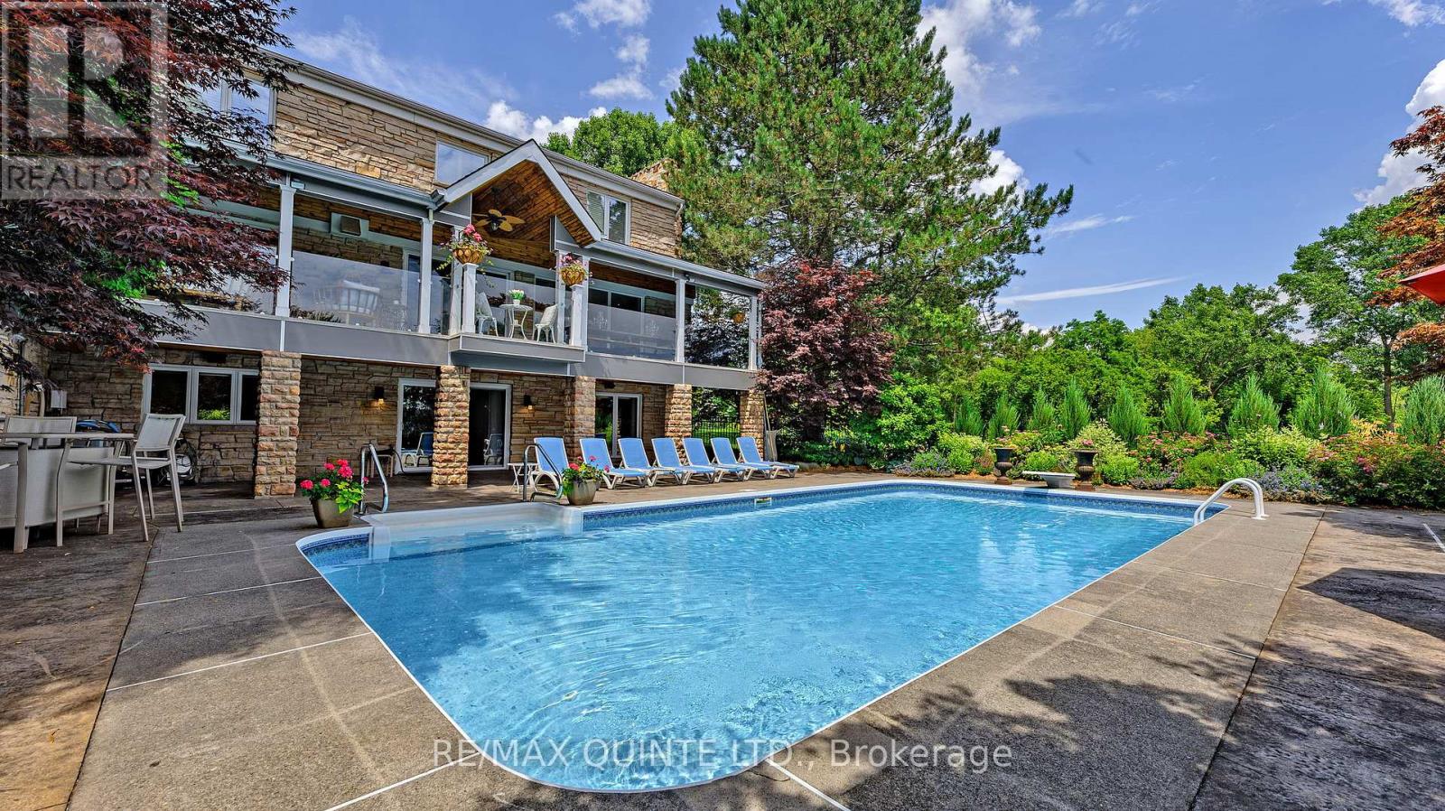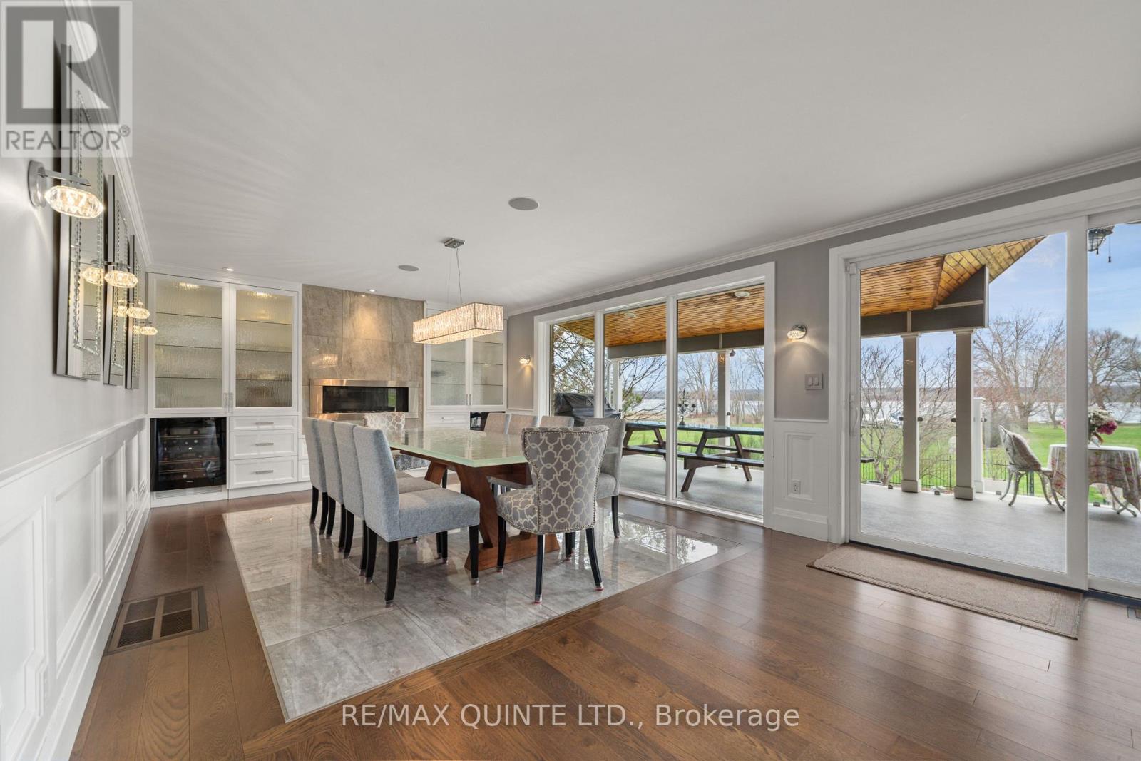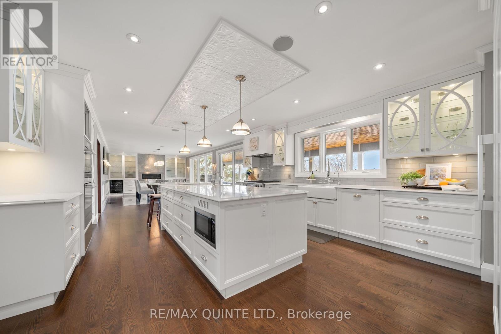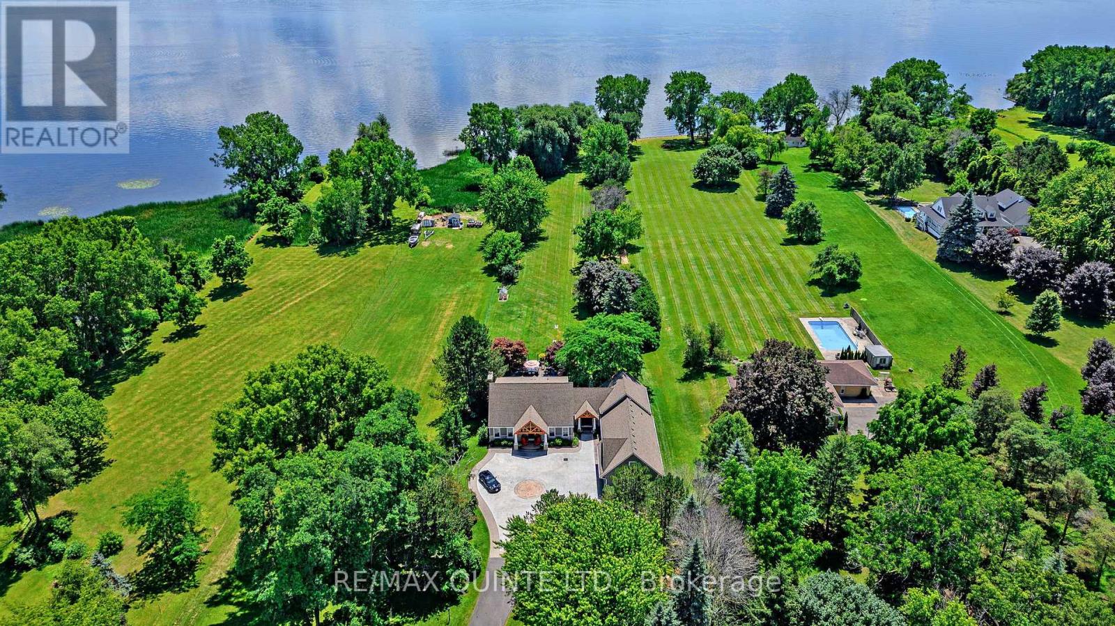 Welcome to your dream waterfront oasis on the beautiful Bay of Quinte. Combining timeless craftsmanship with modern luxury, this impeccably renovated and expanded home offers a quiet luxurious lifestyle in a prime central location. Completed in 2017, every detail of this exquisite property has been thoughtfully re-designed for comfort, function, and elegance. From the moment you arrive, you'll notice the impeccable curb appeal, featuring a new asphalt driveway complemented by custom concrete detailing and an impressive compass inlay. The exterior showcases original brickwork, meticulously removed and reinstalled to preserve the homes character, enhanced by new windows, doors, gutters, and downspouts. Heated floors warm all four washrooms on the main and upper levels, while quartz countertops elevate the kitchen, washrooms, and laundry room. The heart of the home, the kitchen, is a showstopper with modern quartz surfaces, stylish cabinetry, and premium appliances. Relax by any of the three gas fireplaces, including a stunning soapstone feature in the bar area, perfect for entertaining guests year-round. The oversized three-car garage, complete with a convenient drive-through bay, offers ample space for vehicles and storage. Above the garage, a fully insulated and drywalled loft provides endless possibilities. Step outside to your personal resort-like backyard, where a saltwater concrete pool with a natural gas heater awaits. At the waterfront, a 35ft dock and a lift dock system offers direct access to the Bay, ideal for boating and swimming with a bonus bunkie with a spacious living room and 2nd storey bunk room on the waters edge. This rare waterfront estate offers the perfect blend of luxury, privacy, and convenience close to all amenities, yet feeling like a true retreat. Whether you're enjoying a sunset swim, entertaining by the pool, or simply soaking in the peaceful bay views, this property provides an unmatched living experience. (id:51158)