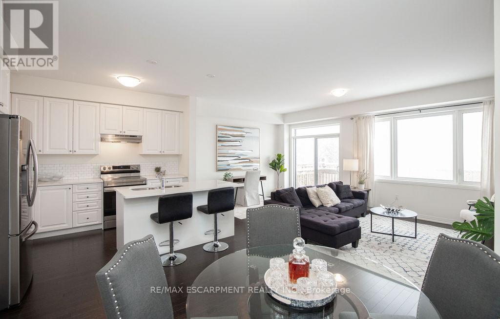 Welcome Home! This end unit townhome features 4 bedrooms, 3 bathrooms and offers over 1700 sq. ft. of beautifully finished living space over 2 floors. The open concept main level has hardwood floors throughout, an upgraded kitchen with quartz countertops & stainless steel appliances, sliding doors to the fully fenced in yard with views of farmland and forests, a powder room and access to the garage. The second level features a large primary bedroom with a walk-in closet and large ensuite bathroom with a dual sink vanity, separate tub & walk in shower. 3 spacious bedrooms, bathroom and laundry room finish off the second level. This home is located within walking distance of the Hamilton International Airport & is conveniently located with easy access to major highways, public transit, schools, shopping, restaurants, parks, & more! (id:51158)