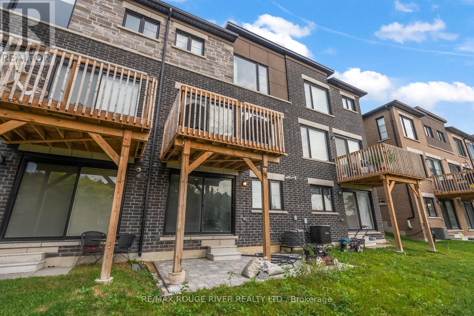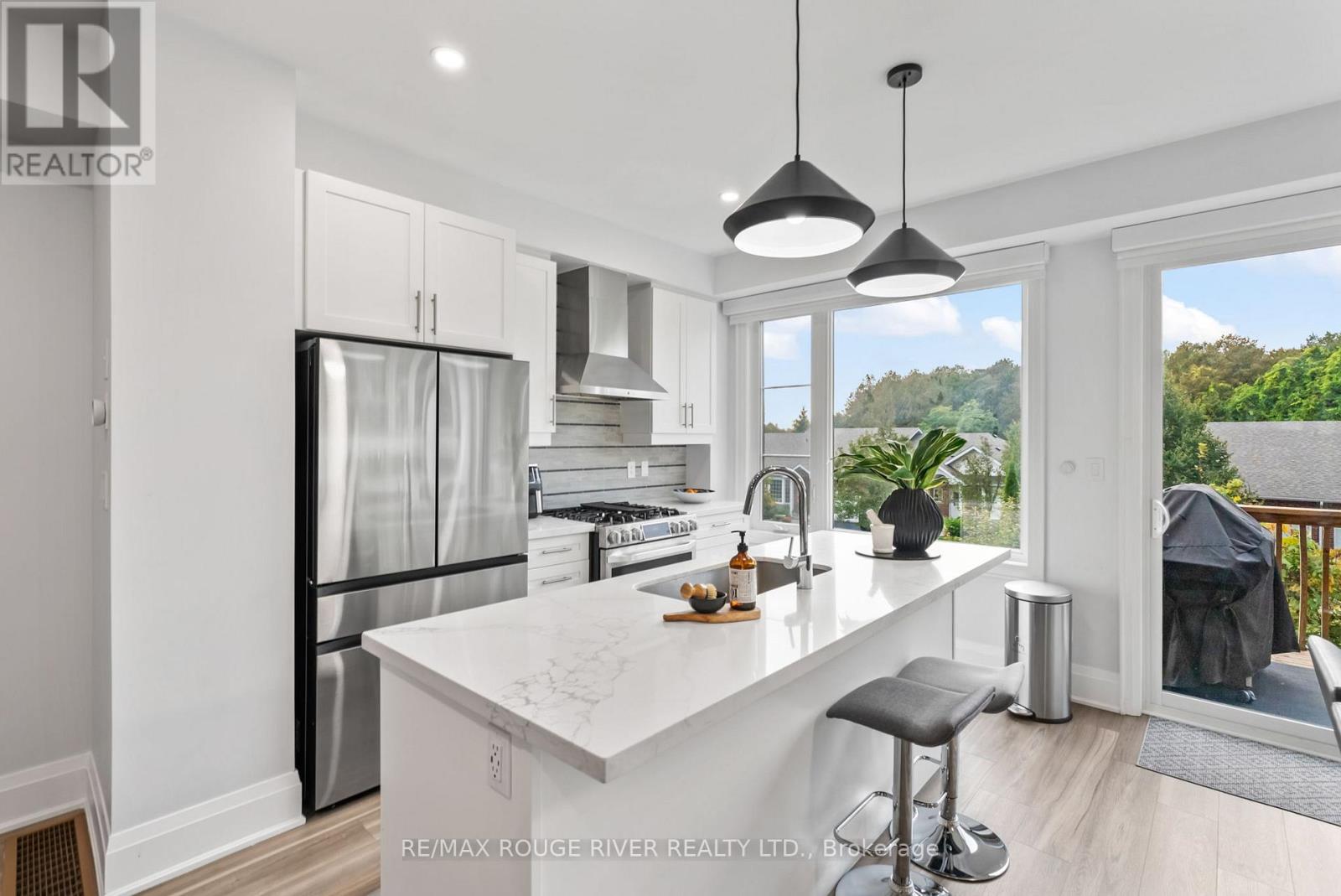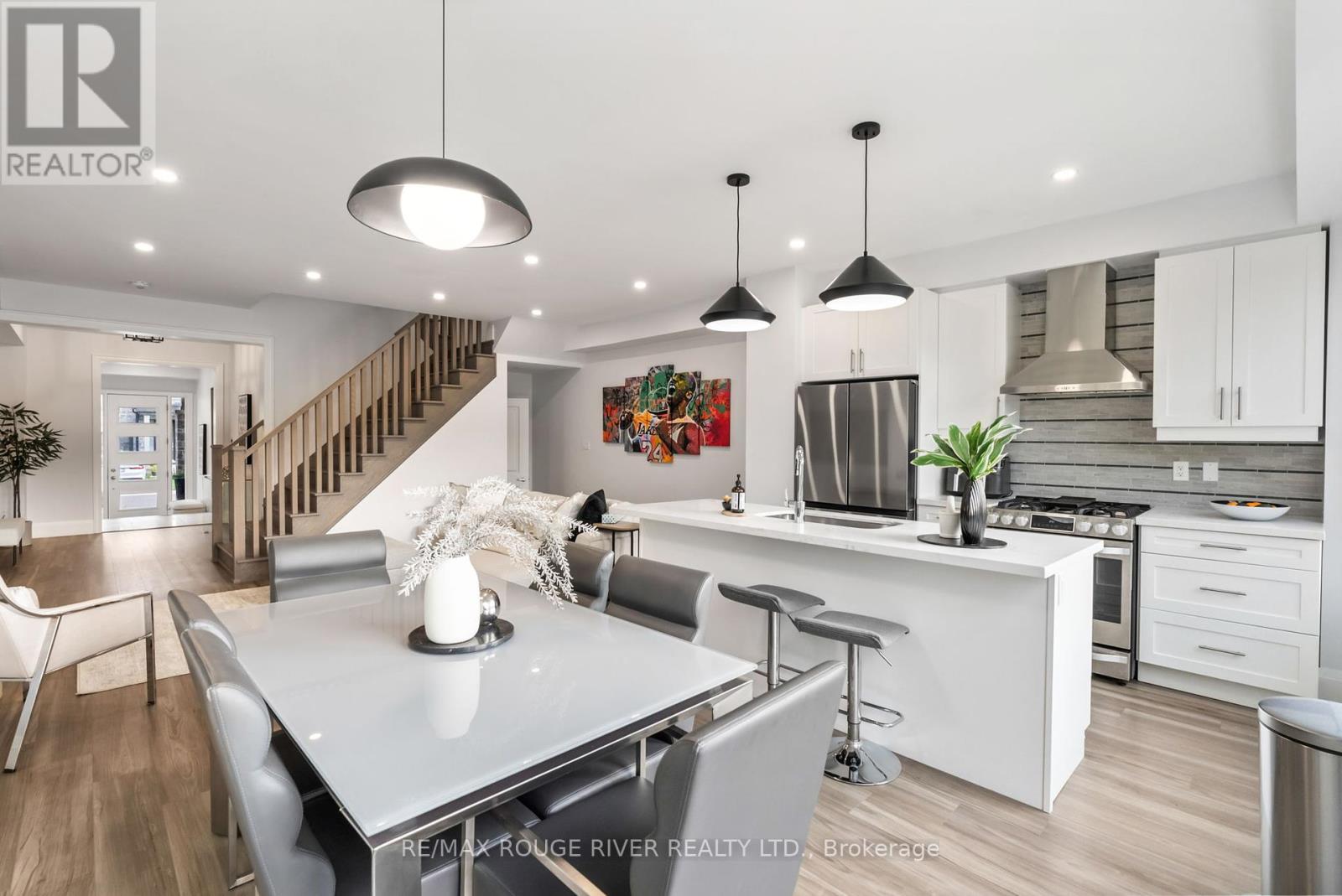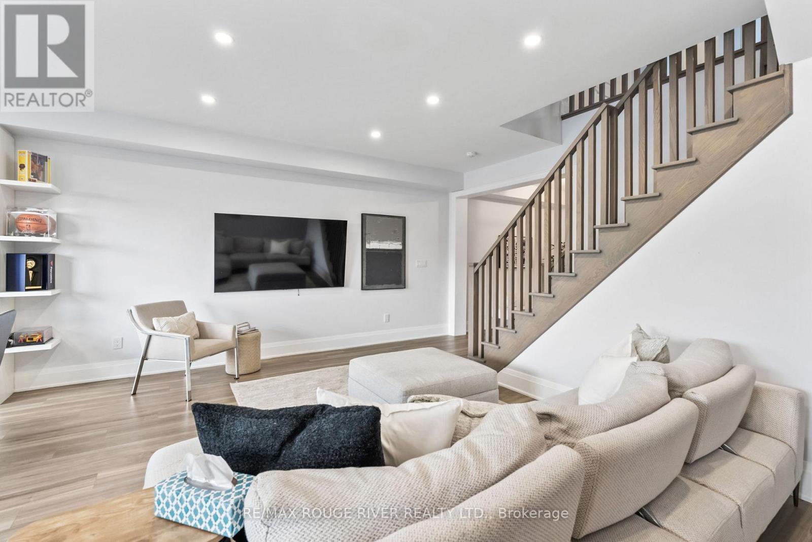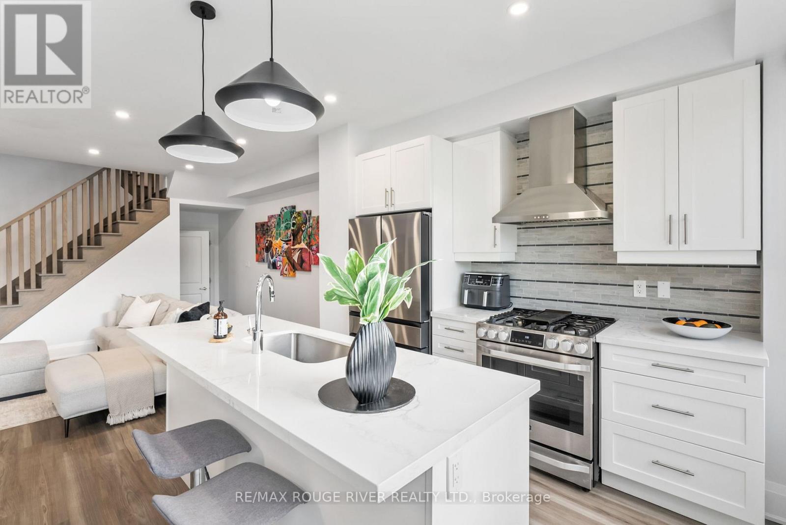 Stunning Turn-Key Townhome with Over $100K in Upgrades! Welcome to this beautifully appointed 3-bedroom, 4-bathroom townhome with walk out basement that seamlessly blends style, comfort, and functionality. Set in a prime location close to top-rated schools, shopping, dining, transit, and with easy access to Hwy 412, this home offers both convenience and luxury living. Step into a thoughtfully landscaped front yard and through an elegant entrance that opens to a bright, open-concept main floor. The living area features sleek luxury vinyl flooring, modern pot lighting, and flows effortlessly into the gourmet kitchen. A true showstopper, the kitchen boasts quartz-topped counters and centre island with seating, high-end stainless steel appliances including a gas range, and ample cabinetry for all your culinary needs. Adjacent to the kitchen, the inviting dining area includes custom built-ins and walks out to a private balcony- ideal for barbecuing or enjoying your morning coffee. Upstairs, the spacious primary suite serves as a tranquil retreat, complete with a walk-in closet and a spa-inspired 5-piece ensuite featuring a double vanity, soaker tub, and separate shower. Two additional generously sized bedrooms - one with its own walk-in closet, the other with a double closet -share a beautifully upgraded full bath. All bathrooms include elevated vanities for added comfort and style. Throughout the home, enjoy thoughtful upgrades such as California Closet systems, William Sonoma custom window coverings in all bedrooms, and premium finishes at every turn. The fully finished walk-out basement extends your living space with a cozy rec room, stylish 3-piece bathroom, and direct access to a charming stone patio and backyard- perfect for relaxing or entertaining. This meticulously maintained home is a rare find- just move in and enjoy. (id:51158)