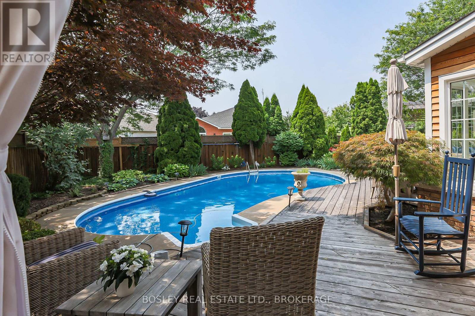 This renovated Cape Cod style charmer is nestled in a quiet neighbourhood of Niagara-on-the-Lake with easy access to the Heritage District, large open park spaces, the Niagara Parkway trails, many wineries, restaurants, golf courses, entertainment and everything that Niagara has to offer. Recently renovated in 2020 and 2025, the large foyer welcomes you to exquisitely finished living space. The main floor features a spacious living room with cathedral ceiling, floor to ceiling windows, skylights and an open gas fireplace and conveniently located private office near the front door. The chef inspired custom kitchen boasts gleaming white cupboards surrounding the large quarter-sawn oak in walnut stain island, Lapitec 100% sintered stone countertop with undermount sink, dishwasher and ample storage. The open dining space is perfectly located in the kitchen for entertaining your guests. Upgraded appliances include 36" Thermador gas cooktop and oven, and a 48" x 84" fridge/freezer. Sliding doors from the kitchen open to a covered BBQ cabana and a second outdoor eating area. The Livingroom patio doors connect you to the fully landscaped backyard with large mature trees, shrubbery and plantings surrounding the in-ground saltwater pool, a wraparound patio with retractable awning and deck with pergola. Second level has two well appointed bedrooms. The fabulous master bedroom has an adjoining dressing room with closets, luxurious five piece ensuite, private balcony and laundry facilities. The finished basement is complete with family room with wood stove, wine cellar, recently updated bathroom, 2 more bedrooms, pantry and storage area with rough in for a kitchenette for a variety of uses. A perfect home for family gatherings and entertaining. Previous updates: Basement Bedrooms and Bathroom 2025, Main Bathroom Tub/Surround 2024, AC 2023, pool liner 2017, furnace 2017, water heater 2017, pool gas heater 2023 with salt water converter and safety cover 2020. (id:51158)