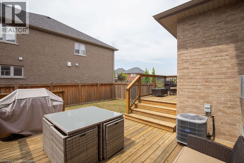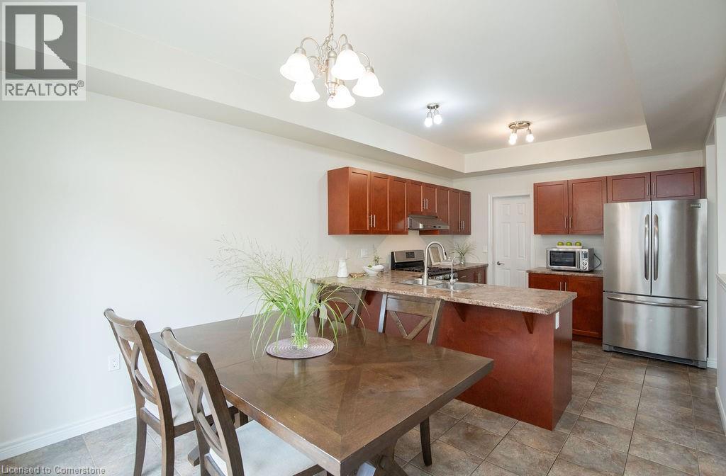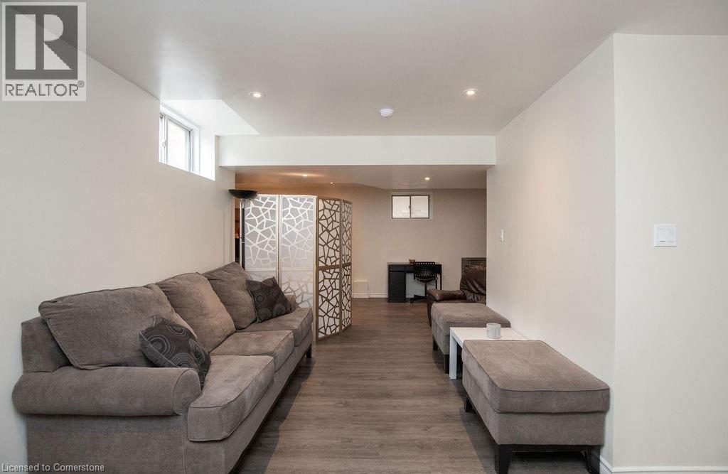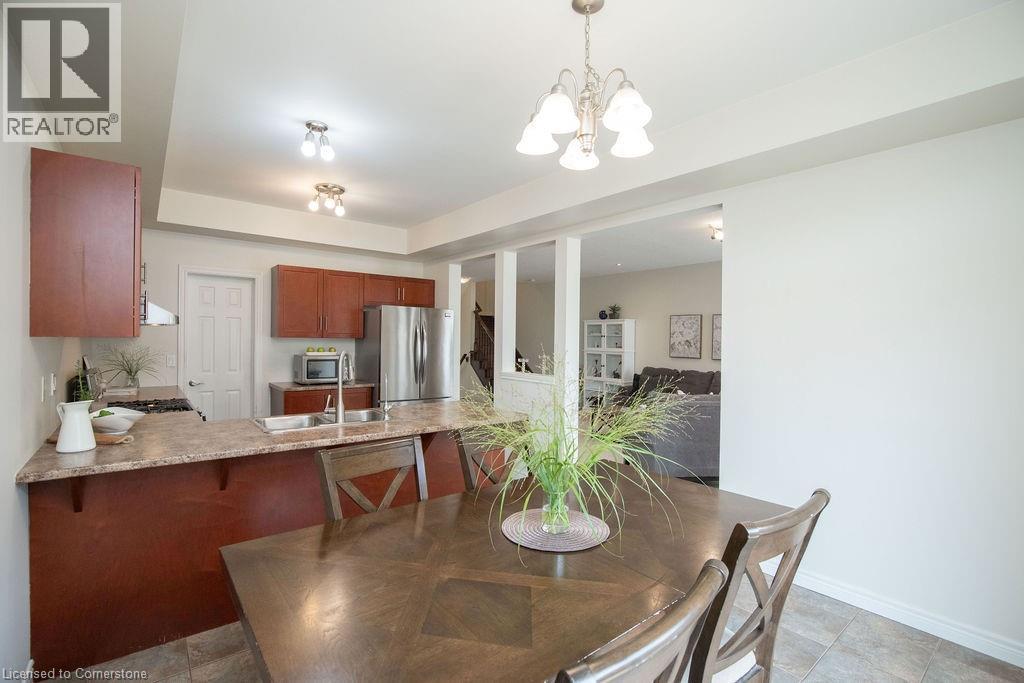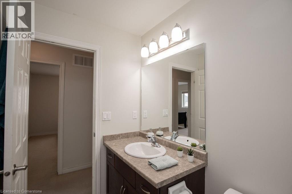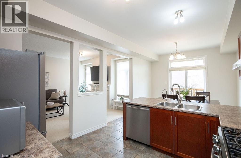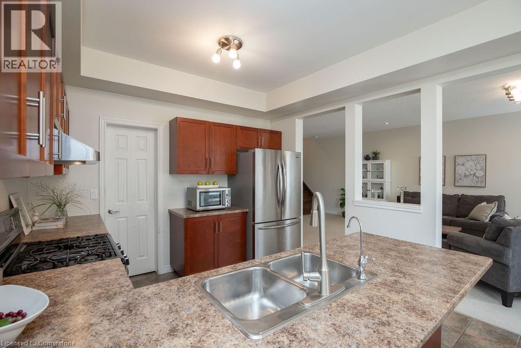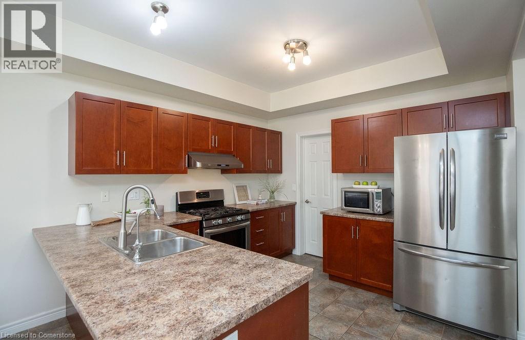 Welcome to this beautifully designed 4-bedroom, 3.5-bathroom home, nestled in the family-friendly Paramount at Valley Park community. This spacious, split-level residence provides a layout that blends comfort, privacy, and practical living ideal for busy suburban families. Step into a welcoming main level featuring a solid oak staircase, 9-foot California knockdown ceilings, and a spacious living room with a cozy gas fireplace. The open-concept kitchen is both functional and stylish, boasting solid maple cabinetry, a breakfast bar, ceramic tile flooring, a walk-in pantry, and an eat-in dinette with patio sliders and transom window leading to the backyard. Upstairs, the private primary suite occupies its own level for added separation and comfort, featuring a large bedroom with broadloom carpet, a walk-in closet, and a spacious ensuite with soaker tub and oak vanity. Three additional generously sized bedrooms, each with ample closet space, share a 4-piece bathroom with tiled tub surround. The finished basement extends your living space with a large recreation room, modern 3-piece bathroom with a glass shower, and plenty of storage. Located in a sought-after neighbourhood known for its great schools, parks, trails, shopping, and quick access to the Red Hill Valley Parkway, this is the perfect blend of suburban convenience and family-focused living. (id:51158)
