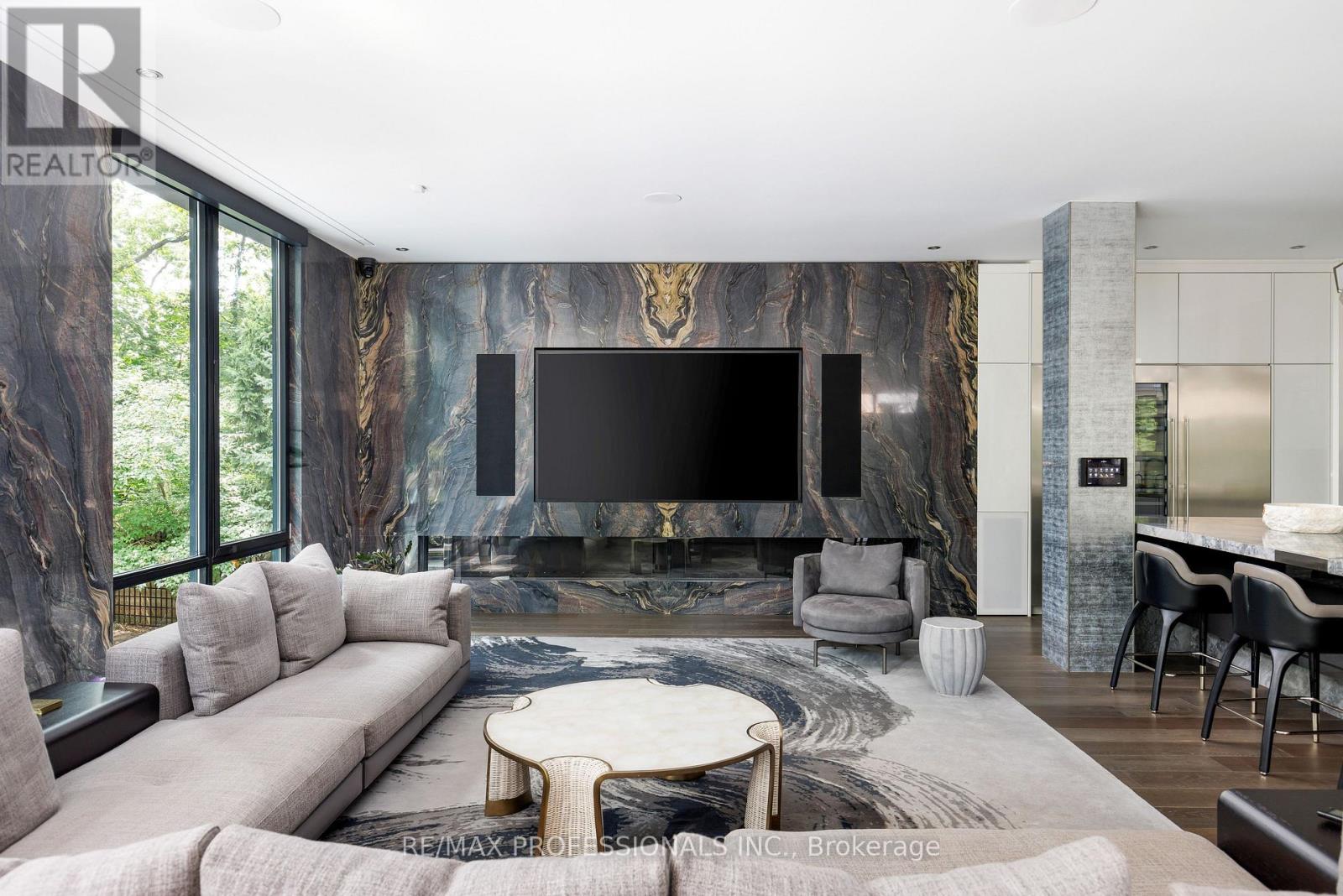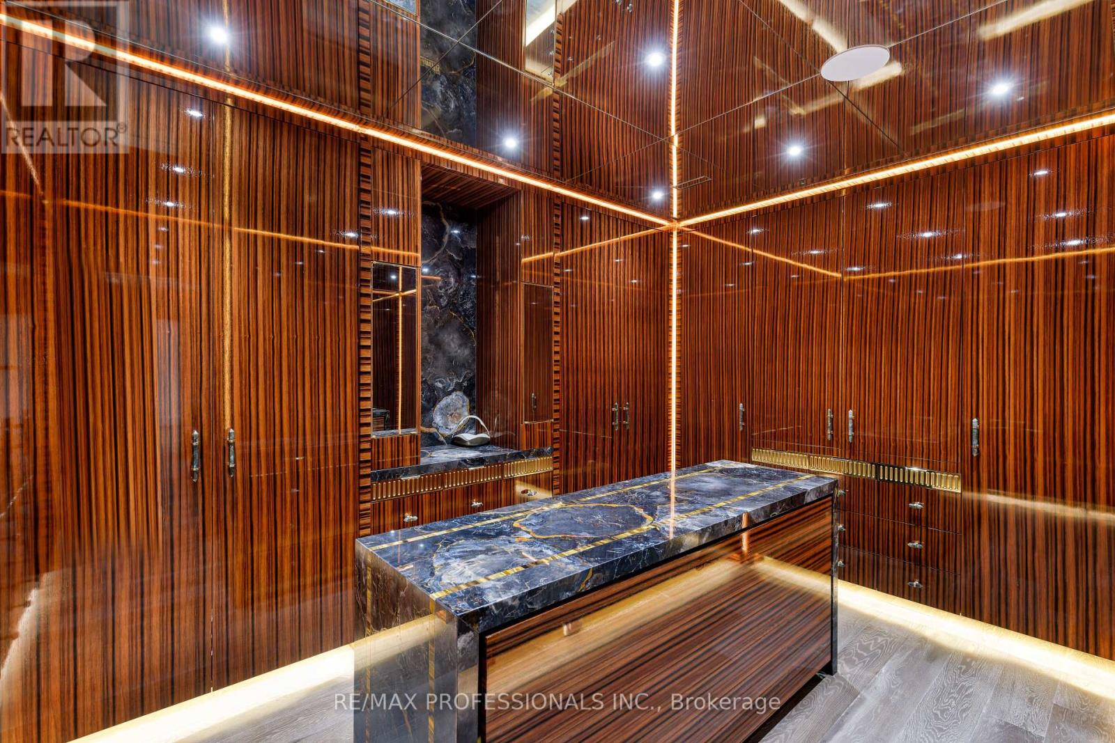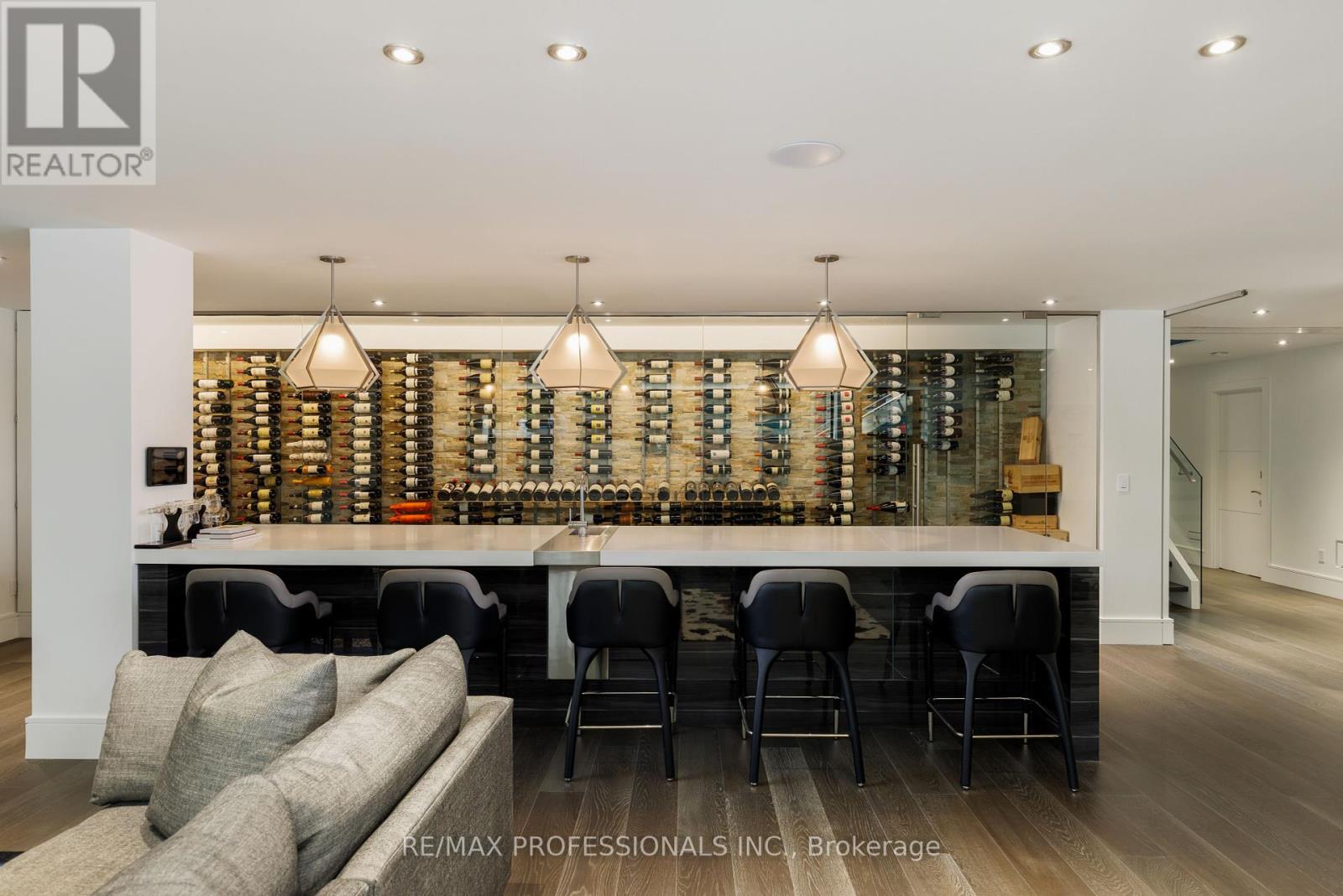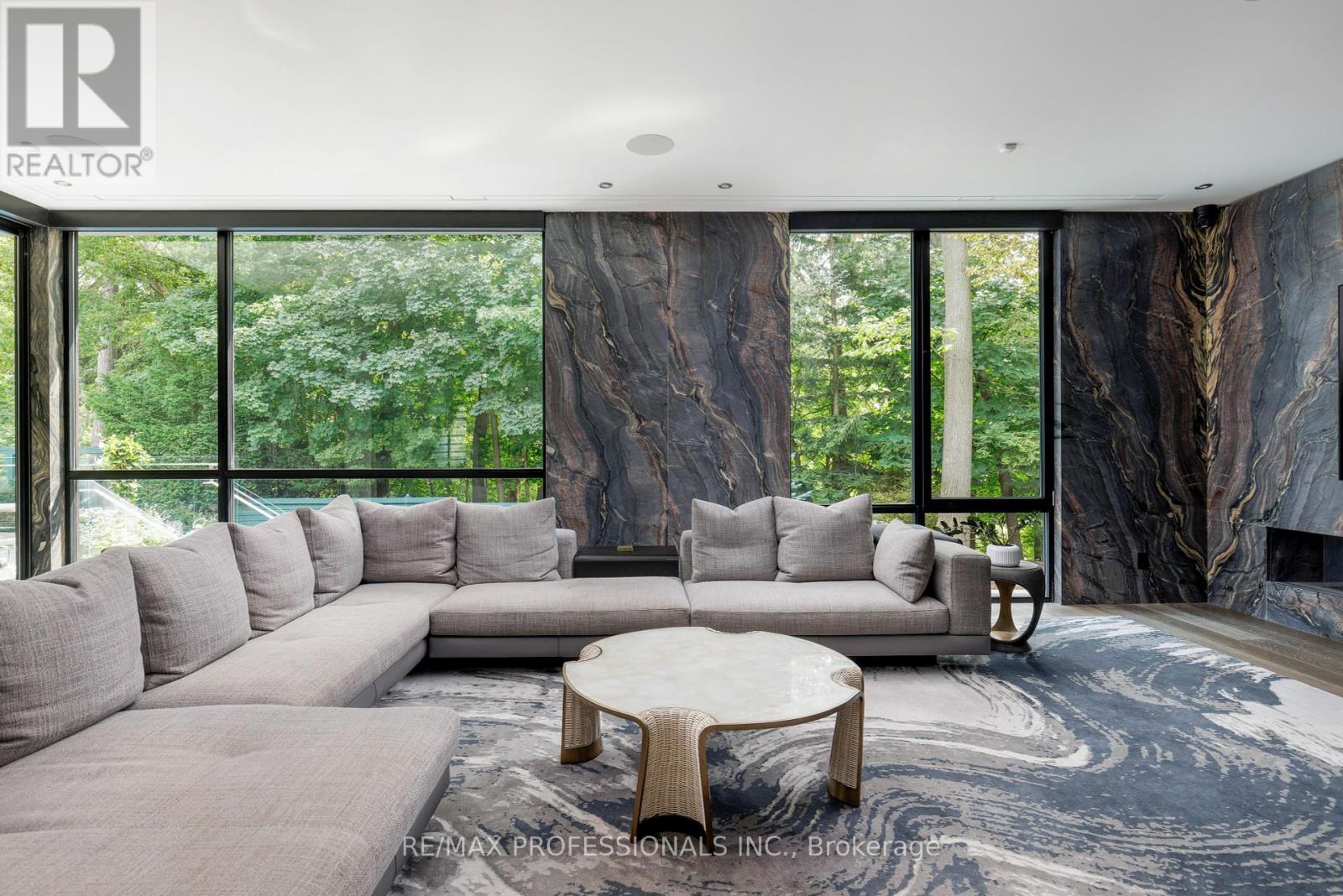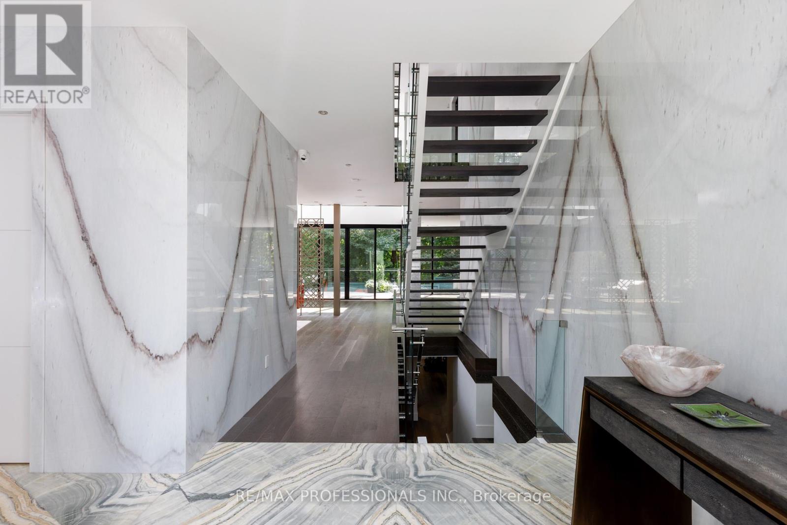 Spectacular Custom home on Lambton Wood Ravine in prestigious Edenbridge Humber Valley. Idyllic private setting with secluded oasis complete with pool and east facing garden backing onto the wooded ravine. Enter inside a masterpiece of custom stonework throughout with floor to ceiling marble and endless upgrades and luxury appointments. 7000+ square feet of living space offers residents top of the line Gaggenau appliances and furnishings that overlook the backyard living and dining areas. The second floor offers 4 fully furnished bedrooms each with private ensuite baths. The primary bedroom is amongst the finest with ravine views and built in TVs and a 5 piece ensuite and walk in closets like no other. Lower level offers a full bar & temperature controlled wine cellar with sprawling lower living space complete with professional gym & spa/cold plunge & sauna. Not to be missed, the garage includes a two car lift. Truly a lifestyle experience and unequivocally the finest in finishes throughout nestled on one of the quietest streets in the area. Steps to Humber town plaza, Bloor, and close to all major highways. Short commute downtown & top school district. (id:51158)
