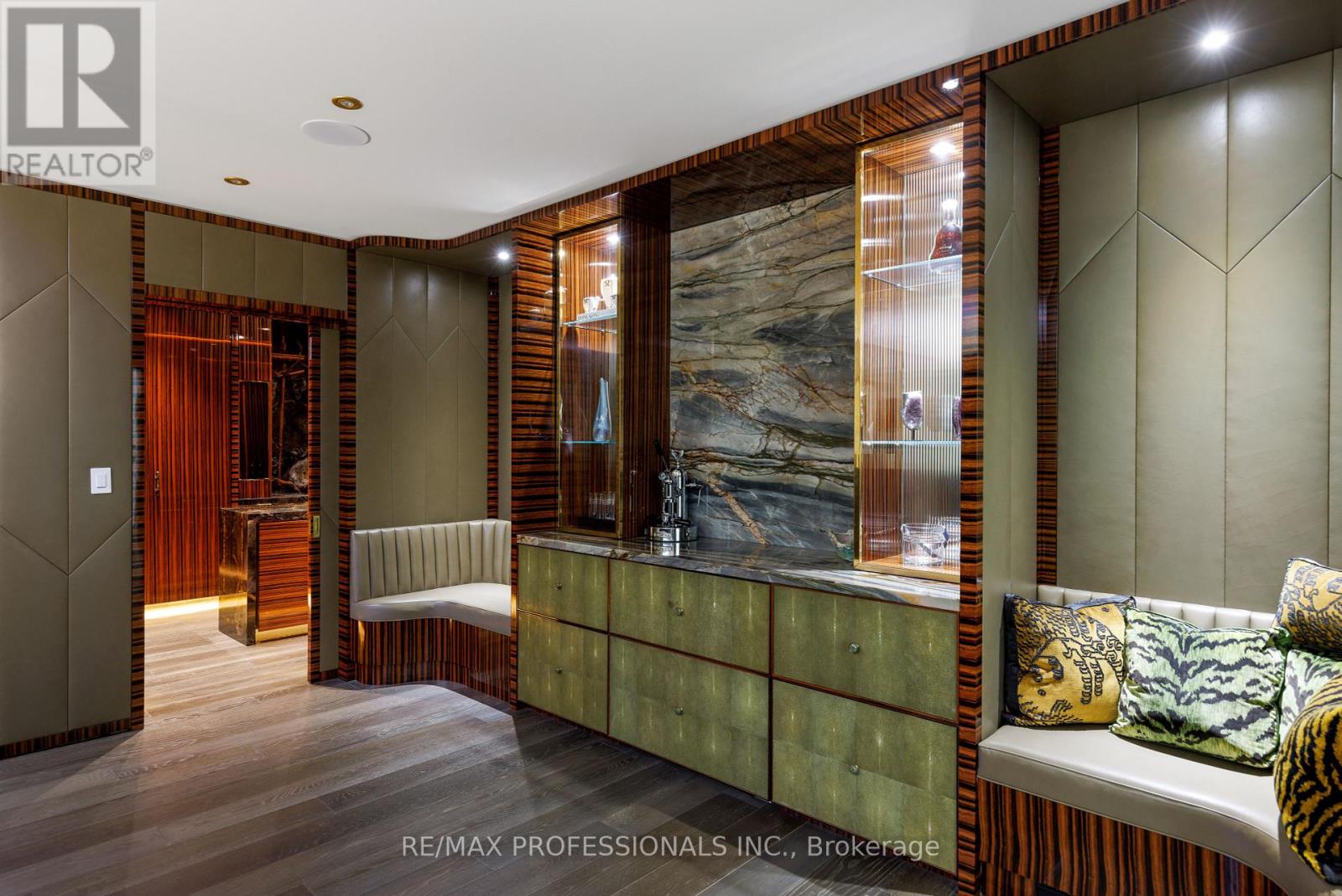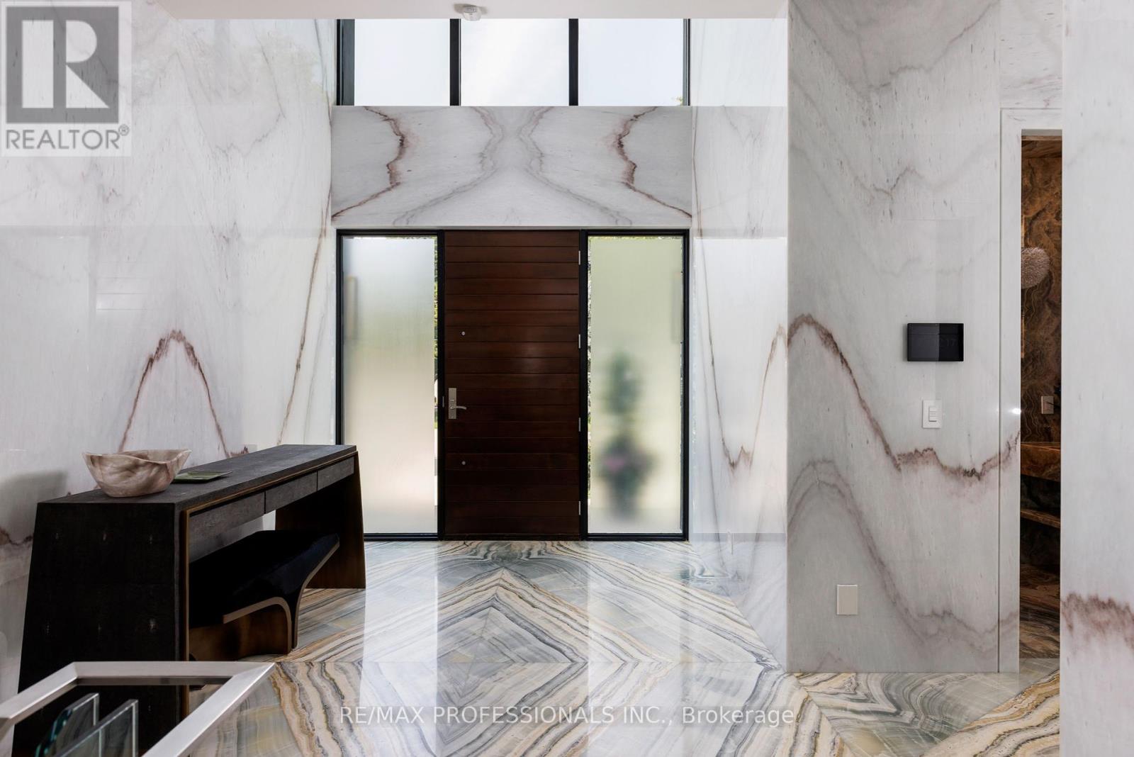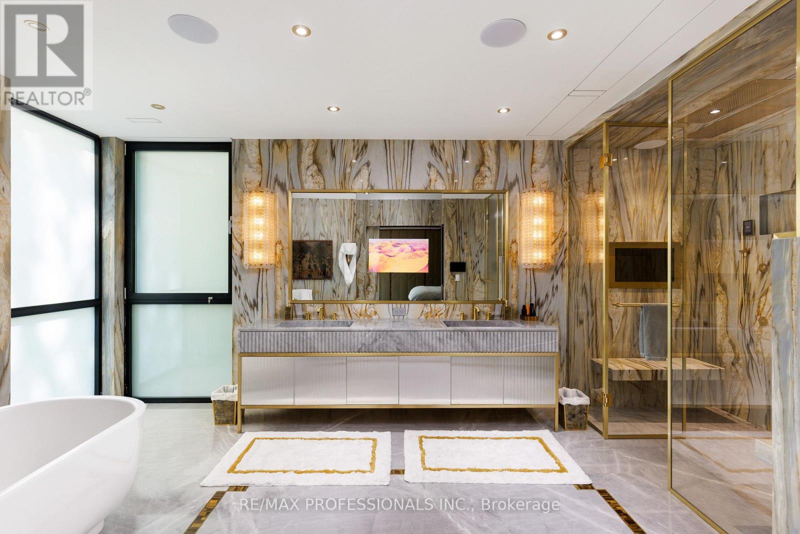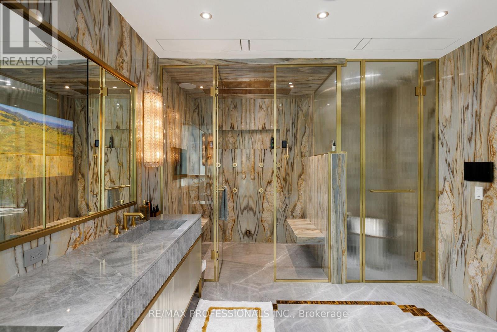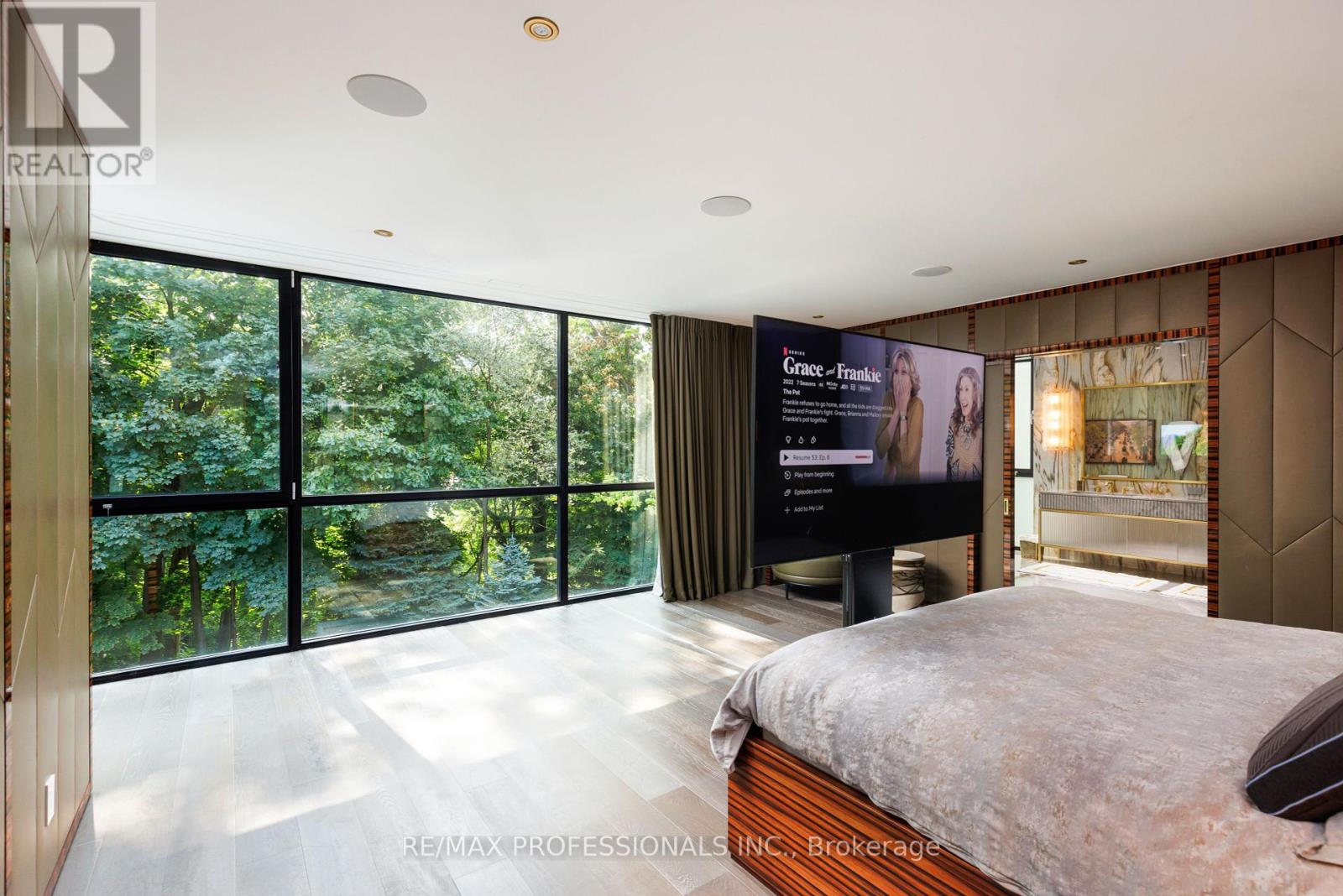 Spectacular Custom home on Lambton Wood Ravine in prestigious Edenbridge Humber Valley. Idyllic private setting with secluded oasis complete with pool and east facing garden backing onto the wooded ravine. Enter inside a masterpiece of custom stonework throughout with floor to ceiling marble and endless upgrades and luxury appointments. 7000+ square feet of living space offers residents top of the line Gaggenau appliances and furnishings that overlook the backyard living and dining areas. The second floor offers 4 fully furnished bedrooms each with private ensuite baths. The primary bedroom is amongst the finest with ravine views and built in TVs and a 5 piece ensuite and walk in closets like no other. Lower level offers a full bar & temperature controlled wine cellar with sprawling lower living space complete with professional gym & spa/cold plunge & sauna. Not to be missed, the garage includes a two car lift. Truly a lifestyle experience and unequivocally the finest in finishes throughout nestled on one of the quietest streets in the area. Steps to Humber town plaza, Bloor, and close to all major highways. Short commute downtown & top school district. (id:51158)