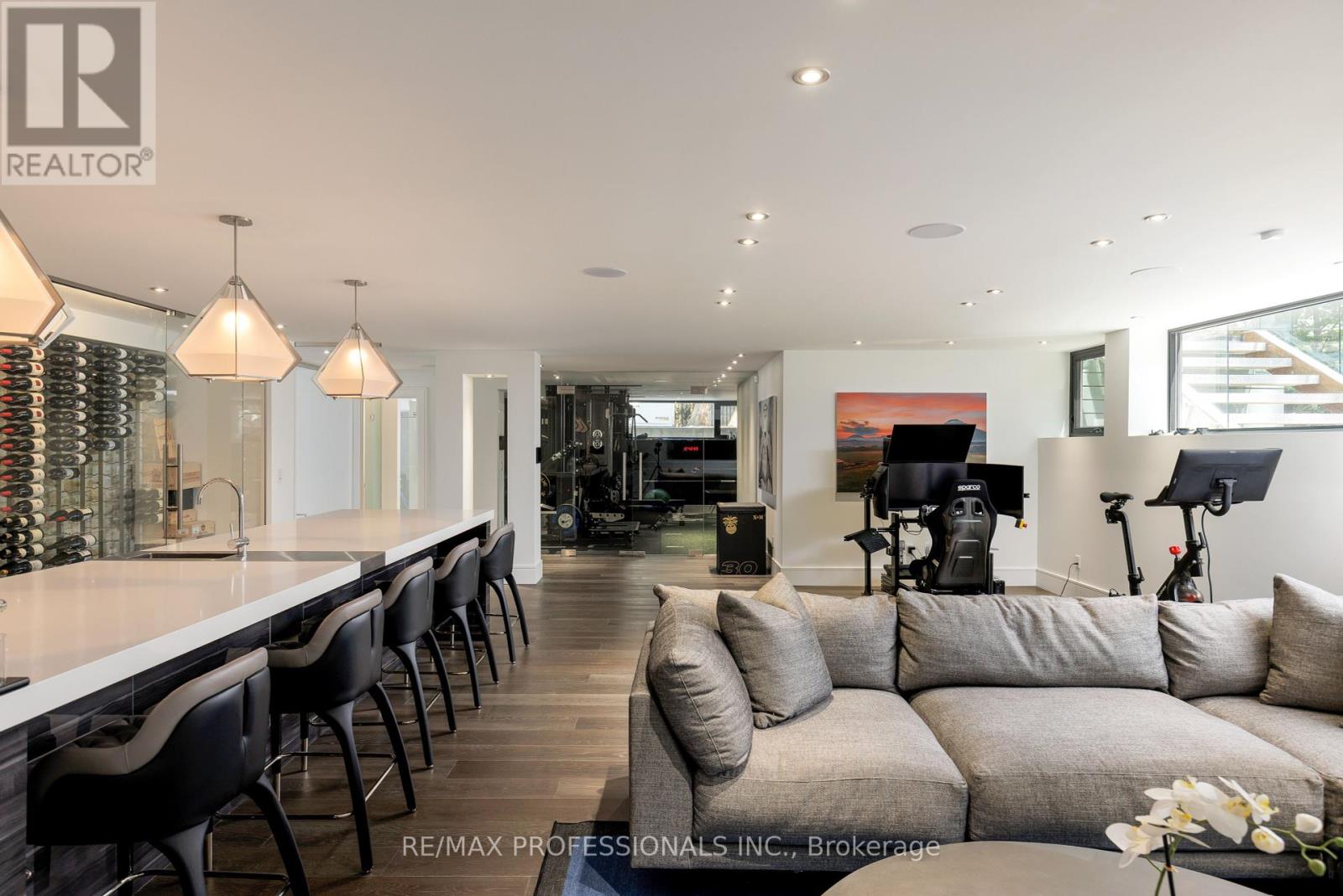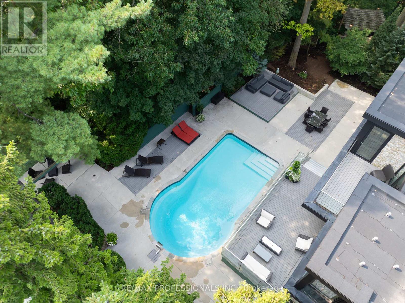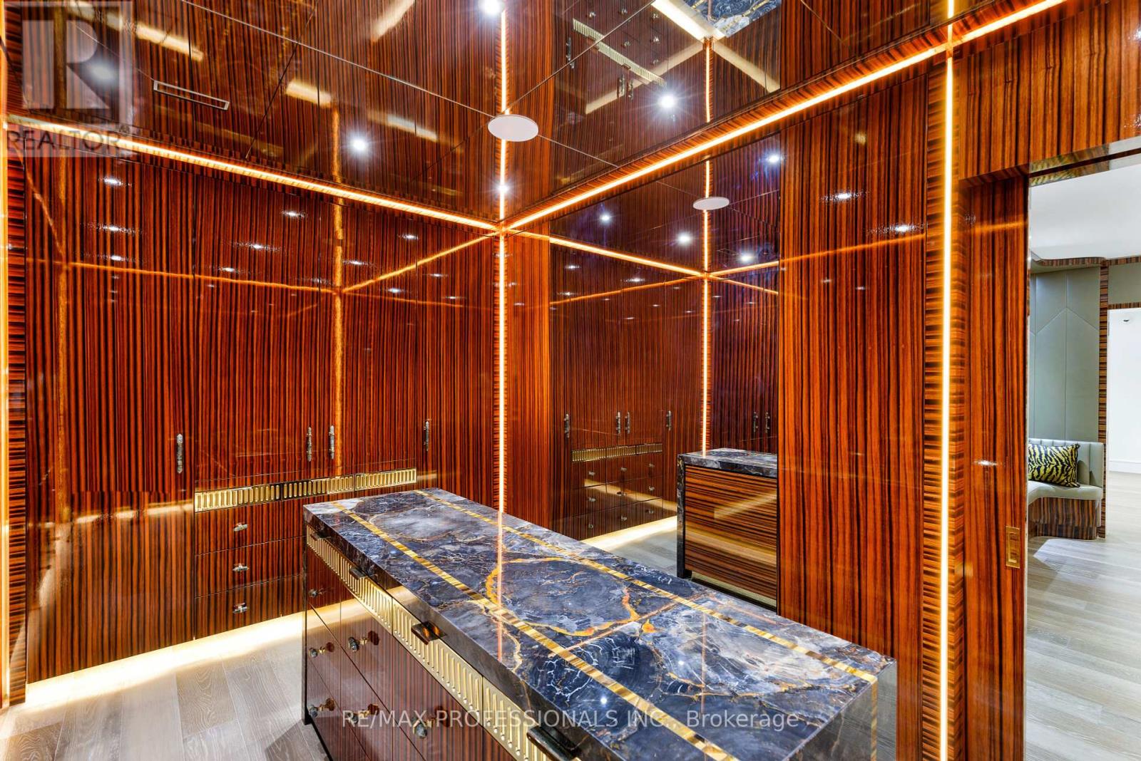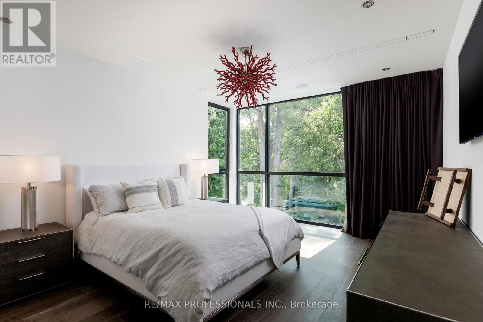 Spectacular Custom home on Lambton Wood Ravine in prestigious Edenbridge Humber Valley. Idyllic private setting with secluded oasis complete with pool and east facing garden backing onto the wooded ravine. Enter inside a masterpiece of custom stonework throughout with floor to ceiling marble and endless upgrades and luxury appointments. 7000+ square feet of living space offers residents top of the line Gaggenau appliances and furnishings that overlook the backyard living and dining areas. The second floor offers 4 fully furnished bedrooms each with private ensuite baths. The primary bedroom is amongst the finest with ravine views and built in TVs and a 5 piece ensuite and walk in closets like no other. Lower level offers a full bar & temperature controlled wine cellar with sprawling lower living space complete with professional gym & spa/cold plunge & sauna. Not to be missed, the garage includes a two car lift. Truly a lifestyle experience and unequivocally the finest in finishes throughout nestled on one of the quietest streets in the area. Steps to Humber town plaza, Bloor, and close to all major highways. Short commute downtown & top school district. (id:51158)