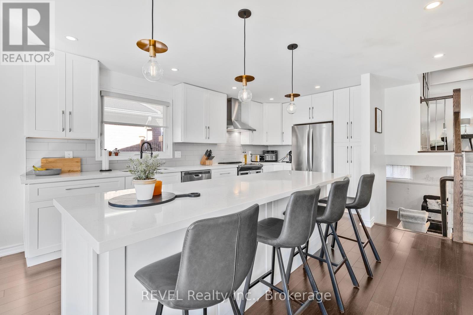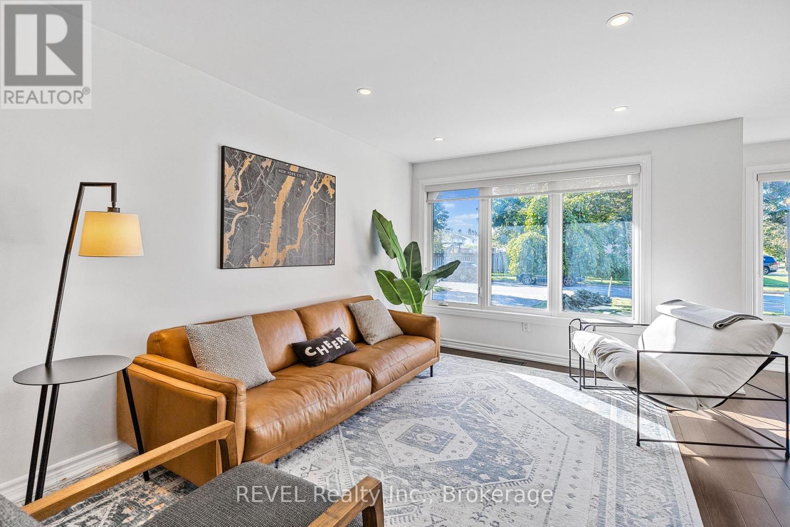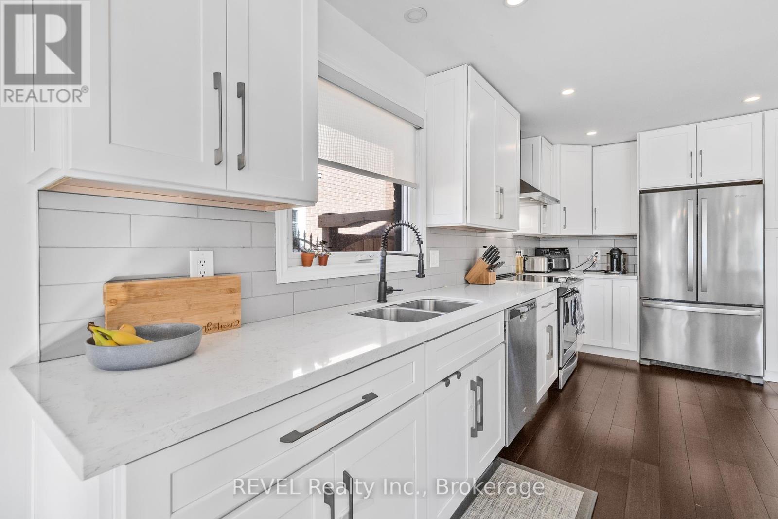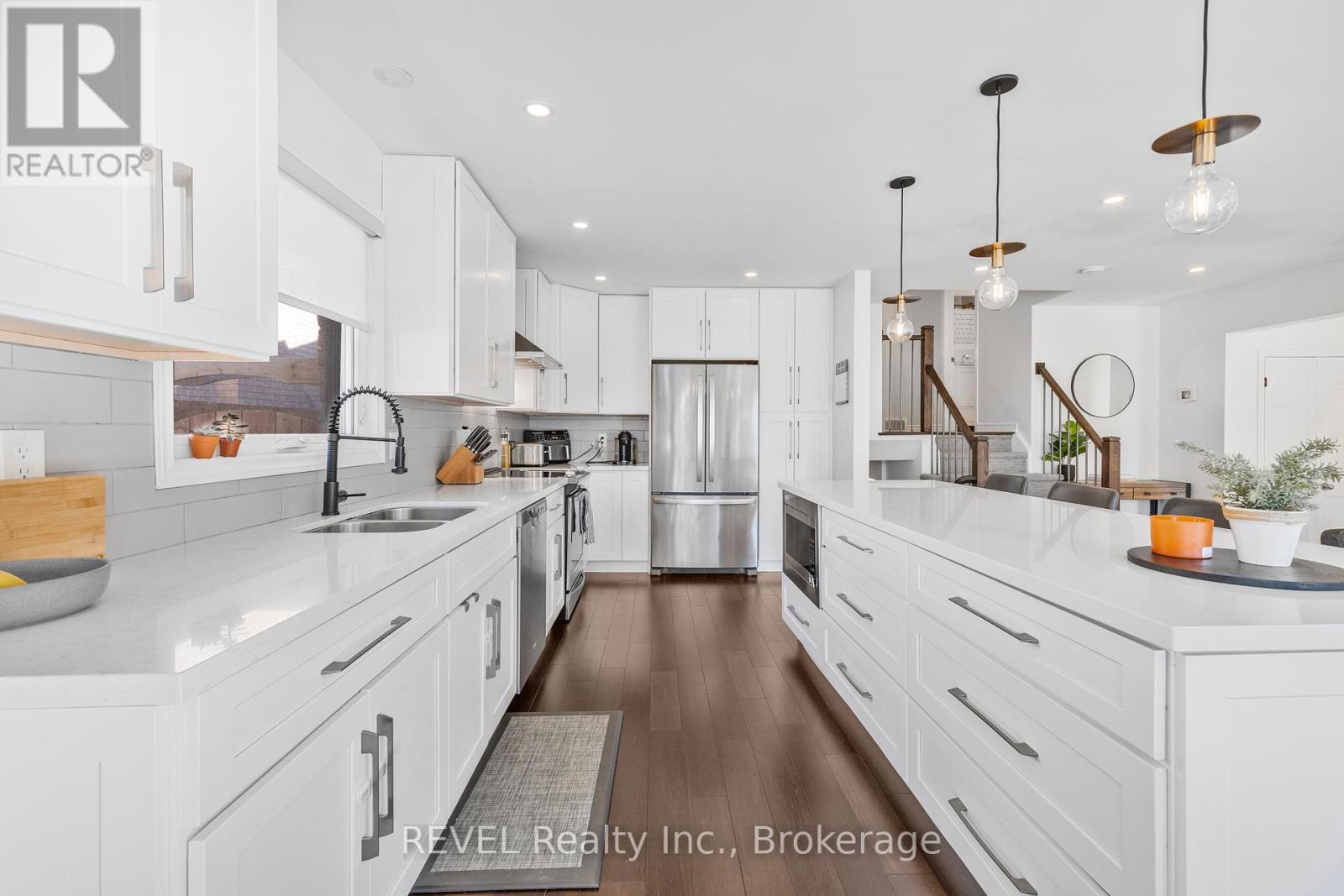 Welcome to this fully remodelled 4-level back-split in a great family friendly neighbourhood! Professionally renovated top to bottom in 2018, this home offers an open-concept main floor with a 9-foot island, quartz counters, stainless steel appliances, and a gorgeous custom kitchen. Upstairs youll find 3 bright bedrooms, including a primary with a custom walk-in closet and ensuite access to a 5-piece bathroom with a double vanity. The lower level boasts a spacious family room with high ceilings, a cozy floor-to-ceiling brick fireplace, and a walk-up to the oversized patio (2018). The basement features a large den/office, custom laundry room (2018), cold storage, and plenty of extra storage. Additional upgrades: bamboo engineered hardwood and upgraded staircase (2018), roof (2017), furnace (2016). Move in and enjoy with peace of mind knowing the big-ticket items are done! (id:51158)
