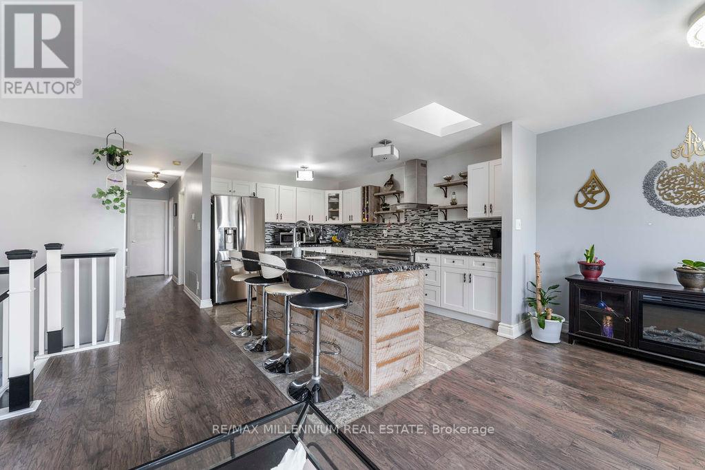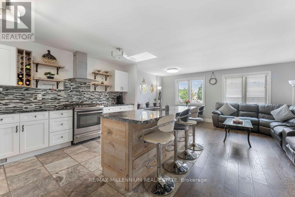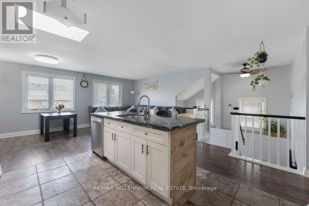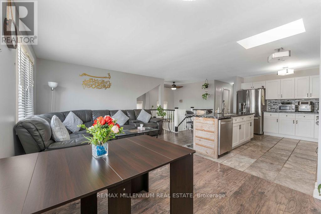 This stunning custom-designed home with walk-out lower level 1 bedroom suite offers exceptional curb appeal and a thoughtfully renovated interior with modern upgrades throughout. Located in highly desirable Courtice neighbourhood, the property backs directly onto serene parkland, providing privacy and a beautiful natural backdrop.The main level features an open-concept living and dining area with wide plank laminate flooring, an elegant remodelled staircase, and an inviting foyer accented with designer wall details and travertine stone flooring. The fully updated kitchen boasts travertine tile floors a skylight, stylish backsplash, granite countertops, a centre island, and a breakfast bar-perfect for entertaining and family gatherings. The spacious primary bedroom includes a semi-ensuite bath and a generous closet.The fully finished walk-out lower level is another world in itself and offers a bright Living room with a cozy fireplace and above-grade windows, an additional bedroom, a full bathroom and a small kitchen. There is a separate entrance to the walkout apartment on the above ground lower level with a great rental potential.Exterior highlights include a private, fenced backyard with gate access to the park, a large deck with hot tub, new insulated garage doors, a widened driveway, and a double-car garage.Some recent renovations include a brand new roof with 15 years warranty, full bathroom remodelling (in the walkout unit) and new washer and dryer.Priced to sell. ** This is a linked property.** (id:51158)