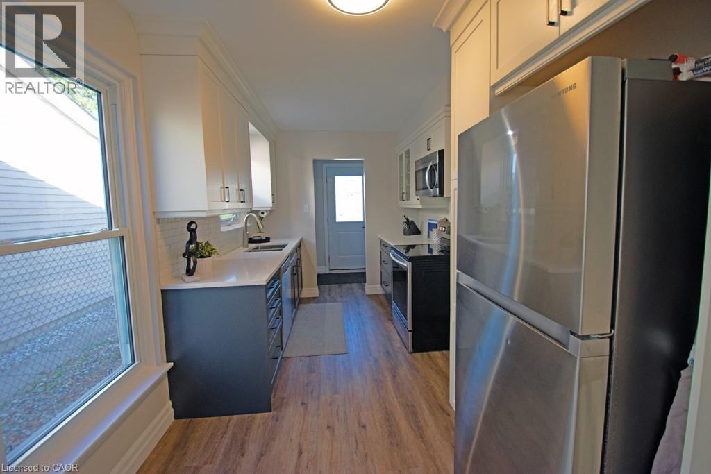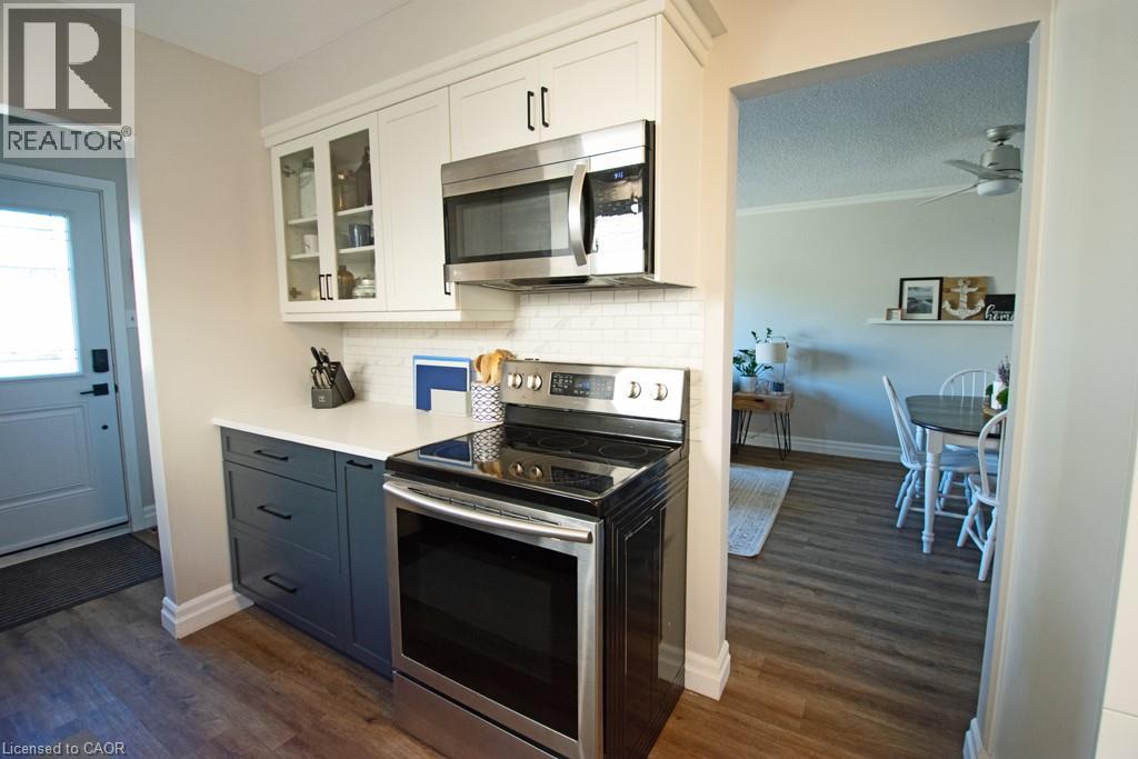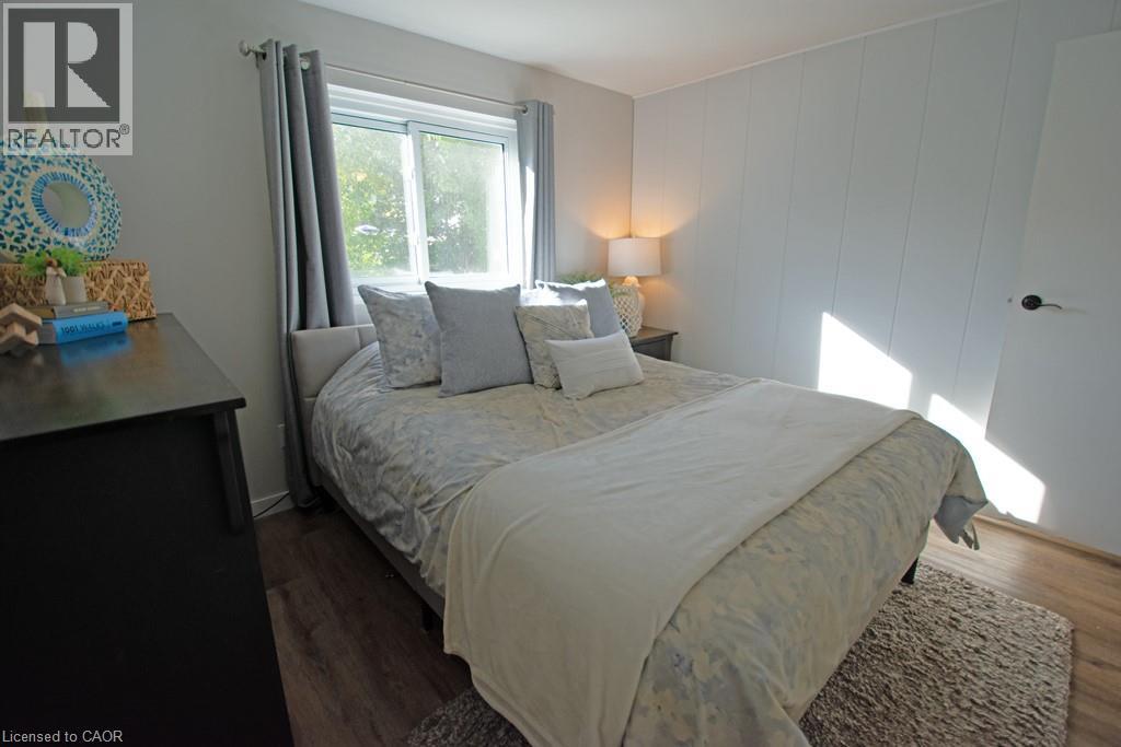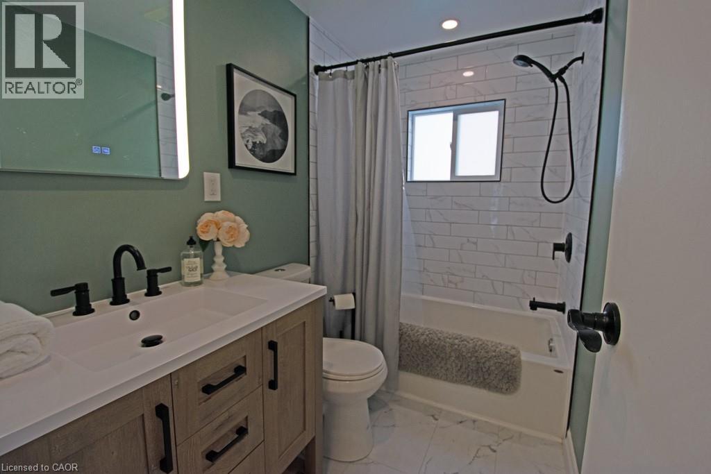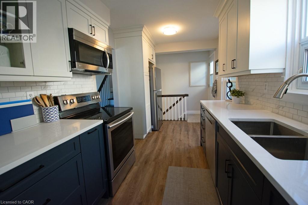 Welcome home! This recently renovated back split with single garage is move-in ready and tucked away in a sought-after, family-friendly neighborhood close to schools, parks, rec centers, shopping, Brantwood Farm Market and quick highway access. 1257 finished sq ft of space plus 361 sq ft in the crawl space. Step inside to discover new flooring and fresh paint throughout, creating a bright, spacious, and modern feel. The front foyer opens into a stunning new kitchen (2023), complete with quartz countertops, high-end appliances, and walkout access to the fully fenced backyard. A generous living and dining room makes entertaining a breeze. Upstairs, you’ll find three comfortable bedrooms and a beautifully updated contemporary 4-piece bath. The lower level features a large family room with fireplace, a handy 2-piece bath, and potential for a 4th bedroom or home office. The backyard is designed for year-round fun and relaxation, offering a deck, fire pit, and hot tub with privacy gazebo. Major updates include furnace, A/C, tankless hot water heater, and water softener (2020). Storage is not a problem with a huge crawl space put everything away! This home checks all the boxes- style, comfort, and convenience. (id:51158)
