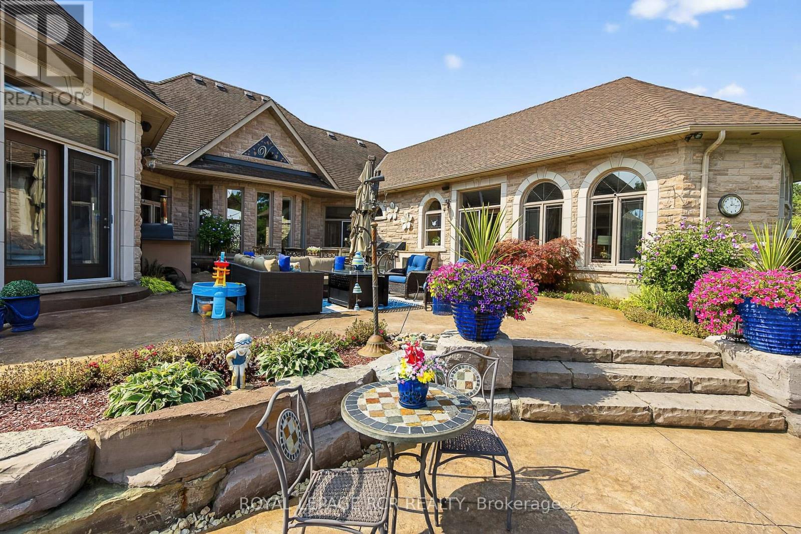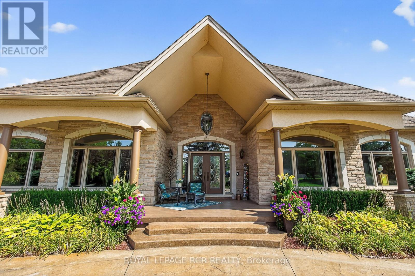 Rare 3923sf Elegant Tuscan Styled Bungalow Estate on a 2.71 acre mature forest lot fabulously located at the end of a quiet court. It is nestled into the prestigious Heritage Hills II enclave, just a couple of minutes south of downtown Uxbridge with direct access to the famous Uxbridge Trails (Country Side Preserve.)This unique architectural beauty surrounds a central back courtyard and is complimented with soaring ceilings, numerous windows, finished basement and 4 car garage. It is nestled into a breathtaking 2.71 acre property backing to forest and the Wooden Sticks Golf Course. This exceptional floor plan is designed for entertaining. The heart of the home is the oversized Tuscan-inspired kitchen, presenting a breakfast bar, a centre island and an entertaining-size huge family room. The sunlit main floor, with numerous walk-outs features, formal dining and living room, library, two wings with primary bedroom suites (which can easily be converted to 3 bedrooms), laundry room and an additional staircase to the basement. The professionally finished basement includes a service kitchen, two bedrooms, two bathrooms, a hobby room, an exceptional wine cellar, custom bar, recreation and games room, and ample storage space. The magnificent resort style backyard paradise with mature trees, formal landscaping, several walk-ways, symmetrical flower beds and manicured hedges has been exceptionally planned and maintained. Enjoy all the vacation features of a free-form inground pool with built-in bar, waterfall, gazebo, pool house with bar, outdoor kitchen, central court yard, lazy river stream, volleyball court, horseshoe pit, vegetable garden, firepit and forest trail. The Heritage Hills Residents often walk or ride into Town through the scenic trails. Welcome to Paradise! **EXTRAS** Fibre Optic Internet. Generator, inground sprinklers, heated floors in 2 basement bedrooms and 4 pc bath, jacuzzi tubs in Primary bath & basement bath. Gazebo, garden shed, pool house. (id:51158)
