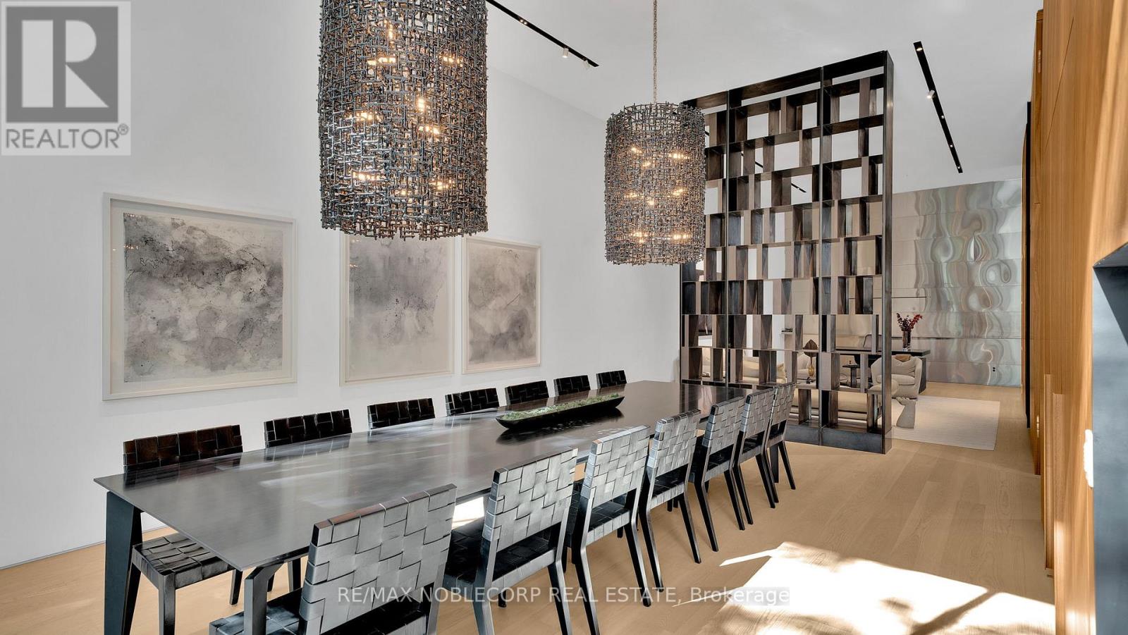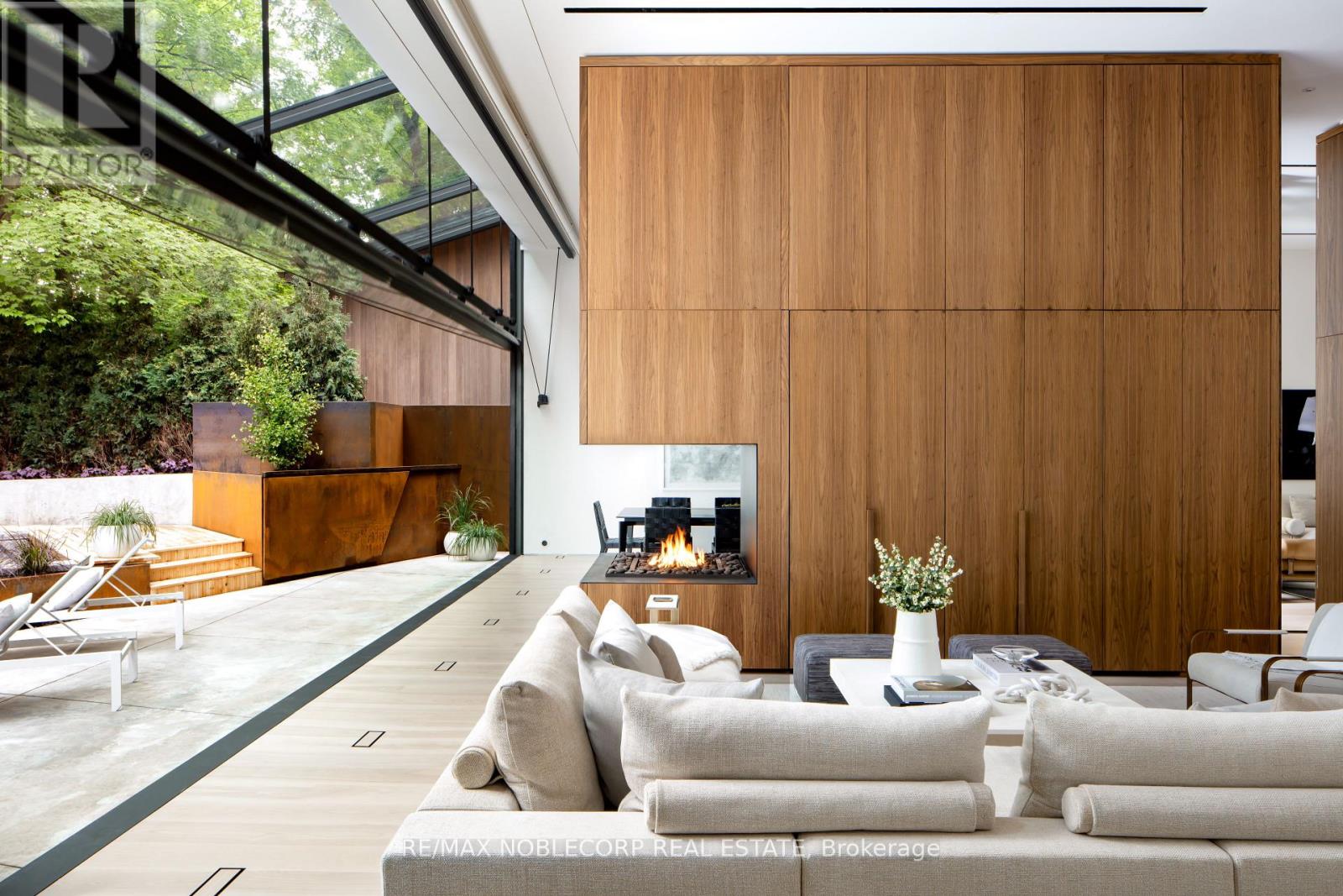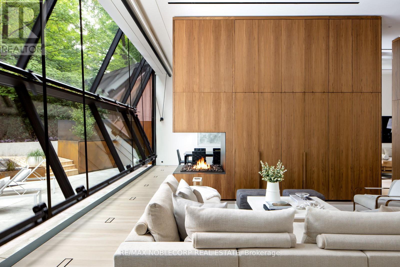 Inspired by the precision and versatility of a Swiss Army knife, this internationally award-winning, architecturally significant residence offers over 6,000 sq.ft. of luxury living on a private, forested ravine cul-de-sac. Designed with dynamic multi-level functionality, its dual wings are connected by a sleek glass bridge and clad in a striking blend of reflective titanium, simulated walnut, and rich black Palisade panels. A descending entrance introduces the main living area where a panoramic fireplace anchors open-concept spaces extending to the outdoors through a dramatic, folding glass hangar door. Every detail is engineered for seamless living and entertaining from the indoor/outdoor dining areas, hidden wine closet, and wet bar to the amenity-rich lower level featuring a full kitchen, gym, and theatre. The primary suite is a true retreat with his-and-hers closets, a spa-inspired ensuite, and a private balcony overlooking the ravine. Outside, a tiered infinity pool, integrated outdoor kitchen, and fire table are enveloped by nature, creating a breathtaking, resort-like oasis. (id:51158)