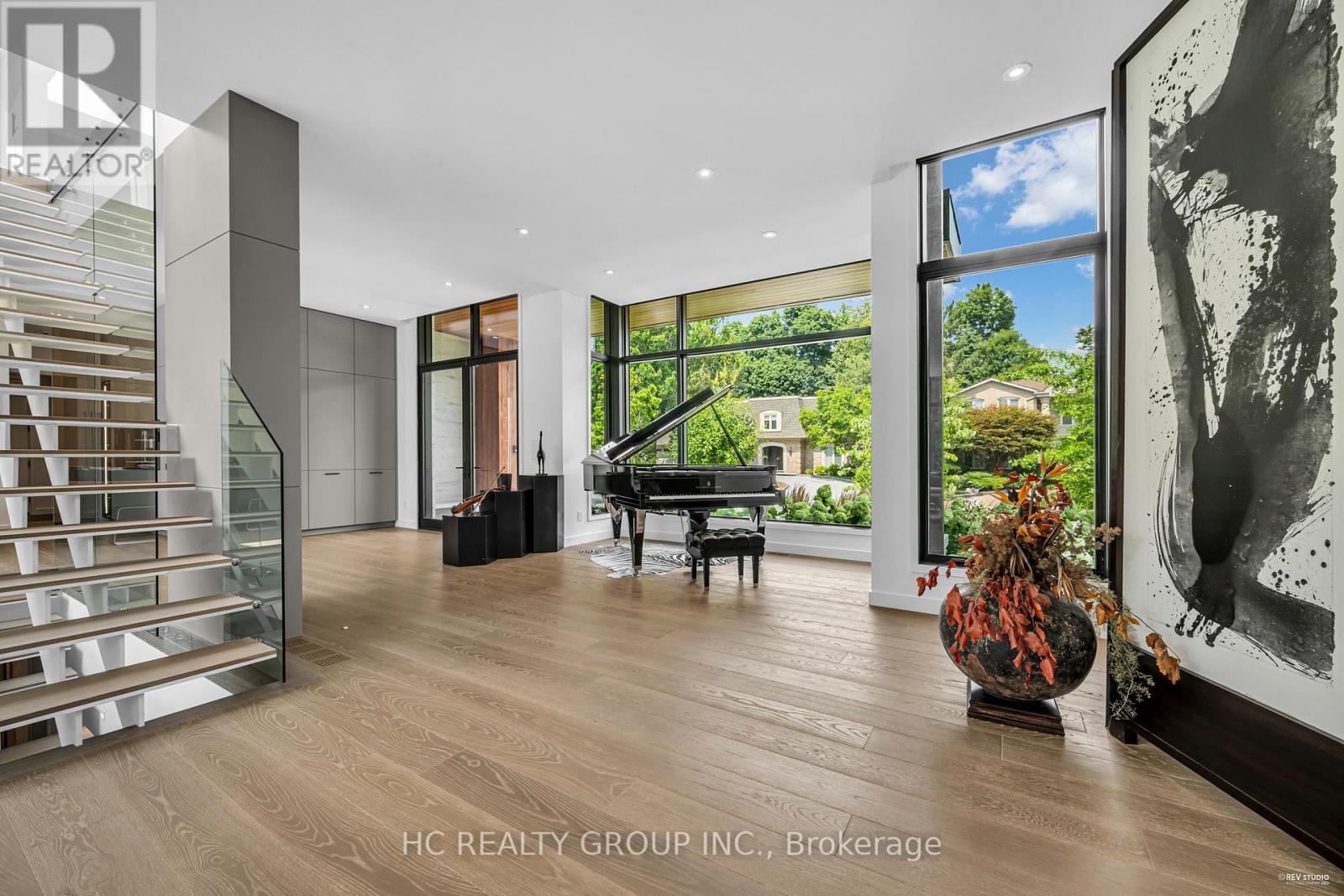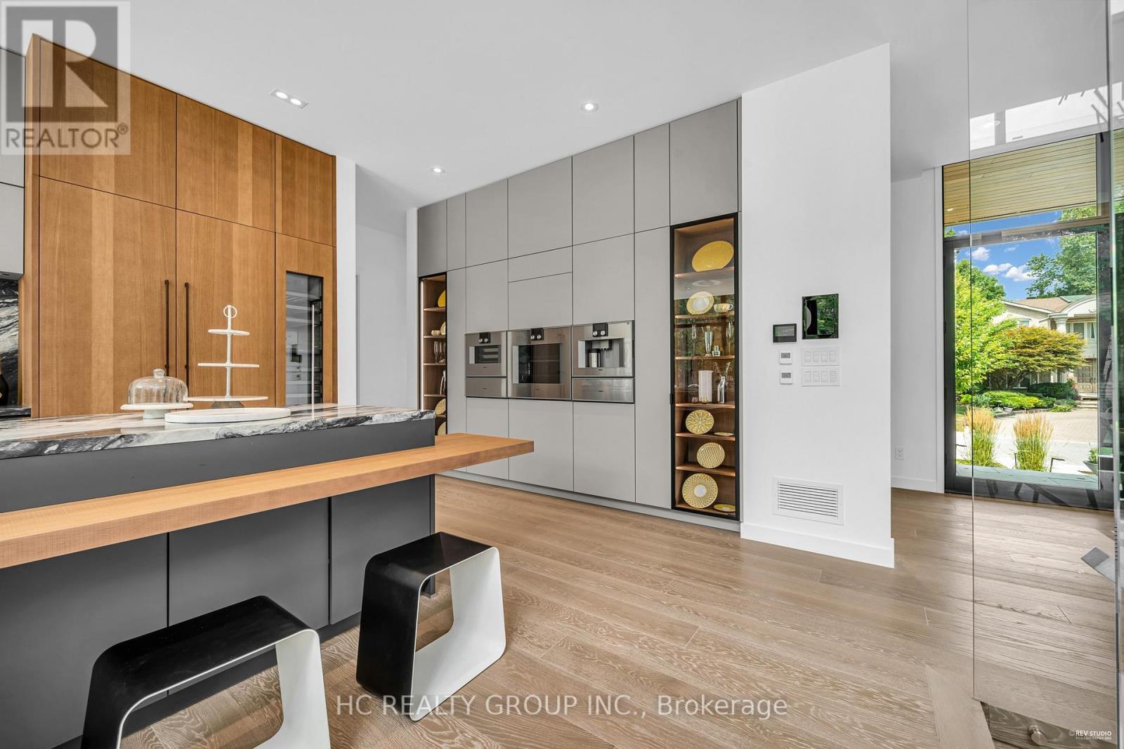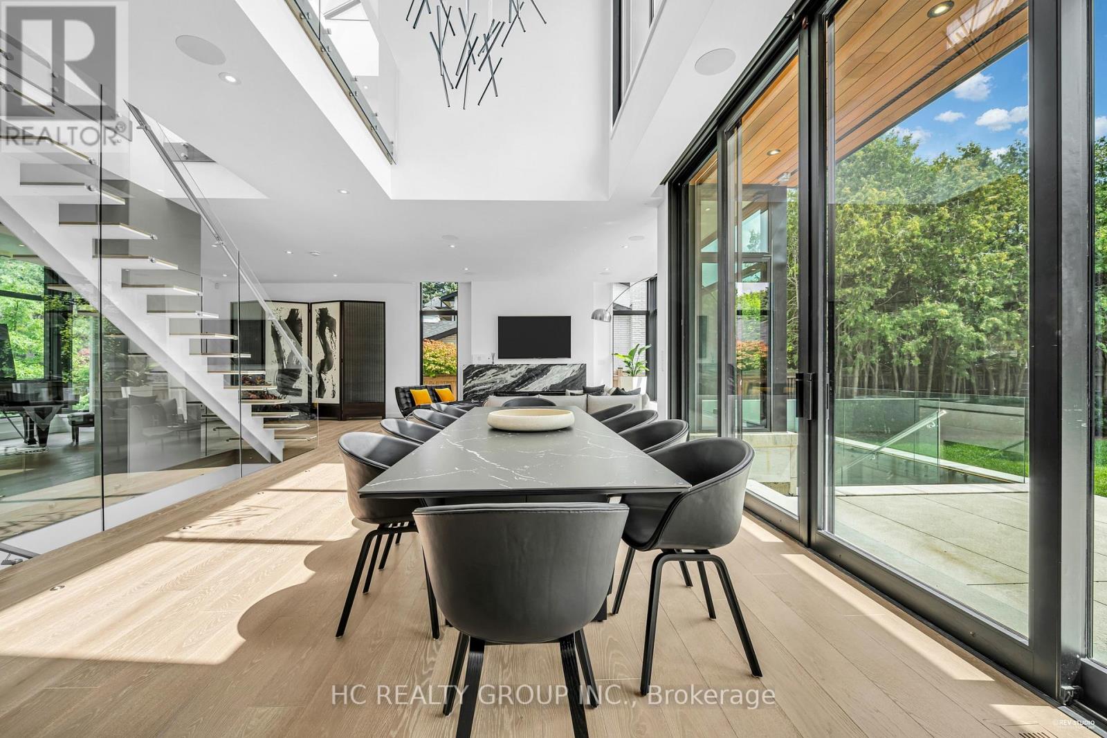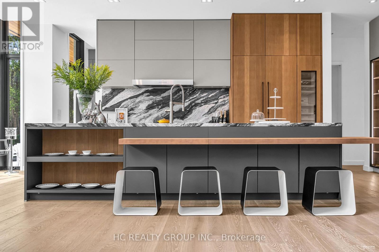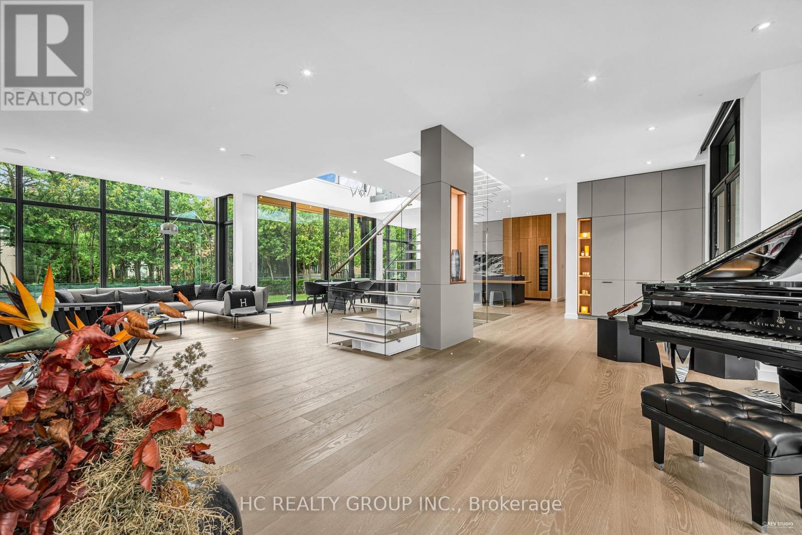 An extraordinary modern estate of distinction, privately set on a tranquil cul-de-sac on a rare 107.34 foot frontage lot, showcasing a refined interplay of glass, stone, and light. Designed by award-winning architect David Small, the residence features polished Ontario white marble, European aluminum-clad wood windows, and professionally landscaped grounds with mature evergreens, integrated outdoor elements, and a full irrigation system. A generous three-car garage with extra-high ceilings accommodates vehicle lifts. The main level offers a guest bedroom and a gourmet kitchen with top-tier appliances and a walk-in pantry, complemented by radiant heated floors, wide-plank European white oak, floor-to-ceiling windows, and a striking 23-foot dining room ceiling with sculptural chandelier. Floating stairs with sleek glass railings elegantly connect all levels. The upper level presents a lounge, office, and four ensuite bedrooms, including a luxurious primary retreat with a spa-inspired ensuite featuring heated floors, dual custom marble-lite floating sinks, and an expansive dressing room with premium custom cabinetry and integrated LED lighting. The lower level is designed for elevated living, featuring a recreation room, climate-controlled wine cellar, nanny suite, and fitness room. Over $500,000 in premium custom German cabinetry throughout the home unifies the interiors with exceptional craftsmanship, modern elegance, and refined luxury. (id:51158)