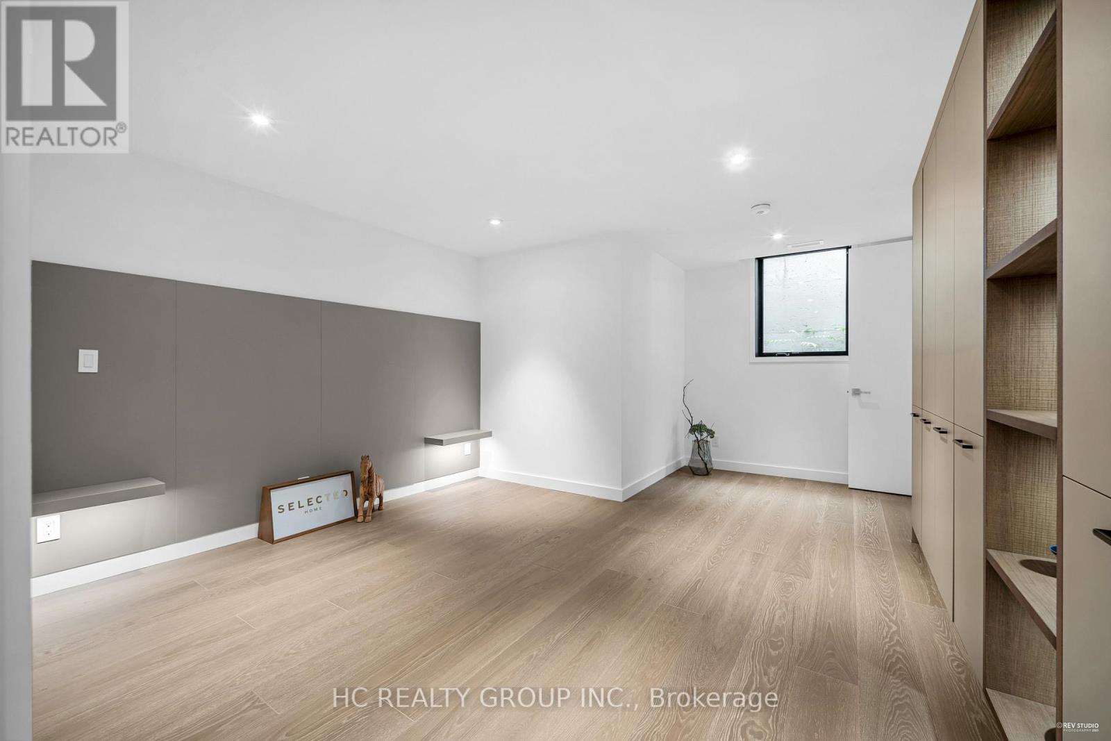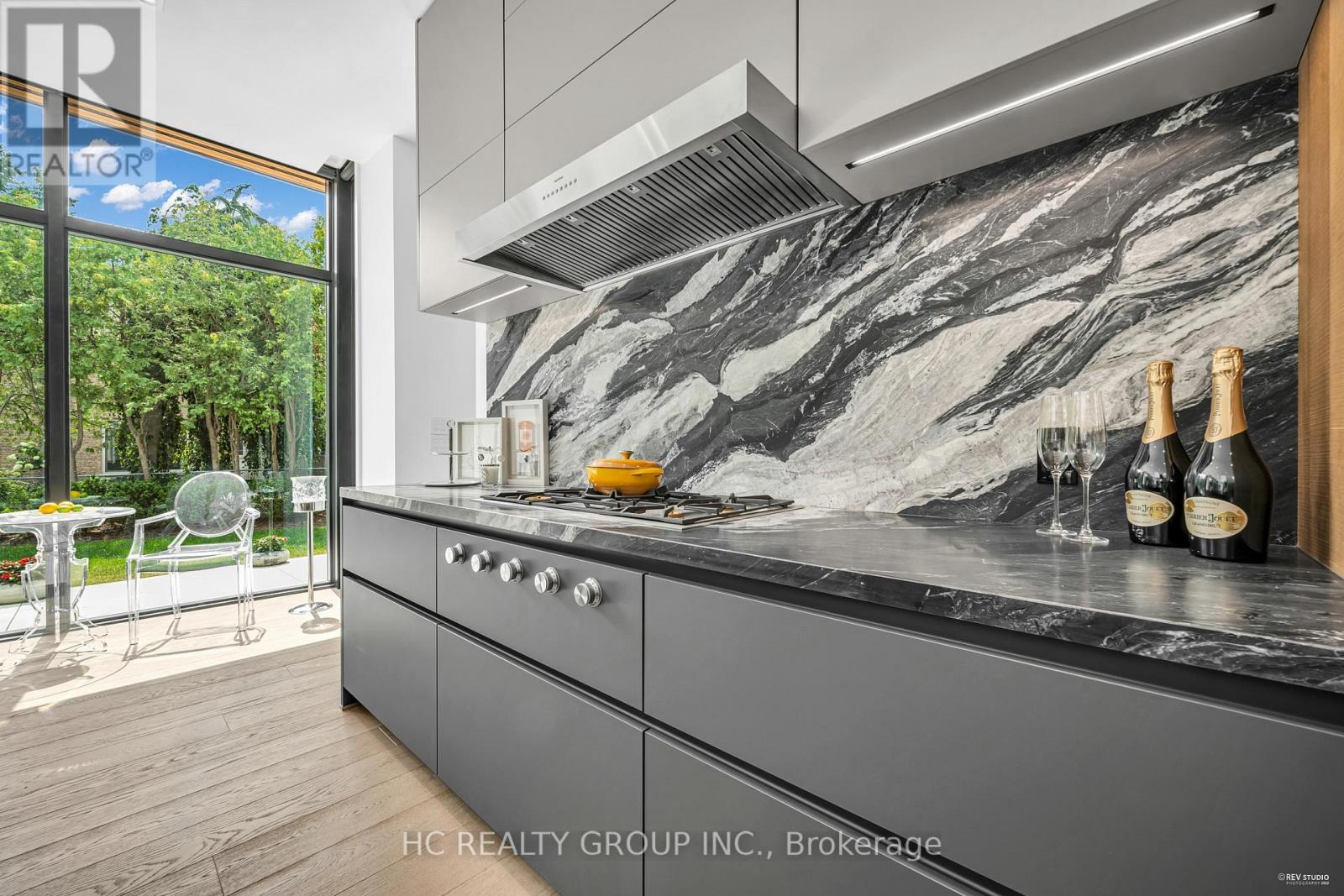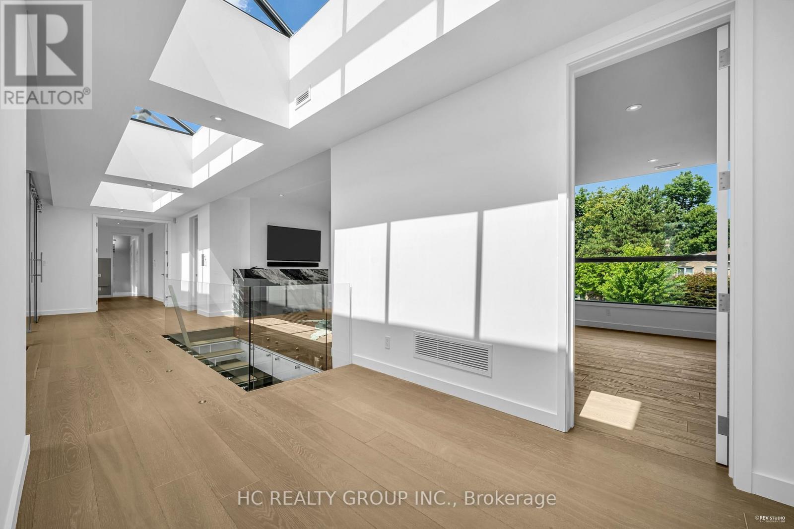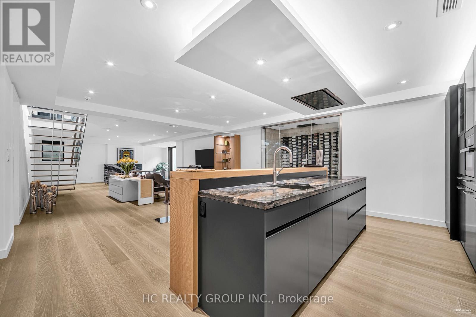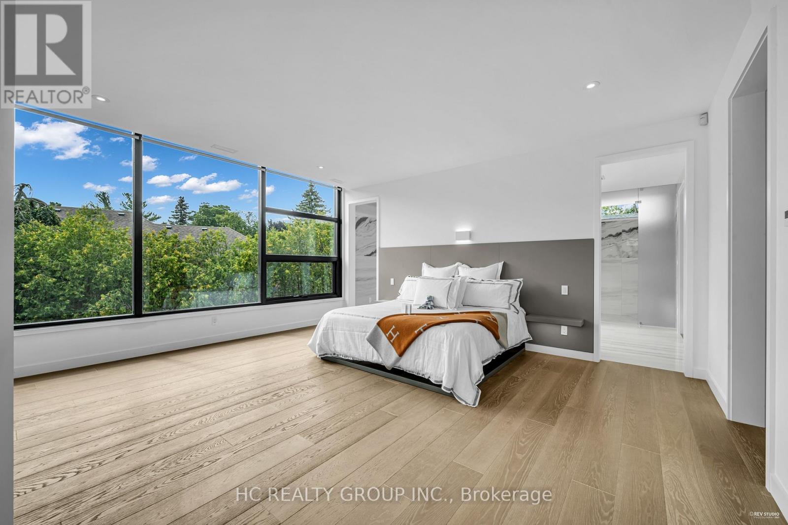 An extraordinary modern estate of distinction, privately set on a tranquil cul-de-sac on a rare 107.34 foot frontage lot, showcasing a refined interplay of glass, stone, and light. Designed by award-winning architect David Small, the residence features polished Ontario white marble, European aluminum-clad wood windows, and professionally landscaped grounds with mature evergreens, integrated outdoor elements, and a full irrigation system. A generous three-car garage with extra-high ceilings accommodates vehicle lifts. The main level offers a guest bedroom and a gourmet kitchen with top-tier appliances and a walk-in pantry, complemented by radiant heated floors, wide-plank European white oak, floor-to-ceiling windows, and a striking 23-foot dining room ceiling with sculptural chandelier. Floating stairs with sleek glass railings elegantly connect all levels. The upper level presents a lounge, office, and four ensuite bedrooms, including a luxurious primary retreat with a spa-inspired ensuite featuring heated floors, dual custom marble-lite floating sinks, and an expansive dressing room with premium custom cabinetry and integrated LED lighting. The lower level is designed for elevated living, featuring a recreation room, climate-controlled wine cellar, nanny suite, and fitness room. Over $500,000 in premium custom German cabinetry throughout the home unifies the interiors with exceptional craftsmanship, modern elegance, and refined luxury. (id:51158)