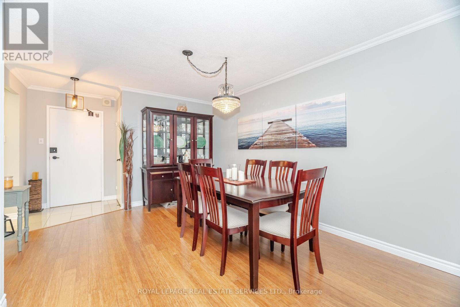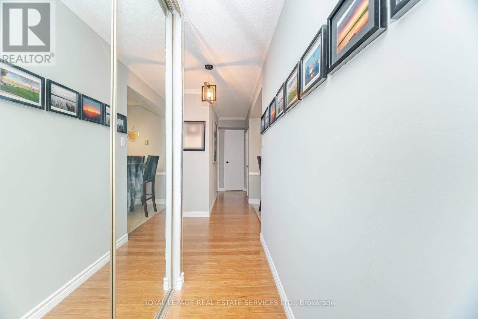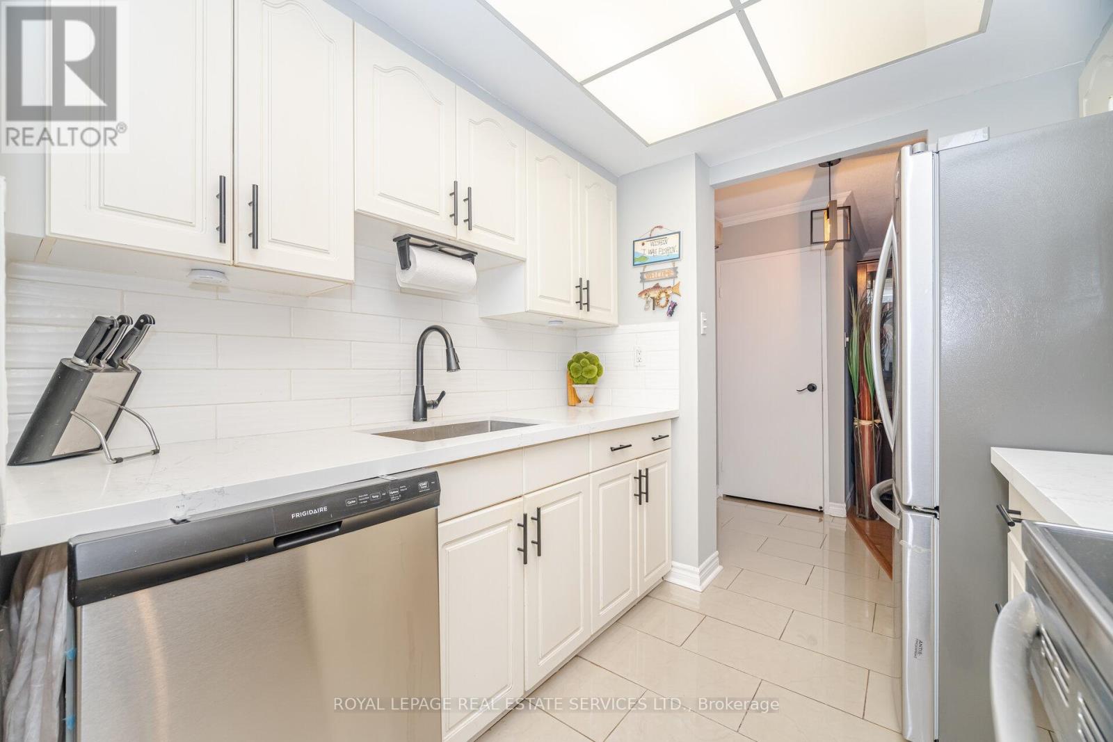 Discover this beautifully updated and spacious 2-bedroom plus den residence featuring two full 4-piece bathrooms and a modern kitchen complete with brand-new appliances, a custom countertop, and a stylish backsplash. The versatile den provides flexible space - ideal for a family room, home office, or additional bedroom. Elegant bamboo hardwood flooring flows throughout, adding warmth and sophistication. Ensuite laundry and an included locker offer everyday convenience. Nestled on a beautifully landscaped 4-acre property surrounded by a serene creek, this well managed, pet-free building provides all-inclusive utilities (including cable and internet) and an impressive range of amenities - walking trails, an outdoor pool, and tennis courts. Additional highlights include 2 coveted underground parking spaces. Relax on your private balcony while taking in peaceful park and city views, or retreat to the spacious primary bedroom featuring a walk-in closet and ensuite bath. Over the past decade, the building has undergone extensive renovations, including updates to the underground parking, access roads, cabana, lobby, hallways, elevators, balconies, and windows - ensuring both comfort and lasting value. Perfectly located near Cooksville GO Station, Square One, major highways, and the hospital, this stunning condo seamlessly blends modern style, convenience, and tranquility. (id:51158)