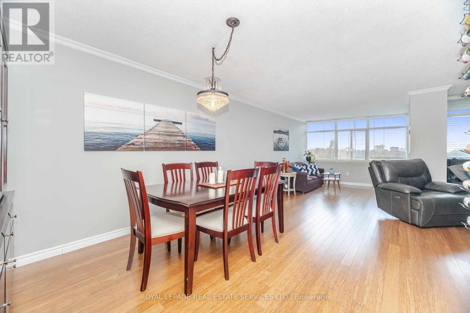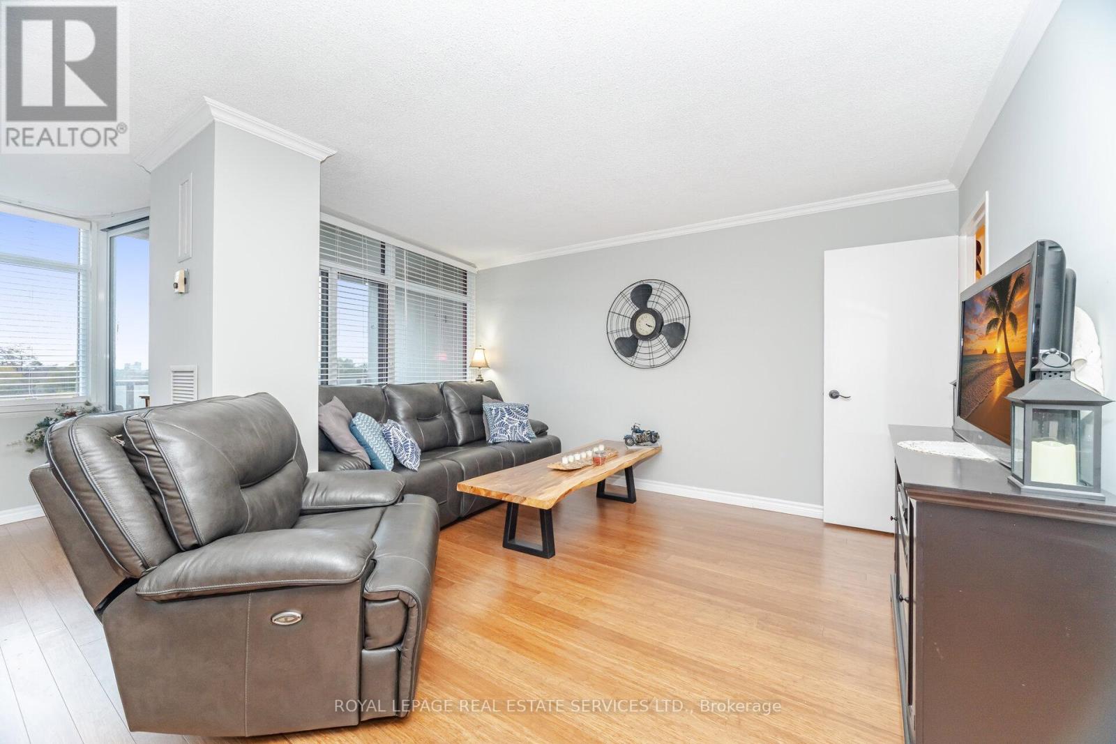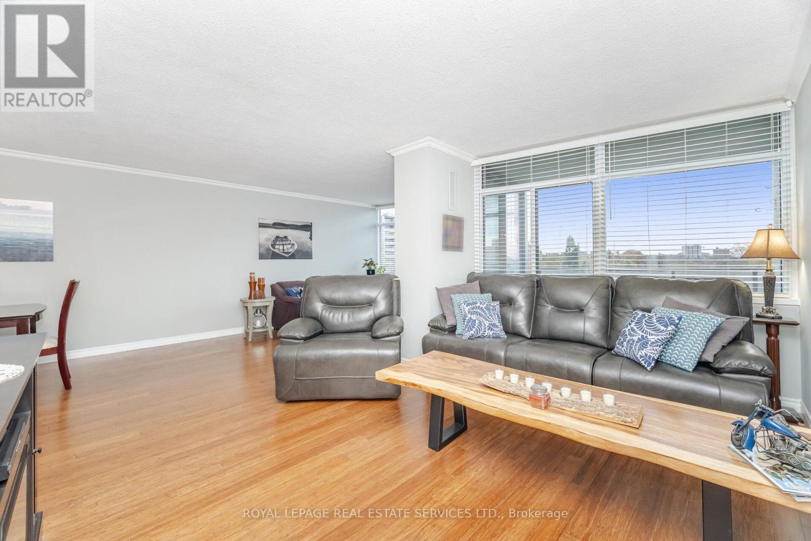 Discover this beautifully updated and spacious 2-bedroom plus den residence featuring two full 4-piece bathrooms and a modern kitchen complete with brand-new appliances, a custom countertop, and a stylish backsplash. The versatile den provides flexible space - ideal for a family room, home office, or additional bedroom. Elegant bamboo hardwood flooring flows throughout, adding warmth and sophistication. Ensuite laundry and an included locker offer everyday convenience. Nestled on a beautifully landscaped 4-acre property surrounded by a serene creek, this well managed, pet-free building provides all-inclusive utilities (including cable and internet) and an impressive range of amenities - walking trails, an outdoor pool, and tennis courts. Additional highlights include 2 coveted underground parking spaces. Relax on your private balcony while taking in peaceful park and city views, or retreat to the spacious primary bedroom featuring a walk-in closet and ensuite bath. Over the past decade, the building has undergone extensive renovations, including updates to the underground parking, access roads, cabana, lobby, hallways, elevators, balconies, and windows - ensuring both comfort and lasting value. Perfectly located near Cooksville GO Station, Square One, major highways, and the hospital, this stunning condo seamlessly blends modern style, convenience, and tranquility. (id:51158)
