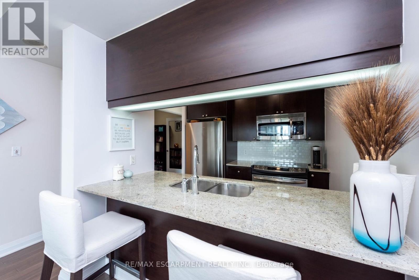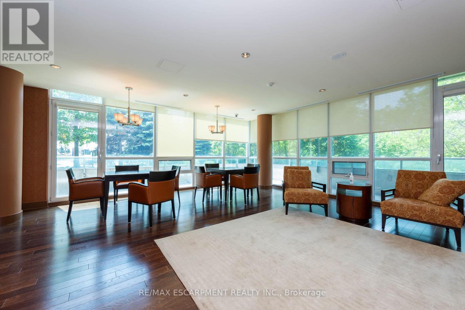 Located at the Stonebrook Condominiums in the heart of Clarkson - an exceptional, move-in ready 1 Bedroom + Den suite with a highly functional layout and modern finishes throughout. This bright, sun-filled residence features 9' ceilings, hardwood flooring, upgraded lighting, and generous storage, creating a warm and inviting living space. The contemporary kitchen is thoughtfully designed with premium stainless steel appliances, granite countertops, a stylish backsplash, and a breakfast bar overlooking the open-concept living and dining area-perfect for everyday living and effortless entertaining. fStep out onto the spacious private balcony and take in the beautiful south-facing views, ideal for morning coffee or unwinding in the evening. The spacious primary bedroom offers large windows, a double-door closet, and ensuite access to a spa-inspired 4-piece bathroom featuring a modern vanity, tiled tub, and separate glass-enclosed shower. The versatile den, enclosed with elegant glass doors, is perfect for a home office, reading nook, or hobby space. Finished in designer tones, this suite reflects true pride of ownership. Enjoy resort-style amenities including a fitness centre, indoor pool, sauna, party room, theatre, games room, guest suite, and 24-hour concierge. *EXTRAS* Bell cable and internet are included in the maintenance fees. Parking and a locker included. Ideally located just steps to shops, restaurants, parks, schools, and Clarkson GO Station, with quick access to major highways. This is the perfect blend of luxury, convenience, and lifestyle in one of Clarkson's most sought-after communities. (id:51158)