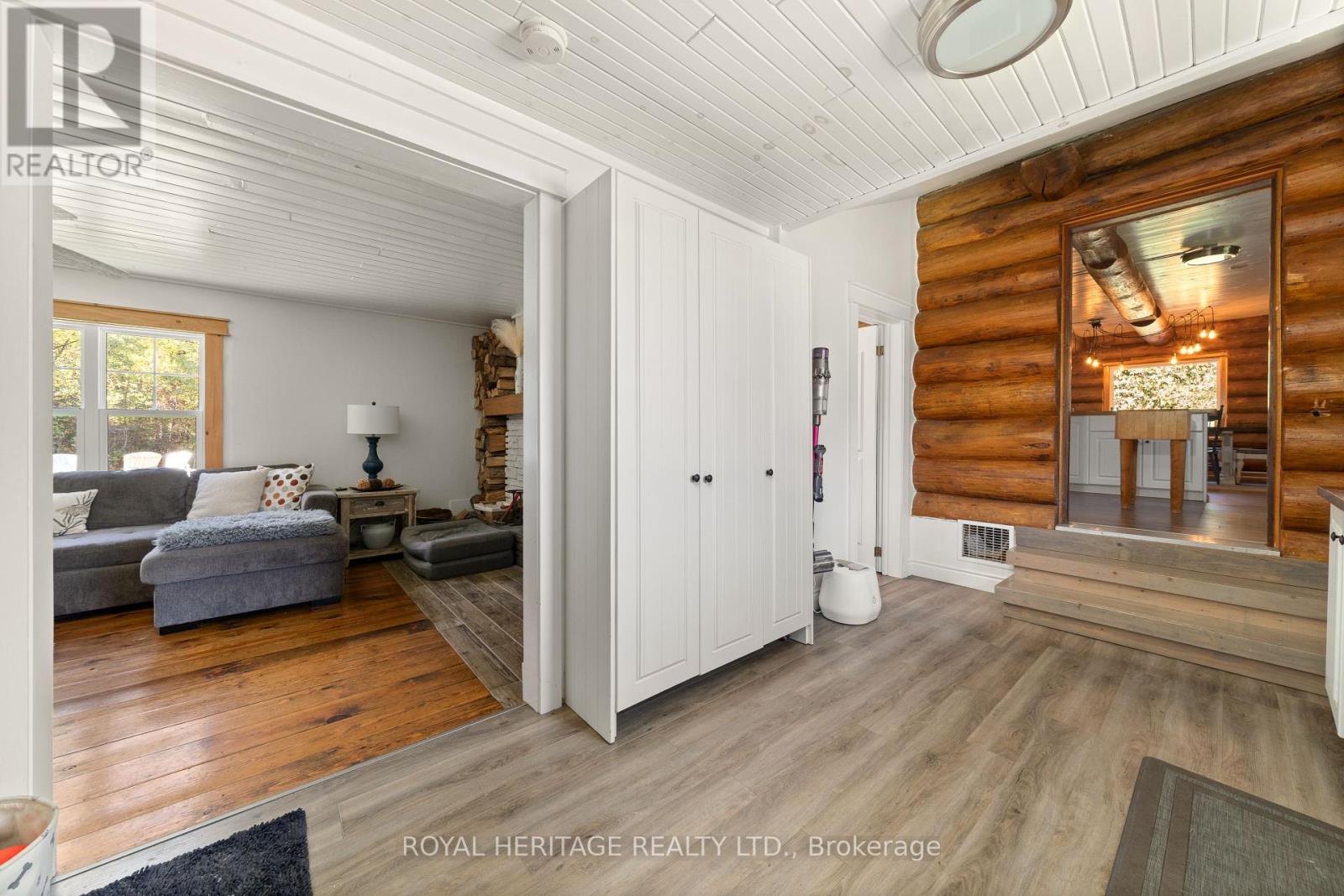 Absolutely stunning 4+2 bath log home set on 4.5 acres of private paradise. This one-of-a-kind property offers the perfect balance of rustic charm and modern comfort. Inviting heated entry led to an open concept living area with warm exceptional log craftsmanship of exposed wood beams and timeless pine hardwood. The main floor features a bright and cozy kitchen, dining area, and large living room. A beautiful main-floor bedroom, second full bathroom, and living room with a wood burning stove inserted in a stone surround. Sunken laundry room completes the level, along with direct access to a fully fenced yard ideal for pets or horses to run free. There is a brand new firepit for those warm star gazing nights. Three generously sized bedrooms and a full bathroom awaits upstairs. Two of the bedrooms include private balconies, creating the perfect spot to enjoy peaceful mornings or evening sunsets. Outside is a dream: gravel circular driveway, workshop with hydro, large two-Storey pole barn with loft & hydro, woodshed, generator shed hook-up close to the main house. Offered fully turnkey, this home comes complete with indoor and outdoor furnishing, smart lock access and strong Wi-Fi, you'll enjoy both convenience and comfort in your private paradise. (id:51158)