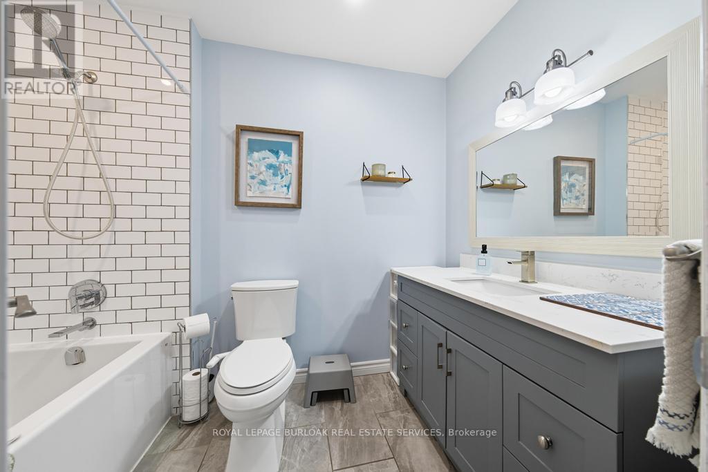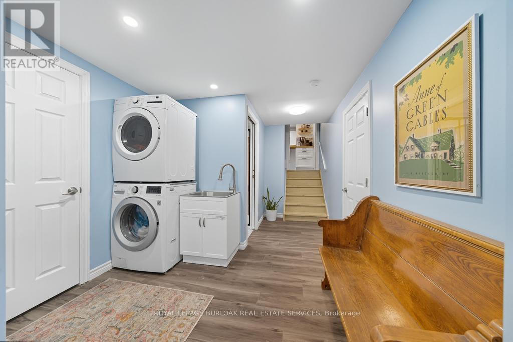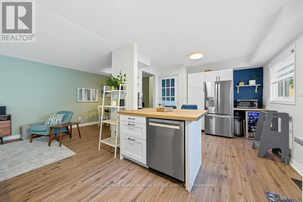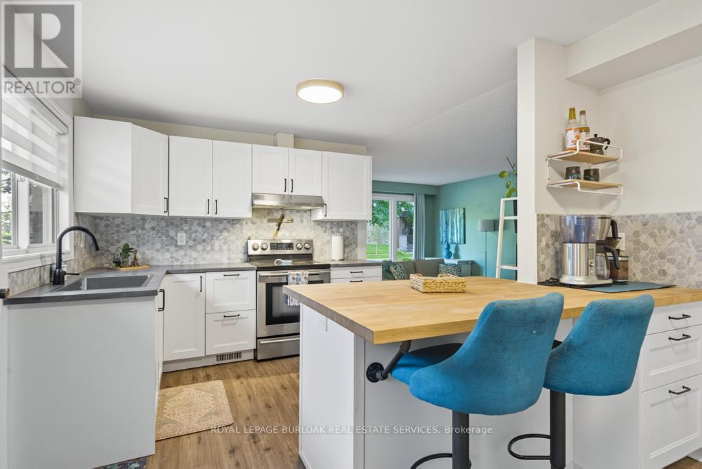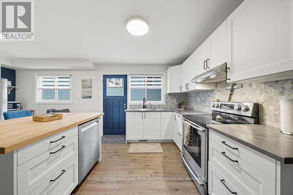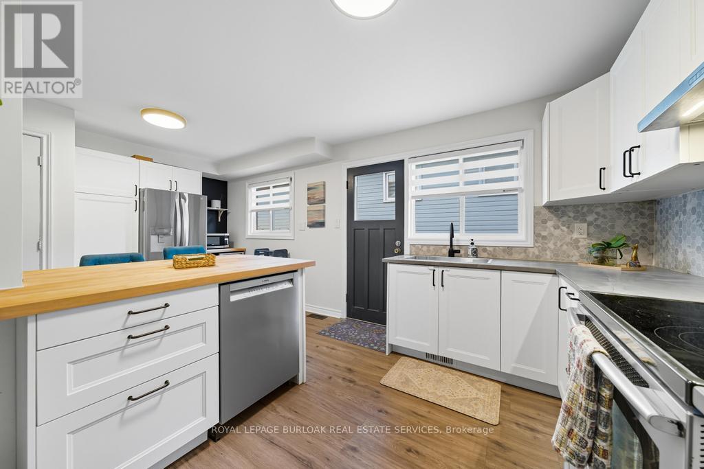 Beautifully renovated 3 bedroom, 2 full bath semi-detached home in the heart of downtown Burlington. Featuring a modern open-concept kitchen with butcher block island, coffee nook, loads of counter and cupboard space, updated bathrooms, new flooring, and finished basement with renovated laundry room. The spacious primary bedroom offers built-in closets and a walkout to the backyard. New interior doors and hardware, upgraded windows( 2019), furnace ( 2018), new soffits and eaves (2024) . The fully fenced yard is complete with a patio to sit and enjoy outdoor living and plenty of grass for kids and pets to play in. This beauty is bright and welcoming on every level. Just steps to the lake, Spencer Smith Park, restaurants, shops, and all that downtown living has to offer. (id:51158)