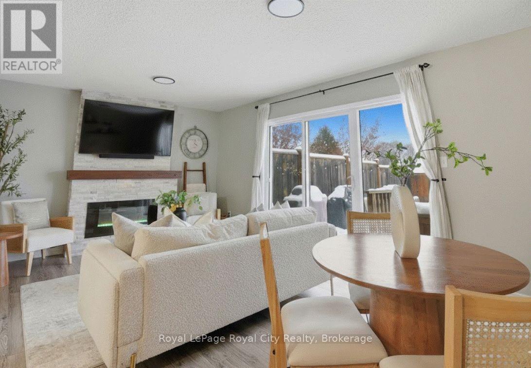 77 Severn Drive is strategically located in Guelph's desirable East End, offering protected greenspace views to the front and back. This open-concept FREEHOLD townhome (no condo fees) offers the functionality of a detached house combined with the peaceful setting of a quiet street. The inviting cobblestone walkway leads you into a home where the main floor shines with an open-concept layout integrating a well-sized eat-in kitchen with a bright, comfortable living area, featuring a custom fireplace. Oversized windows and a sliding back door maximize natural light and open onto a private backyard setting, complete with a spacious deck and fully fenced yard; enjoy the tranquility provided by the established perennial garden and the beautiful protected greenspace views. The upper floor features a spacious primary suite with an expansive closet complete with sliding barn doors and built-in shelving, a full 4-piece bathroom, and two additional bedrooms overlooking the nearby nature area. The finished lower level adds immediate bonus living space with a large recreation room and a modern three-piece bathroom. This FREEHOLD townhome is an excellent choice for first-time buyers and growing families, providing substantial local convenience: it is within walking distance to multiple parks and excellent schools (including a French Immersion option). Residents enjoy immediate access to the Watson Creek Trails plus local amenities like Eastview Community Park (splash pad, disc golf, pump track) and the East End Guelph Public Library. The Victoria Road Recreation Centre (pool, arena) is a quick drive away, and the property is located a short drive from the planned Guelph Innovation District, ensuring strong future growth. This property delivers a unique blend of established community convenience and quiet natural setting privacy. Image Disclaimer: Some images have been digitally enhanced. (id:51158)