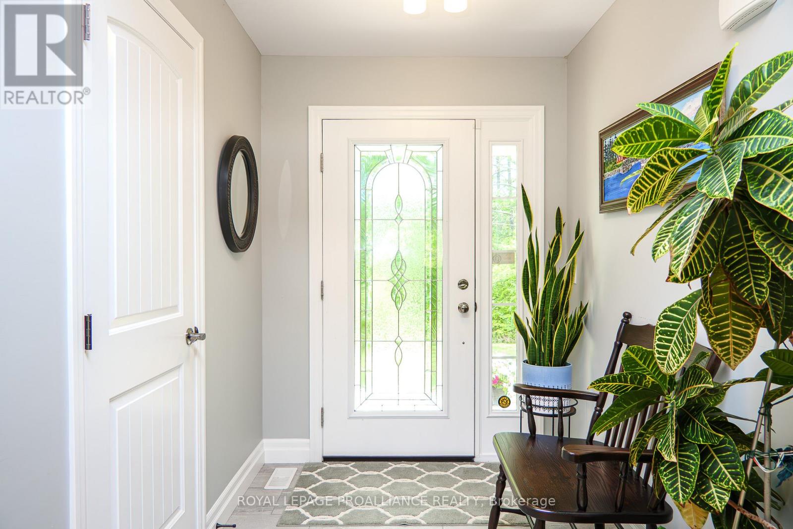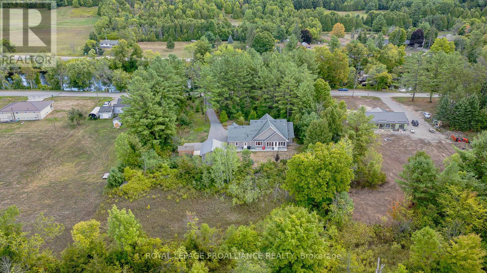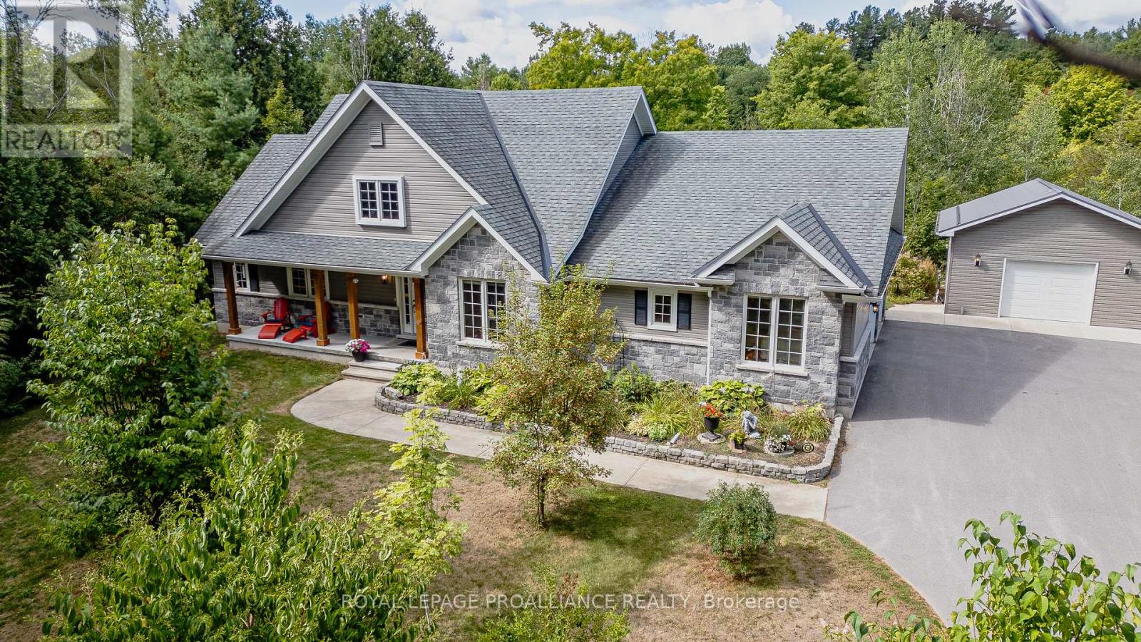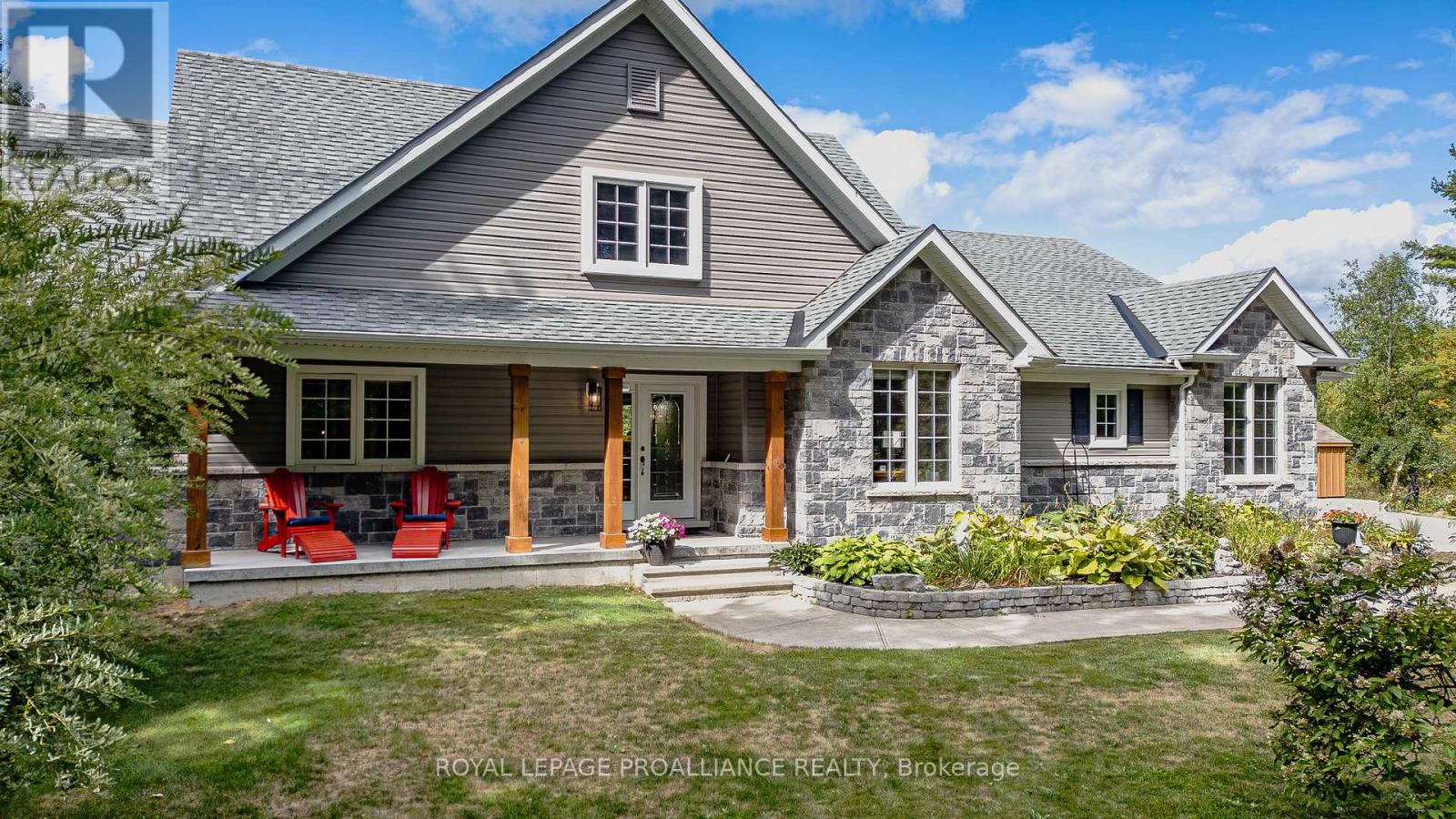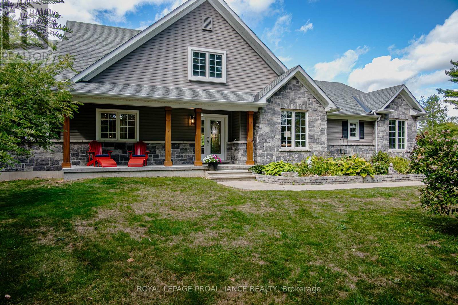 Absolutely stunning 2016 bungalow offering 1925sqft on MAIN FLOOR. Better value than new, this pristine home is in impeccable shape & offers all the expensive updates & features that are extra with new construction. Fully paved drive with parking for 8+ cars, sep. detached dbl garage with hydro, insulated attached dbl garage with electric car charger, 12KW generator, gazebo, storage shed, alarm system, window coverings, appliances, owned HWT, water softener, UV light & much more. Situated on a gorgeous 1.3acre lot, surrounded by trees for the ultimate in privacy. Stunning views of the Moira River out front. Long paved drive with security gate leads to a landscaped front yard offering a variety of fruit trees, walkways & shrubbery. The detached garage & storage shed are perfect for those looking to enjoy space for cars, boats or keep as a workshop. Around back is a relaxing screened-in gazebo overlooking the serene yard & mature trees. A covered front porch welcomes you home & is a great place to enjoy your morning coffee. Inside, this spacious home is full of vaulted ceilings & offers a well laid out, open floor plan including a 240sqft 4-season sunroom. In the centre of the home is a cozy living rm, highlighted by a floor to ceiling gas F/P with tile mantel AND tall vaulted ceiling with decorative wood beams. Kitchen boasts beautiful grey cabinets to the ceiling featuring crown moulding & wine rack. Other kitchen features incl: large walk-in pantry, granite counters, tile backsplash, peninsula island with seating & formal dining rm. Spacious Primary suite also has a vaulted ceiling plus large WIC with shelving & spa-like ensuite bath with dbl sinks, quartz counters, separate toilet area & walk-in glass/tile shower. 3 bdrms on main floor (front bdrm used as office) & 2 full baths. Other features incl: solid Ash hdwd flooring, nat. gas heat, C/Air, M/F laundry with sink, R50 insulation in attic, stone & vinyl exterior & drilled well producing 15GPM. Move right in. (id:51158)