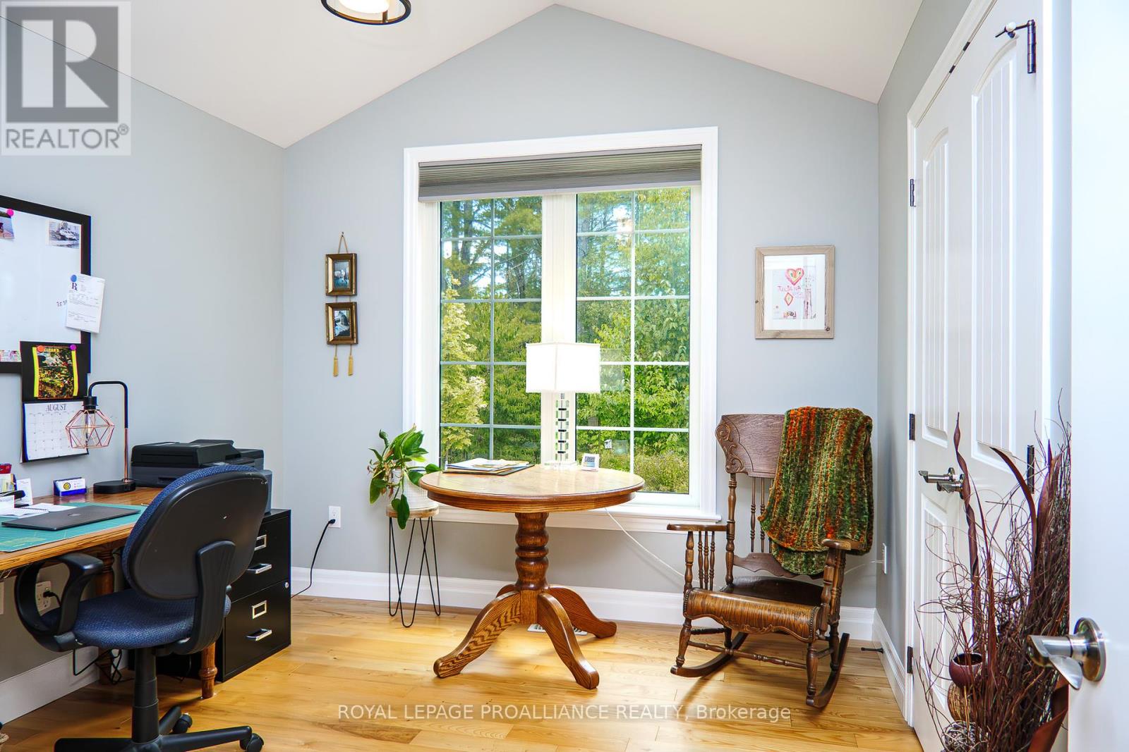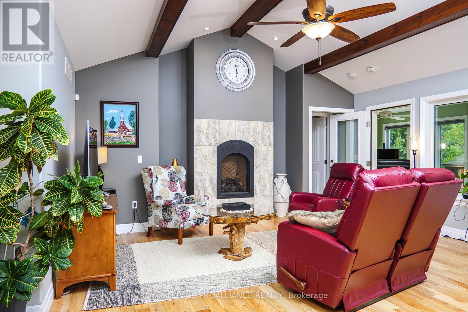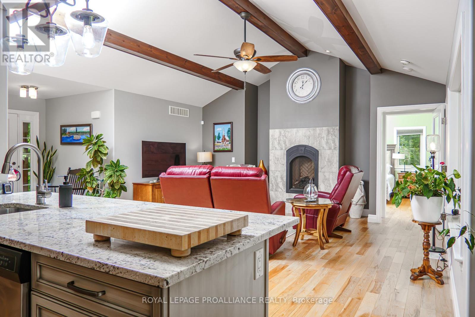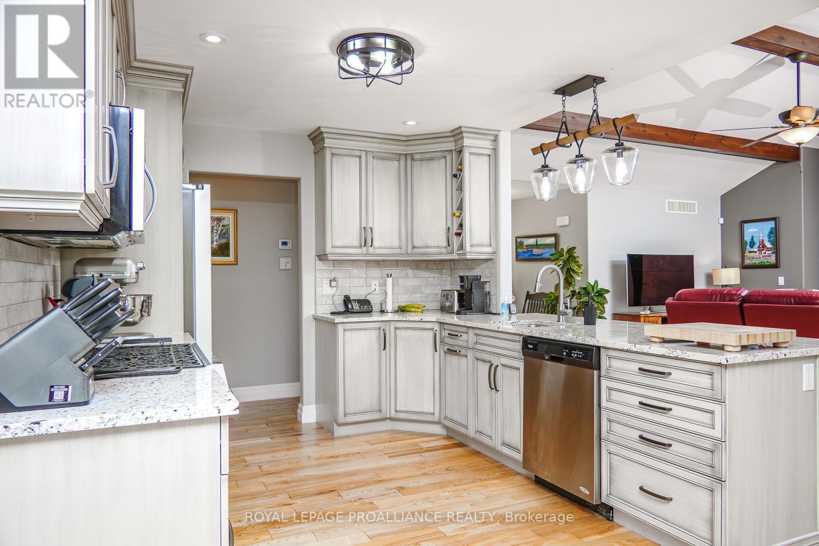 Absolutely stunning 2016 bungalow offering 1925sqft on MAIN FLOOR. Better value than new, this pristine home is in impeccable shape & offers all the expensive updates & features that are extra with new construction. Fully paved drive with parking for 8+ cars, sep. detached dbl garage with hydro, insulated attached dbl garage with electric car charger, 12KW generator, gazebo, storage shed, alarm system, window coverings, appliances, owned HWT, water softener, UV light & much more. Situated on a gorgeous 1.3acre lot, surrounded by trees for the ultimate in privacy. Stunning views of the Moira River out front. Long paved drive with security gate leads to a landscaped front yard offering a variety of fruit trees, walkways & shrubbery. The detached garage & storage shed are perfect for those looking to enjoy space for cars, boats or keep as a workshop. Around back is a relaxing screened-in gazebo overlooking the serene yard & mature trees. A covered front porch welcomes you home & is a great place to enjoy your morning coffee. Inside, this spacious home is full of vaulted ceilings & offers a well laid out, open floor plan including a 240sqft 4-season sunroom. In the centre of the home is a cozy living rm, highlighted by a floor to ceiling gas F/P with tile mantel AND tall vaulted ceiling with decorative wood beams. Kitchen boasts beautiful grey cabinets to the ceiling featuring crown moulding & wine rack. Other kitchen features incl: large walk-in pantry, granite counters, tile backsplash, peninsula island with seating & formal dining rm. Spacious Primary suite also has a vaulted ceiling plus large WIC with shelving & spa-like ensuite bath with dbl sinks, quartz counters, separate toilet area & walk-in glass/tile shower. 3 bdrms on main floor (front bdrm used as office) & 2 full baths. Other features incl: solid Ash hdwd flooring, nat. gas heat, C/Air, M/F laundry with sink, R50 insulation in attic, stone & vinyl exterior & drilled well producing 15GPM. Move right in. (id:51158)