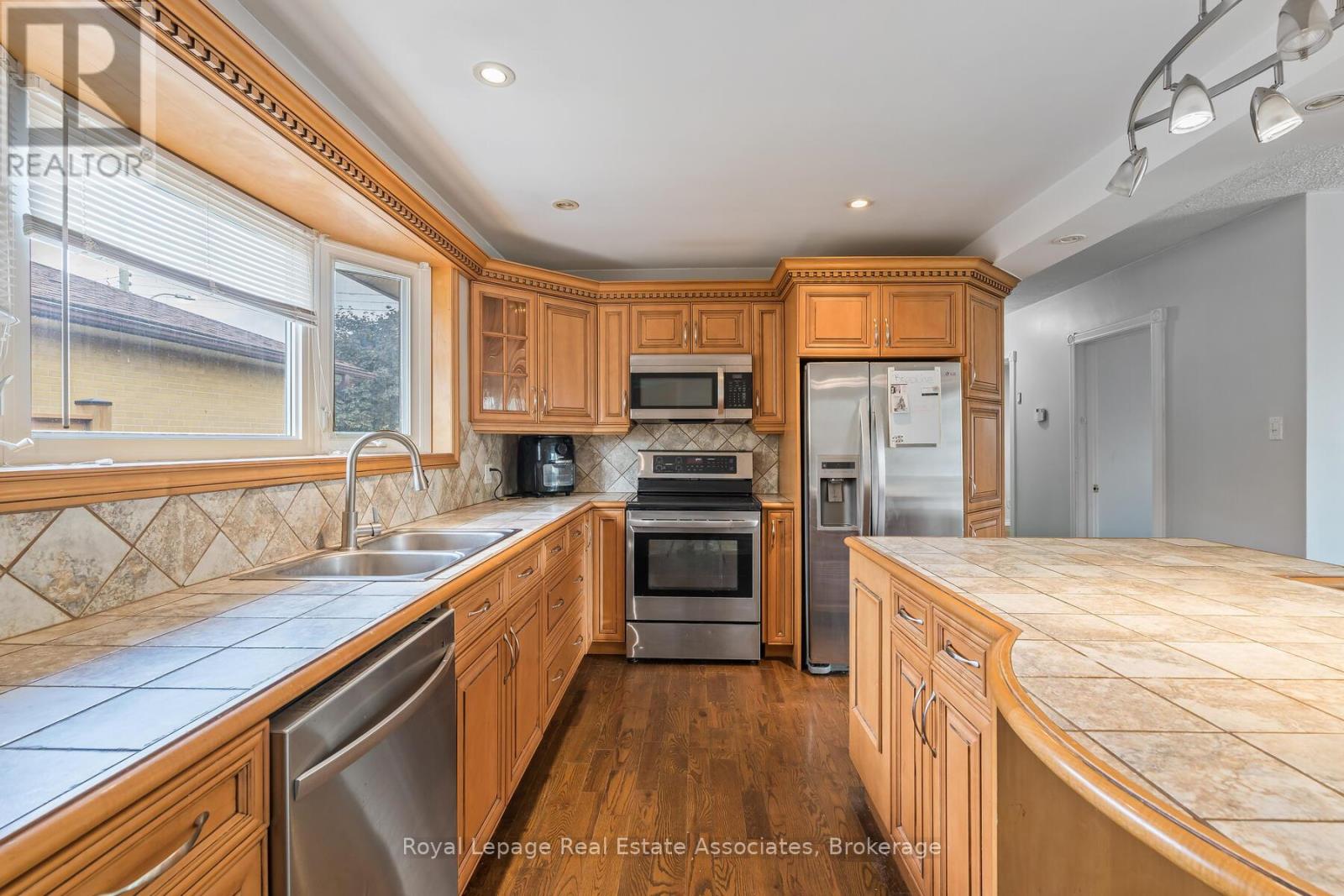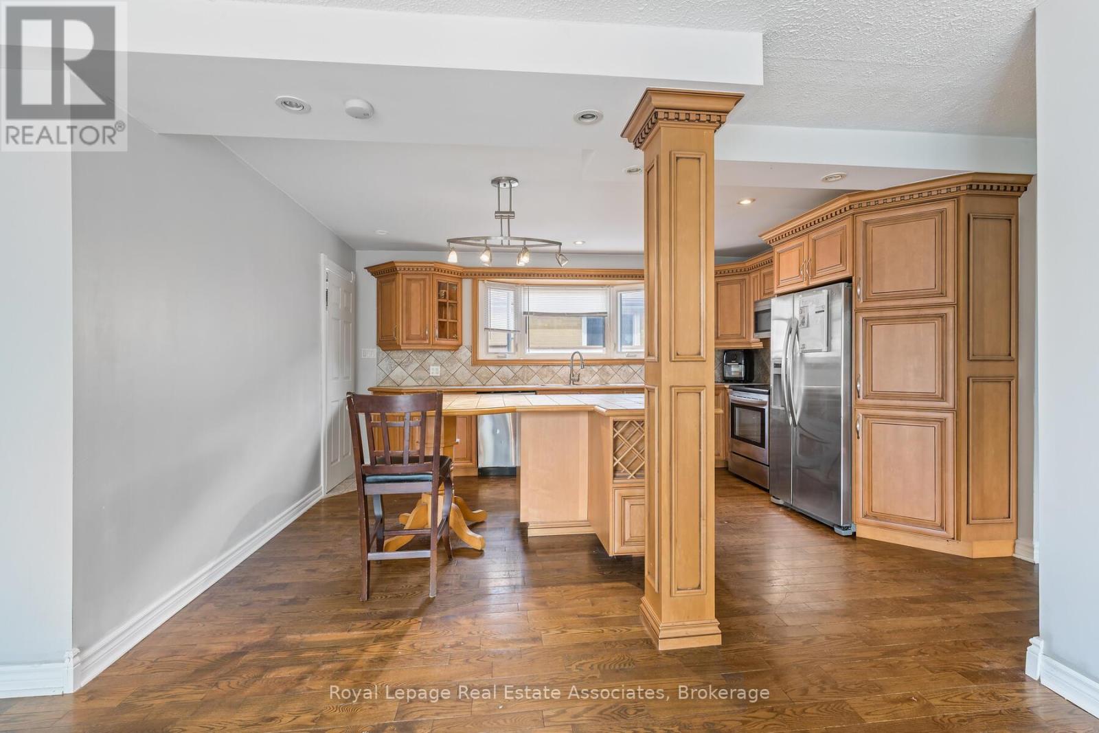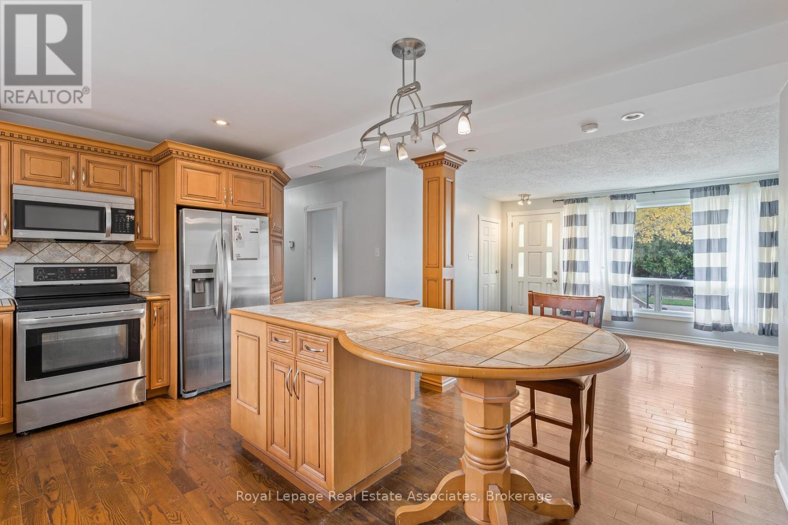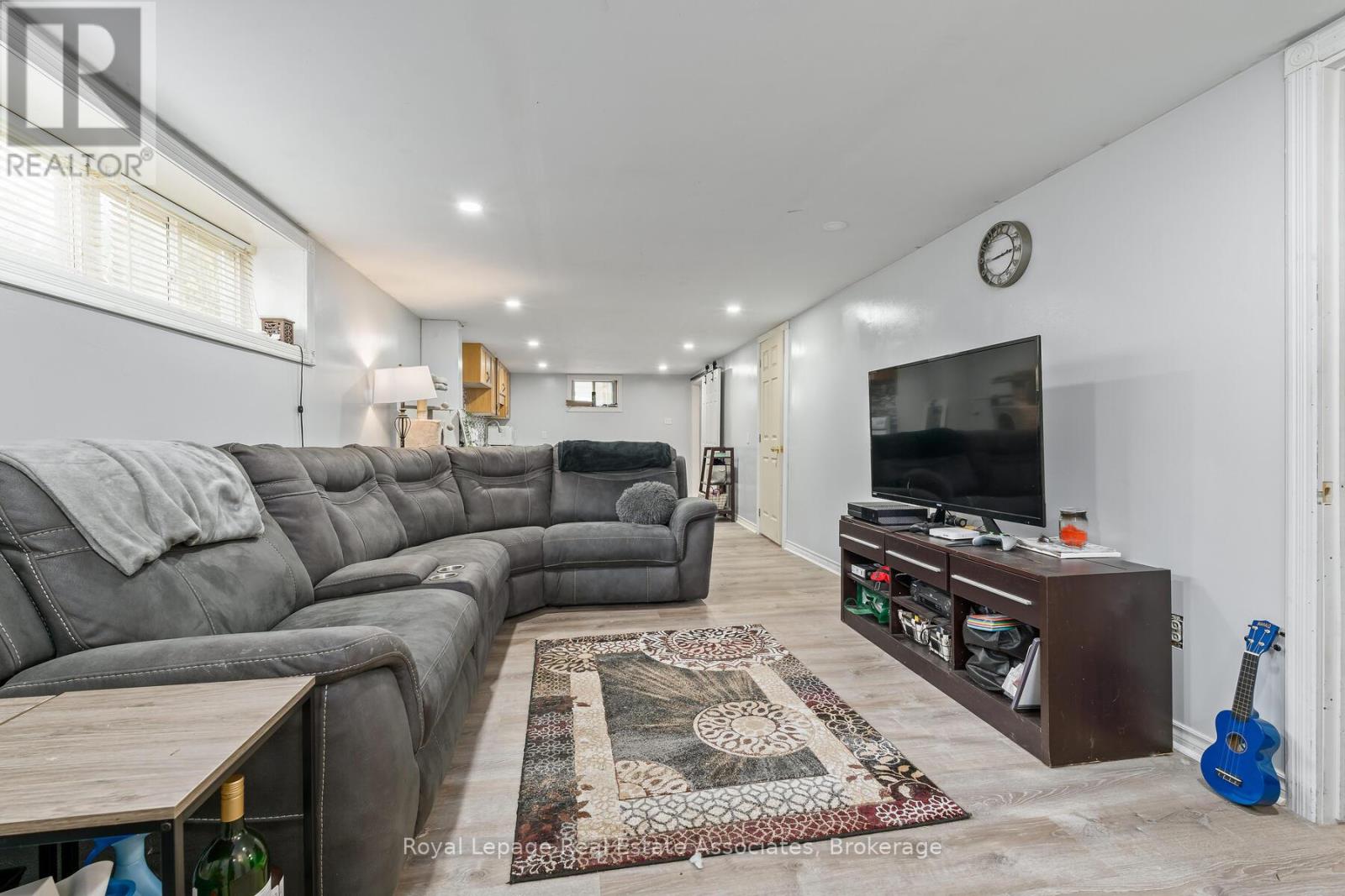 Step inside a bright detached bungalow in family friendly neighborhood in Georgetown. Offering 3+1 bedrooms and 2 bathrooms, this stunning home features an open-concept living room with a large window and an updated kitchen with hardwood flooring, a centre island with seating, stainless steel appliances, pot lights, a bay window, a double sink, and ample cabinetry. Three comfortable bedrooms share a 3-piece bathroom, including a primary bedroom with a walkout to a private side yard. The finished lower level adds lots of extra living space and includes a second kitchenette, rec room with a gas fireplace, a 4th bedroom, a second 3-piece bathroom, a laundry area, extra storage, luxury vinyl flooring, and above-grade windows. Enjoy access to a second private side yard from the lower level. Parking for two cars on the double-wide driveway. Located close to schools, parks, and shopping, this home offers everyday convenience in a highly sought-after Georgetown neighbourhood. (id:51158)
