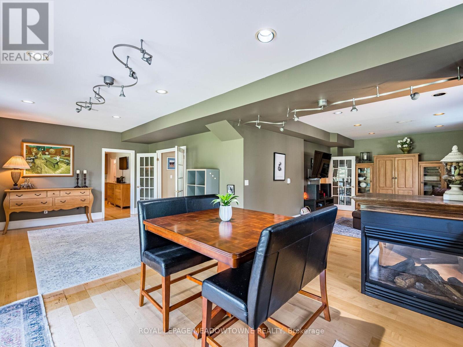 Welcome to 8 Deer Run an exceptional property in a sought-after executive estate subdivision. This private retreat sits on nearly 4 acres, including 1 acre of protected conservation. This beautifully maintained home offers approx. 3,100 sq ft above grade plus a walkout basement, combining timeless charm with modern upgrades. Perfect commuter location centrally located just minutes to Guelph, Milton, and Acton. The main floor features 9-ft ceilings, original hardwood, pot lights, crown moulding, a double-sided fireplace, and French doors opening to a coffered living room. The spacious eat-in kitchen includes granite countertops, travertine backsplash, built-in oven and cooktop, freezer, breakfast bar, walk-in pantry, and walkout to a 4-year-old deck with gas hookup and awning. A mudroom with laundry and deck access complements the 3-car garage. Upstairs offers 4 generous bedrooms, oak staircase with runner, pot lights, and original strip hardwood. The primary suite features double-door entry, fireplace, large walk-in closet, and 6-pc ensuite with Jacuzzi tub, walk-in shower, linen storage, and new toilet. Updated 4-pc main bathroom and additional linen closet complete the level. The finished walkout basement with separate entrance to the in-law suite offers 9-ft ceilings, pot lights, above-grade windows, a 3-sided fireplace, wet bar, cold room, and bedroom with stove connection and huge walk-in closet (or use as second bedroom) plus 3-pc ensuite and laminate flooring. The fenced-in 7-ft deep pool is thermal heated with a 2-year-old pump and filter. Enjoy a fully equipped pool house with running water and electricity, interlock walkway, perennial landscaping, sprinkler system, electric dog fence, surround sound, and outdoor fridge/freezer. Roof on house and pool house replaced 4 years ago with new gutters and guards. A true oasis with incredible privacy, just minutes to amenities (id:51158)