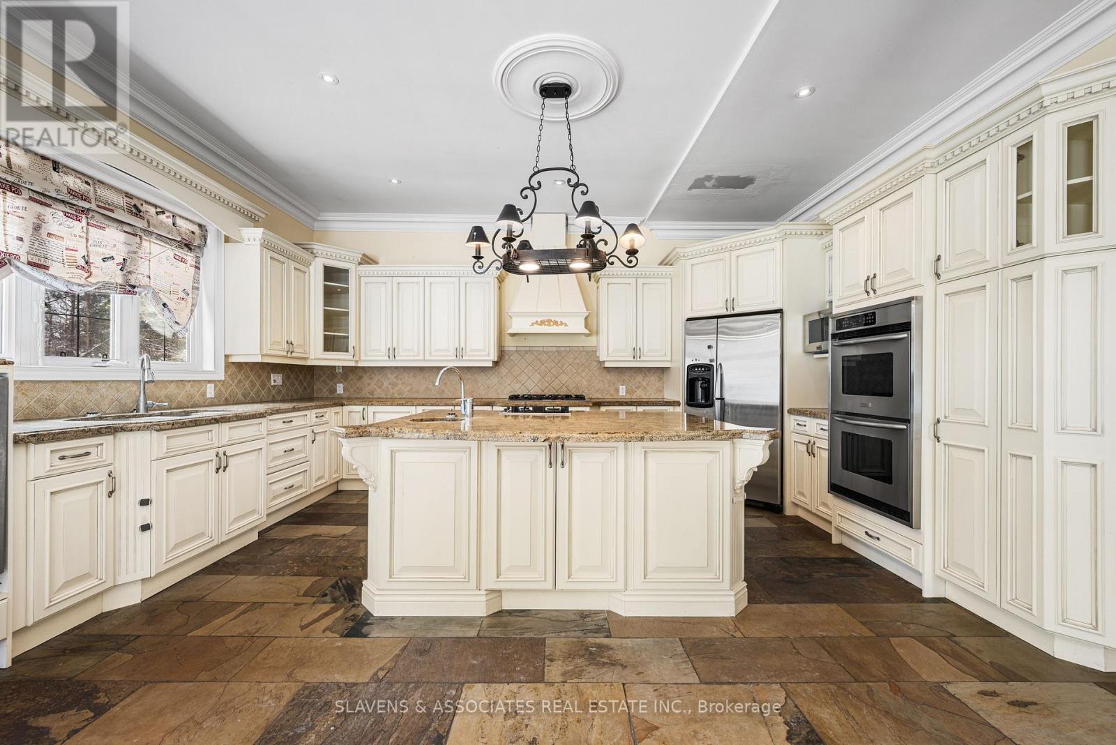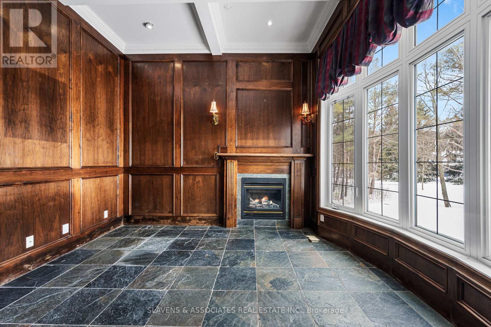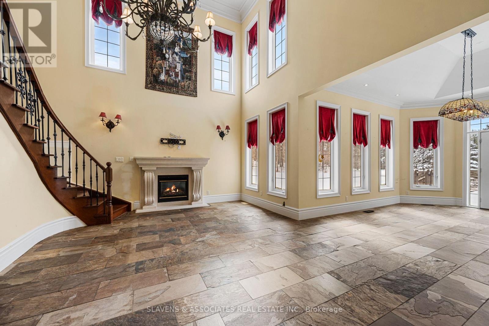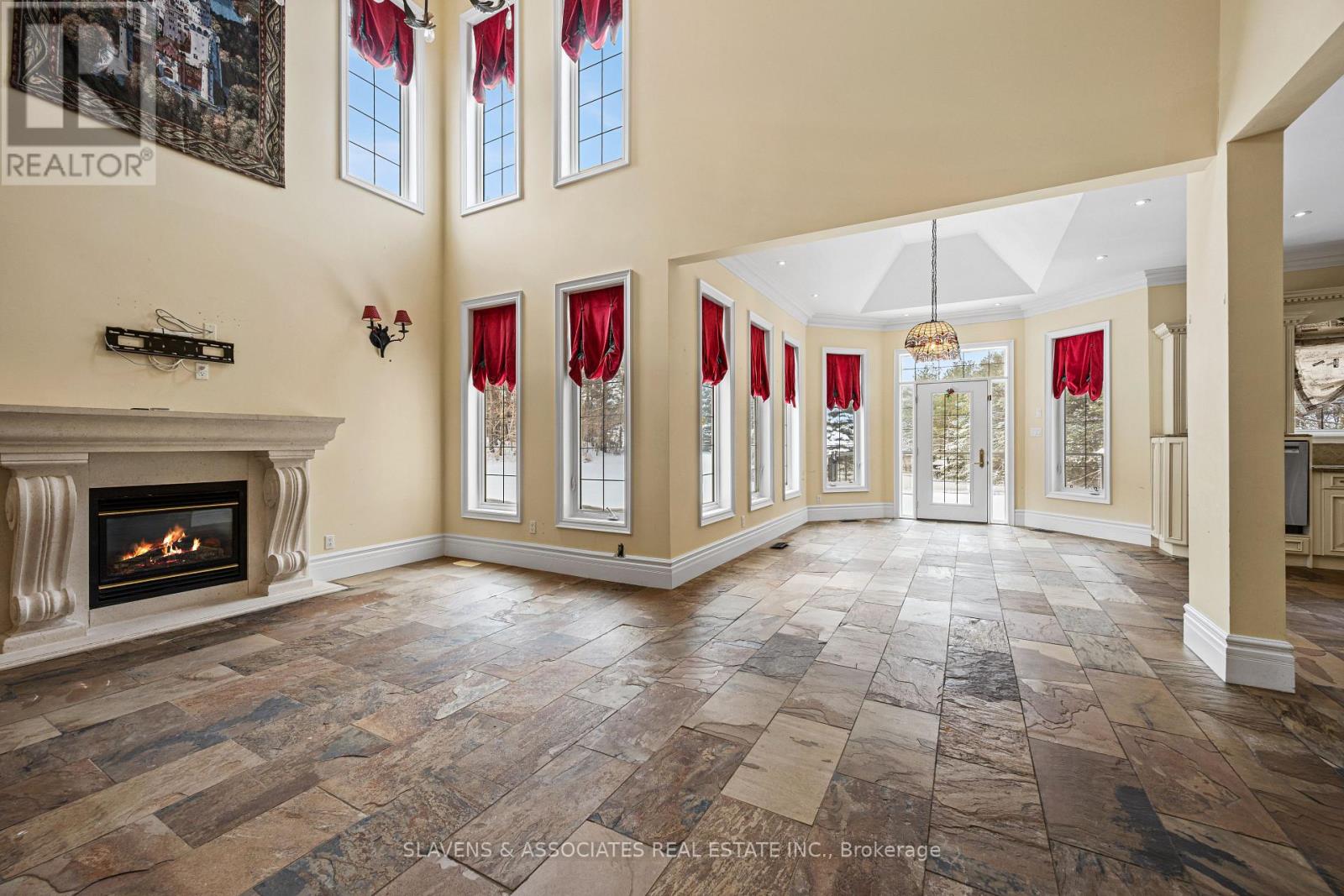 Welcome to this rare offering combining over 8500 sq ft of total living space, thoughtful design, and a prestigious setting in an exclusive enclave. Nestled on a quiet private cul-de-sac and surrounded by prestigious multi-million-dollar estates, this exceptional residence sits on a sprawling two-acre lot offering privacy, space, and refined living. A grand main floor welcomes you with soaring ceilings and elegant tile flooring throughout, creating a bright and open atmosphere ideal for both everyday living and entertaining. A thoughtfully tucked-away office with warm natural wood accents provides ample work-from-home space, while the bright formal dining room showcases crown moulding and timeless charm. Chef's kitchen featuring stone countertops, a stone centre island, and a breakfast area with walkout to the deck-perfect for seamless indoor-outdoor living. Multiple gas fireplaces add warmth and character throughout the home. The upper level features four spacious bedrooms, each with its own private ensuite. The expansive primary retreat offers a luxurious five-piece spa-like ensuite and plenty of room to relax. The above-grade lower level provides exceptional versatility with two additional bedrooms, a kitchen, comfortable sitting area, and flexible space ideal for a gym, recreation area, or playroom. Multiple walkouts lead directly to the expansive backyard, creating endless opportunities for outdoor enjoyment. Walk to Hanson's Chinese + Pizza, Whitchurch Conservation Area, and a quick drive to Highway 404, golf courses, Longo's, Farm Boy, Walmart, Pharmacies and more. (id:51158)