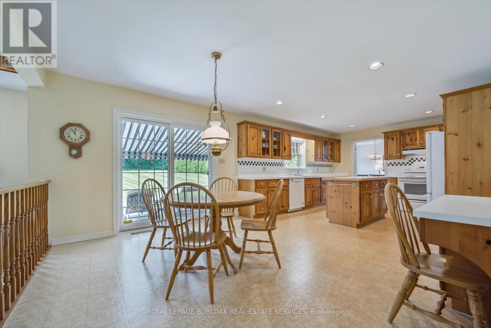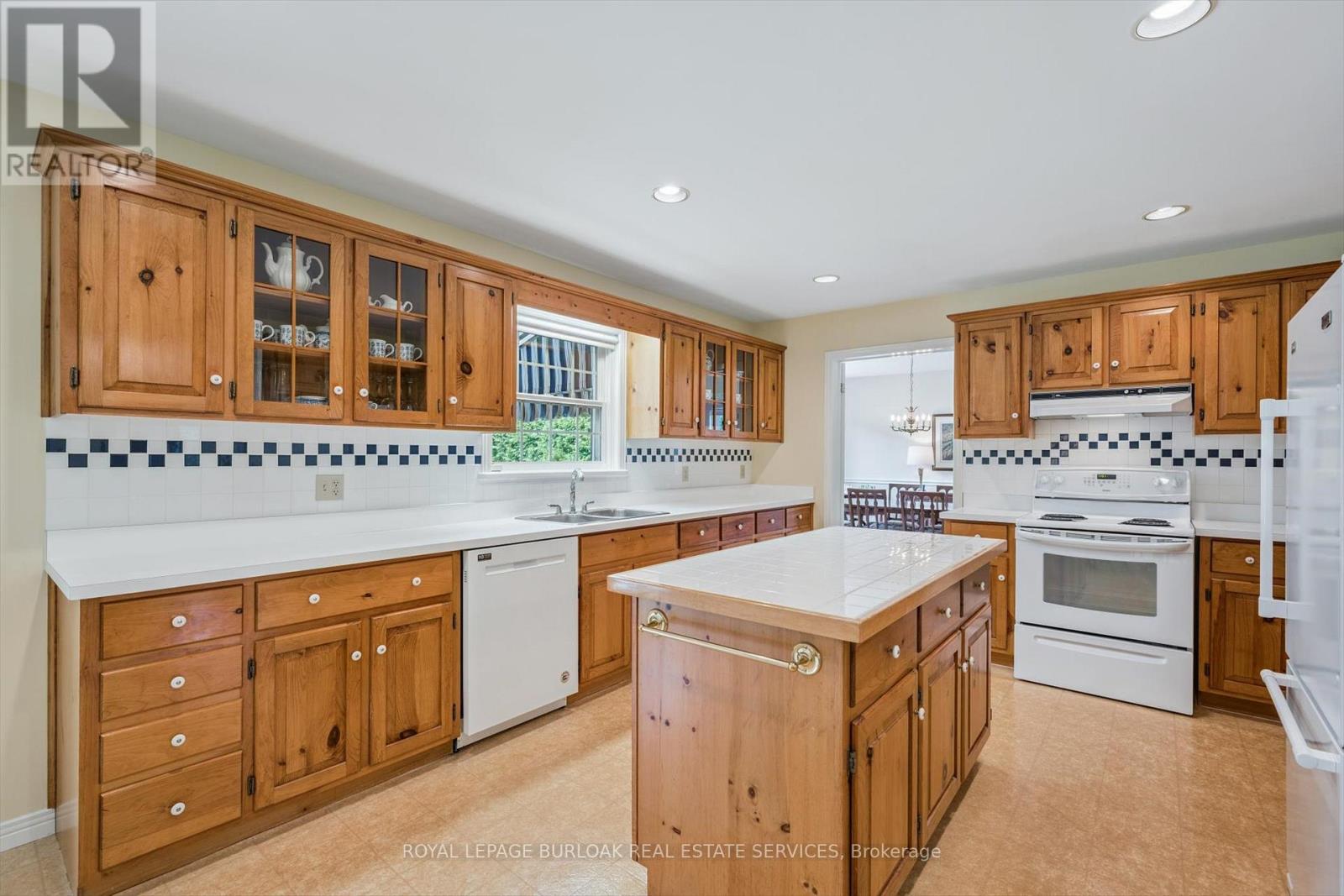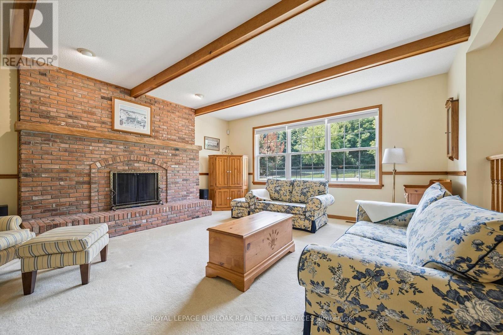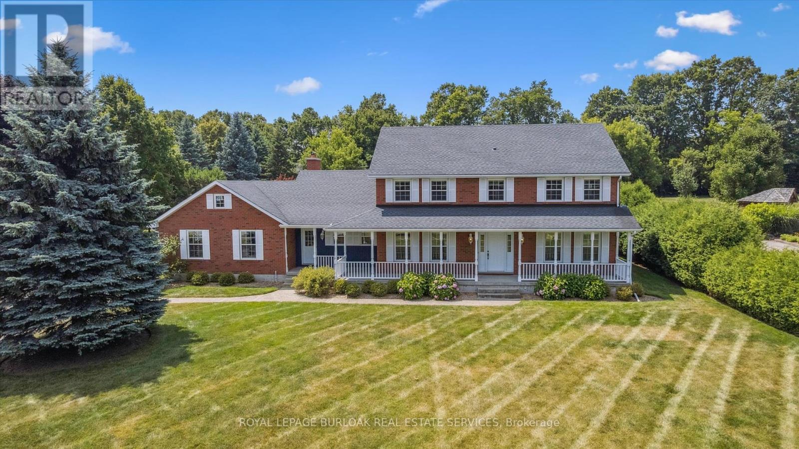 Live on one of Campbellville's most exclusive courts. Country living on over an acre with easy access to Hwy 401 and Guelph Line ideal for commuters and nature lovers. Minutes east to Toronto and Pearson International Airport or west to Kitchener Cambridge. This custom Georgian-style red brick two-storey built in 1988 offers approximately 3400 square feet of charm. A newly paved driveway and welcoming front porch leads to a spacious 2.5 car garage. Nestled in a private, cedar-lined setting surrounded by mature trees the backyard is a true retreat complete with a fenced in-ground pool and an expansive concrete patio with large 3-season canopy for outdoor living and entertaining. The home has been impeccably maintained and filled with elegant touches gleaming hardwood floors, formal living and dining rooms and a convenient main-floor office/den. The large spacious open concept kitchen with centre island flows into the sunken family room creating the perfect hub for everyday living featuring a large custom reclaimed brick and rescued solid wood beam mantle wood-burning fireplace. This homes east-facing front entrance and single hung double-pane low-maintenance ENERGY STAR efficient Pollard Advantage Line vinyl windows allow for an abundance of natural light throughout. Upstairs the generous family-friendly layout features 4 large bedrooms, spacious main bath, including a serene primary retreat with a private ensuite and large walk-in closets. The lower level offers two expansive spaces, ideal for a games room and recreation room with a large additional area ready for your future vision. Tranquil country living with all the conveniences close at hand. Ideally located with quick access to Hwy 401 and minutes from the amenities of Oakville and Burlington. If you love the fresh country air, you'll fall for the unique charm of Campbellville, a sought-after, family-friendly community where small-town warmth meets everyday convenience. (id:51158)