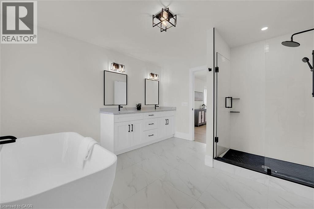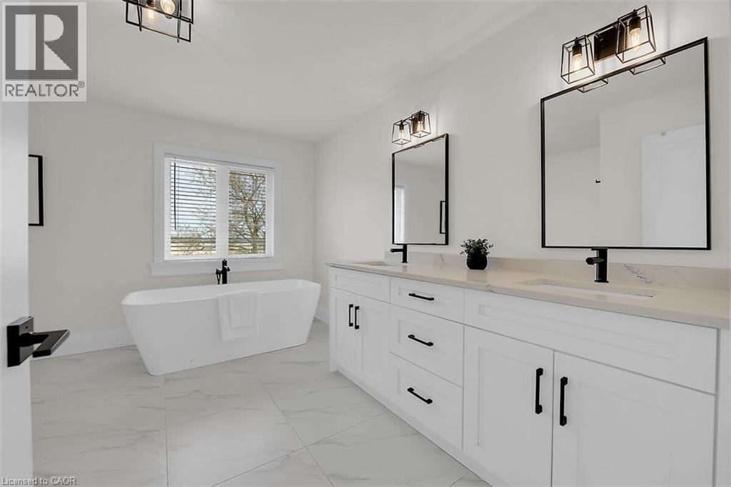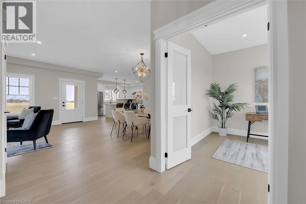 Rent to own option available. Luxury custom home built in 2023. Escape to the country with the convenience of all amenities just a short drive away! Minutes from Hwy 6 & Hwy 403, with quick access to shopping, restaurants and Hamilton Airport. The main floor features an open concept layout with a combination of engineered hardwood and tile floors, and an abundance of natural light. The den is situated at the entry of the home and provides a great work from home space. The kitchen offers quartz counters and backsplash, stainless steel appliances and a large island that is great for entertaining. There is also an upper level family room which is ideal for large and growing families. The stunning primary suite features a lavish ensuite with freestanding soaker tub and separate shower plus an enormous walk in closet. The upper level hosts 3 additional bedrooms, main 5 piece bath and a convenient laundry room. Enjoy the outdoors on your covered rear porch complete with scenic farm views. (id:51158)