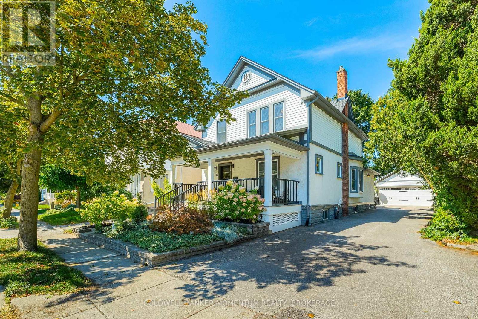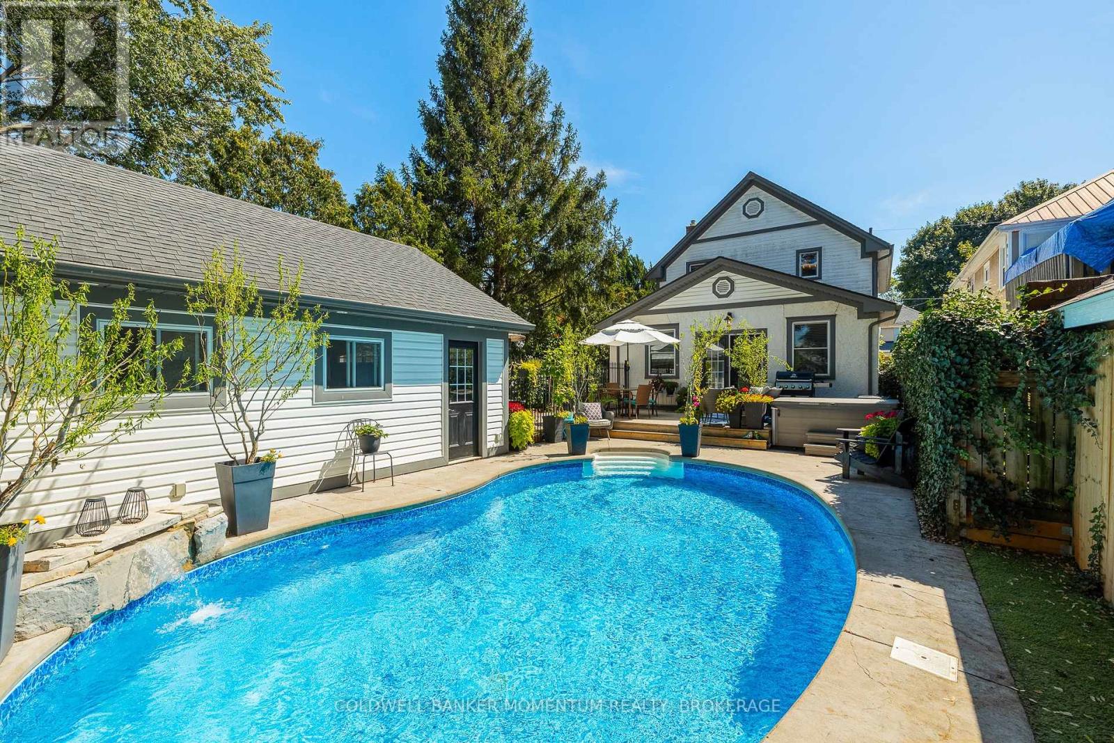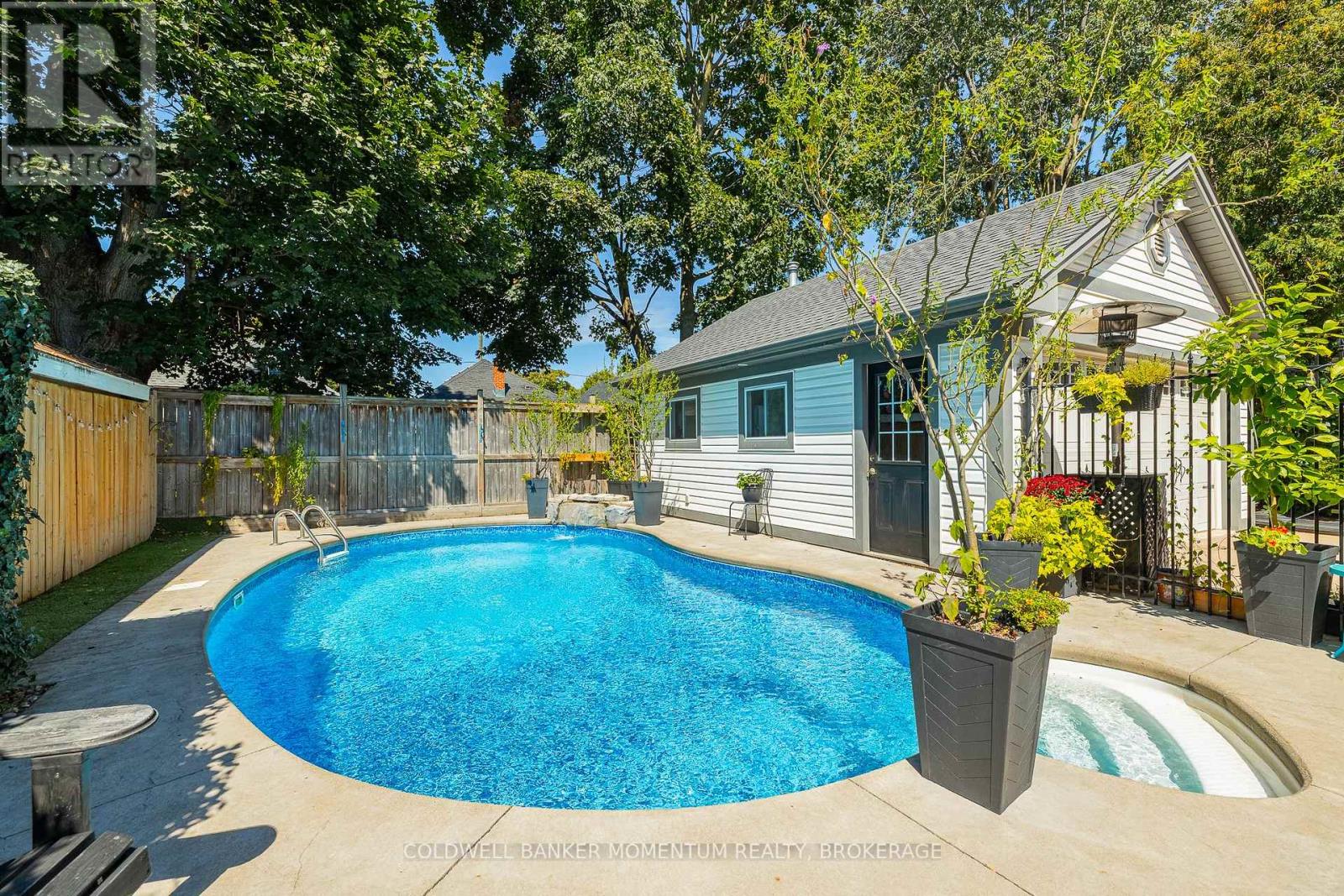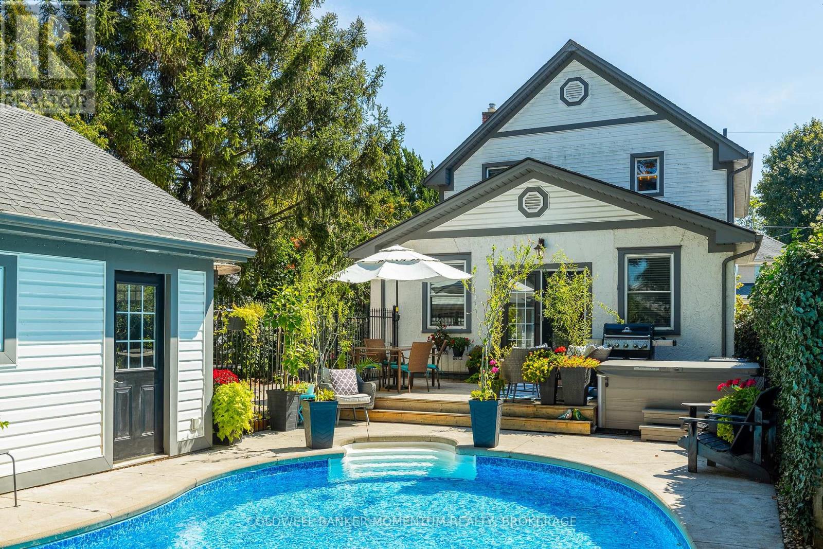 Exceptional one-of-a-kind property in the heart of downtown St. Catharines. Circa 1917, this 2 story century home has all the timelessness of its original design w/ modern updates throughout that makes this such a desirable home to live in. From the moment you enter the welcoming foyer you can feel the homes rich history. The original gumwood trim, doors, high baseboards & classic layout radiates warmth & tradition. With just over 1,950 sq ft of total finished living space there are some really impressive features that is unique to only this property. Newer luxury vinyl plank flooring throughout. The main floor offers a spacious living room w/ lead glass windows, a formal dining room w/ big bay window thats ideal for hosting large gatherings & a versatile den w/ updated 2pc bath that could be used as a 4th bdrm or home office. The heart of the home is the beautifully updated oversized eat-in kitchen that showcases a lrg island w/ newer quartz countertops, newer tile backsplash & pot filler, stainless steel appliances, custom cabinetry by Millbrook Cabinetry & patio doors that lead to a private backyard sanctuary w/ spacious deck (rebuilt in 2019), hot tub (2019), heated saltwater inground pool w/ stone waterfall feature (new saltwater system 2025) & gas hook-up for BBQ. The second floor offers 3 bdrms, an updated 4pc bath w/ vintage claw foot tub, separate shower, newer vanity & lighting (2019). One of the standout features is the super convenient laundry rm on the second floor. The basement is partially finished w/ a rec rm & huge unfinished storage space. The covered cedar front porch was rebuilt (2021) & is the perfect spot to enjoy the last warm days of Summer & the crisp start of Fall. The private driveway fits 6 cars & another standout feature is the detached insulated double car garage w/ hydro & lrg loft for storage. Located in a family-friendly neighbourhood w/ quick & easy HWY access. Walking distance to parks, schools, restaurants & so much more! (id:51158)