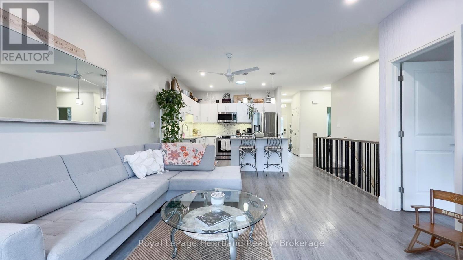 Beautiful Modern design Energy Efficient Bungalow Home located in trendy neighbourhood in south Exeter! Front porch is ideal for evening coffee as you watch the world go by. Open concept main Living areas with stylish kitchen, dining area and living room that overlooks a fenced yard featuring a deck, pond and gardens. Backyard backs on to cedar hedge and creek so enjoy the privacy and all the birds that call this home. Two good size bedrooms complete this level Master with walk in closet and 3 piece ensuite. Lower level is finished with a large but cozy family room, office or 3rd bedroom and a 2 piece bath plus there is lots of great storage in this level. Upgrades include backsplash in kitchen 2024, 2 Solar Tubes in Living Room and Kitchen in 2024, painted throughout Main Level in 2024, Fenced Yard, Deck and Pond in 2023, New flooring on main level in 2024, and finished basement in 2022. (id:51158)