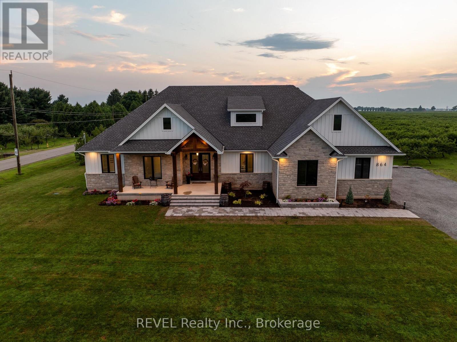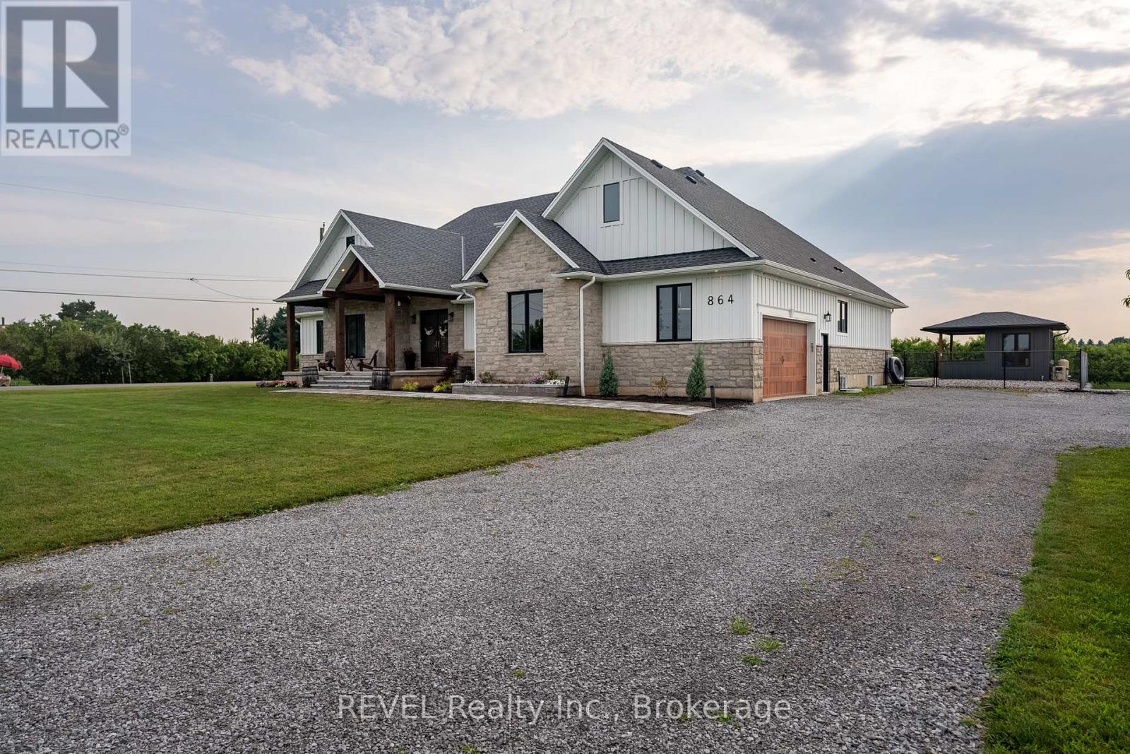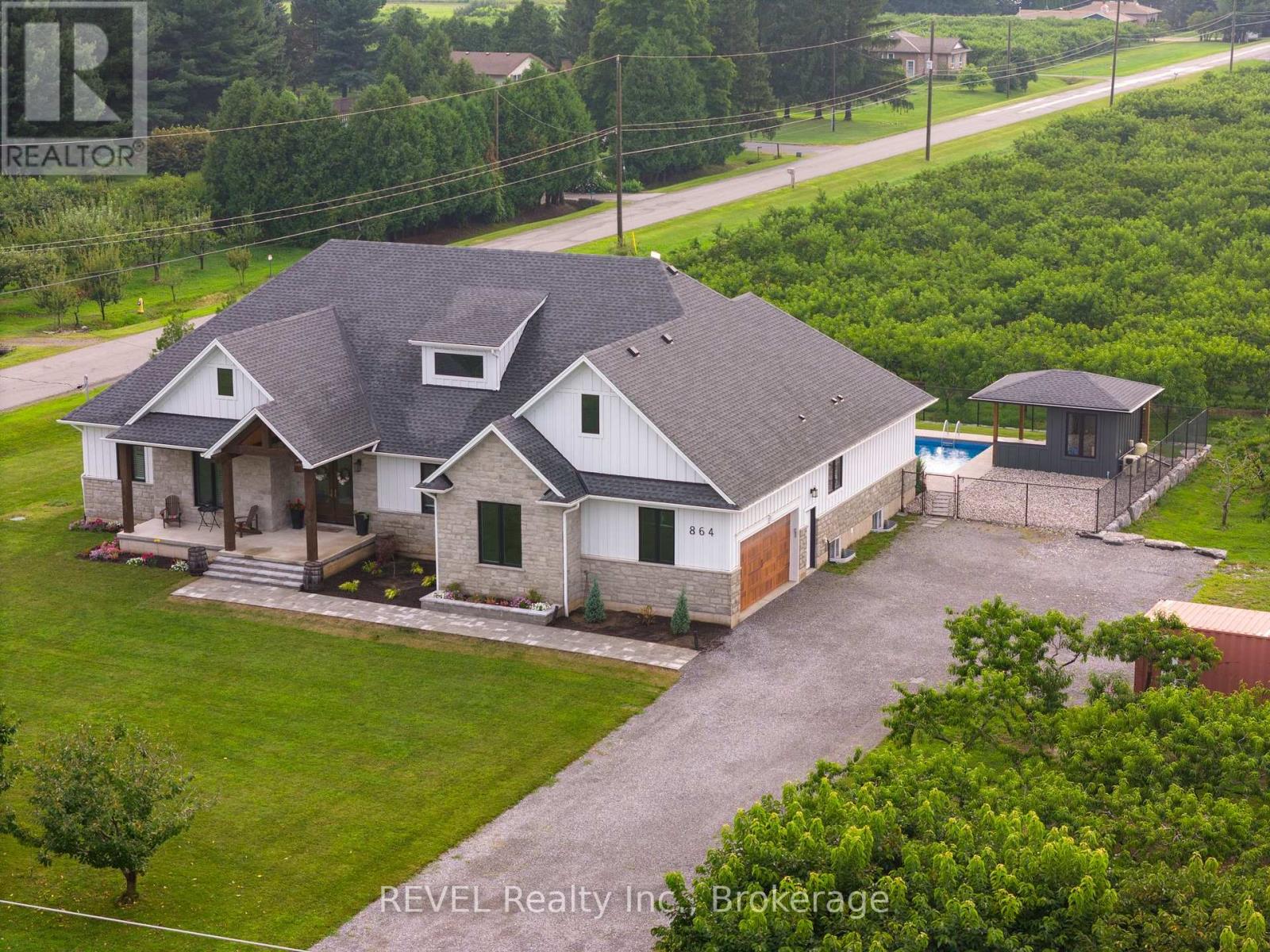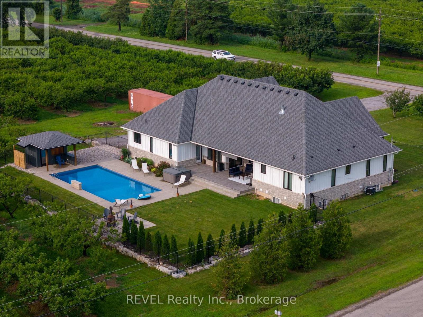 Welcome to this stunning 2,945 sq. ft. bungalow, expertly crafted with a blend of stone and Hardie board exterior. From the moment you step inside, you'll be greeted by the expansive open concept living area, featuring soaring 10-ft ceilings and no carpets. The heart of the home is the gourmet kitchen, boasting Quartz countertops throughout, a large island with bar stool seating, stainless steel appliances, abundant counter and cupboard space, and a spacious pantry. The main floor master bedroom wing is a true retreat, complete with a coffered ceiling, a generous walk-in closet, and a luxurious 5-piece ensuite. Enjoy private access to the rear yard from your master bedroom. The main floor also offers a versatile office (or potential fourth bedroom), two additional bedrooms with walk-in closetsone with a private 4-piece ensuite and the other with ensuite privilegeand a 2-piece powder room off the foyer. The mudroom off the garage features a laundry area and barn-style roller door. The fully finished basement includes a large rec room with a kitchenette, an additional bedroom, and a 3-piece bathroom with a spacious glass shower. With 9-ft ceilings and a heated slab, the basement is as comfortable as it is functional. Outdoor living is equally impressive, with a covered rear patio complete with TV hookup, BBQ line, and pull-down privacy screens. Relax in the inground heated saltwater pool, unwind in the hot tub, or enjoy the fully fenced, landscaped yard with a stone wall surround. The property, just under an acre, is surrounded by picturesque vineyards and fruit farms. Additional features include an insulated 2-car garage with hot water hookup, city water, an interior and exterior wired-in speaker system, a security system, and central vac. This exquisite home offers the perfect blend of luxury, comfort, and tranquility. (id:51158)