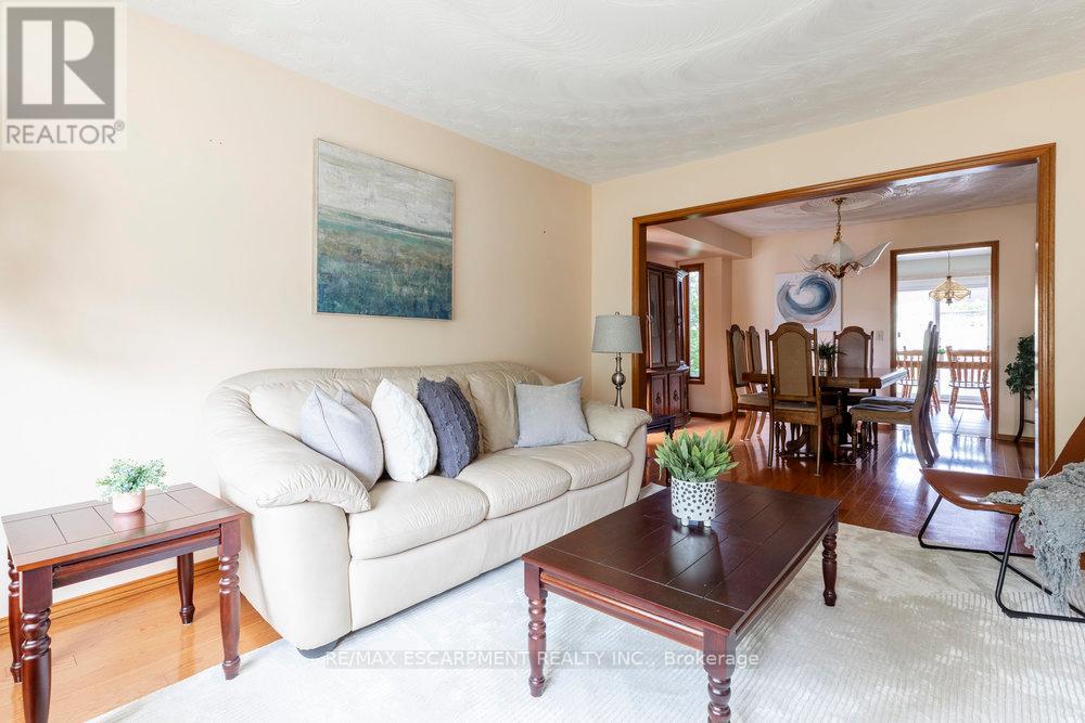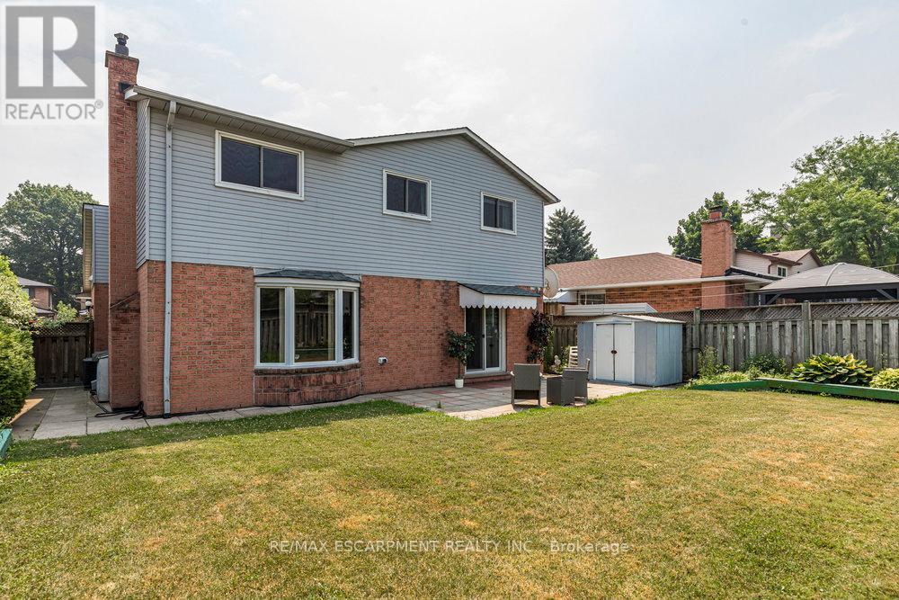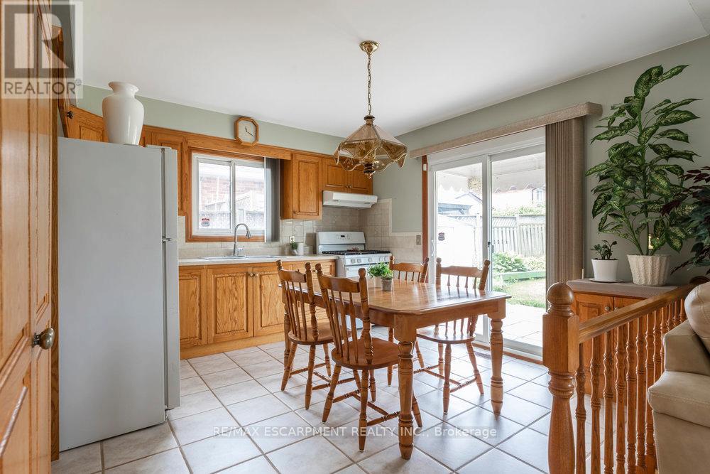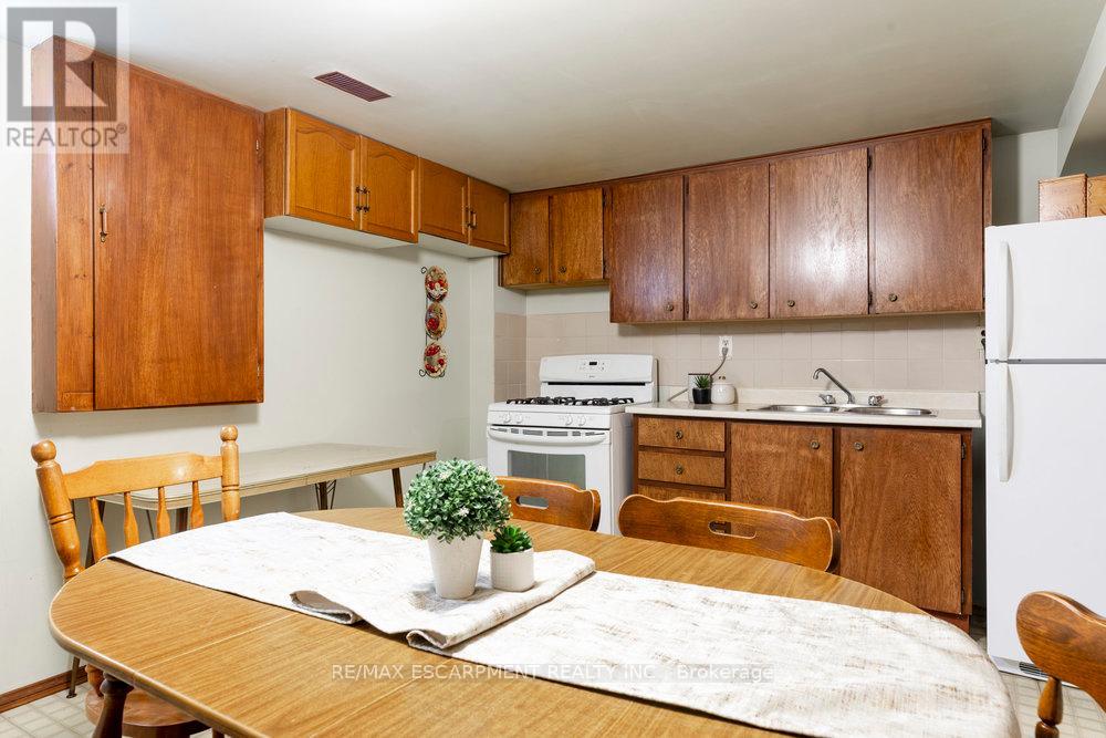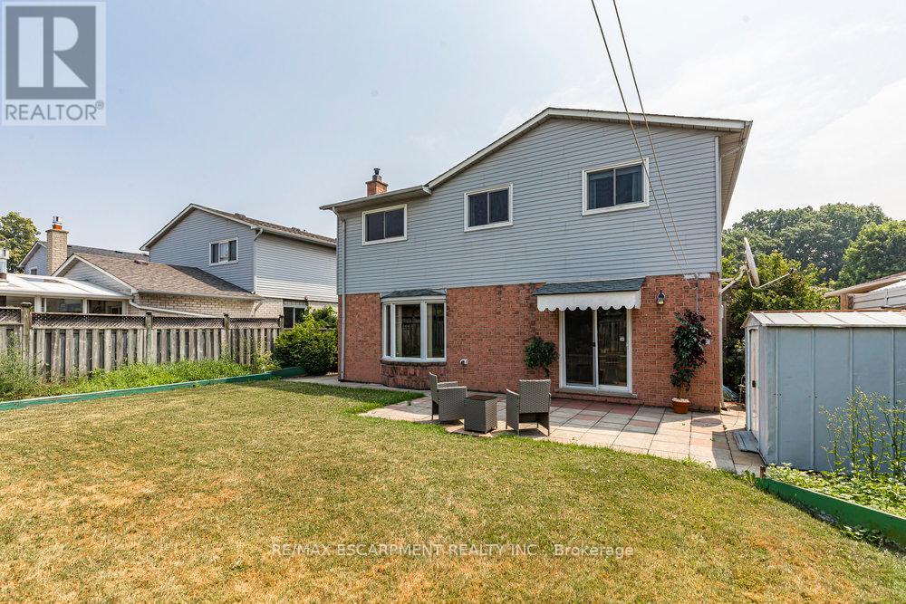 Welcome to this beautifully maintained detached family home, featuring 4+1 bedrooms, 2.5bathrooms, and an ideal in-law suite setup. Nestled in a quiet and highly sought-after neighborhood in Lower Stoney Creek, this home offers easy access to schools, shopping, amenities, and major highways-perfect for families and commuters alike. The main floor boasts formal living and dining area with rich hardwood flooring, an inviting eat-in kitchen with walk-out access to the backyard, and a cozy family room centered around a gas fireplace. For added convenience, you'll also find a powder room, laundry area, and direct access to the attached garage on this level. Upstairs, you'll discover four spacious bedrooms and a well-appointed 4-piece bathroom. The fully finished basement is a standout feature-perfect for multi-generational living or extended guests. It includes a full eat-in kitchen, a 3-piecebathroom, a generous rec room that could easily serve as a fifth bedroom or shared living space, and abundant storage throughout. Step outside to enjoy the large, fully fenced backyard offering complete privacy, mature garden beds, a patio perfect for entertaining, and handy storage shed. The double-wide driveway accommodates up to 4 vehicles, with an additional parking spot available in the attached garage. Lovingly cared for by the same owner for nearly 40 years, this home is ready to welcome a new family to make their own lasting memories. (id:51158)