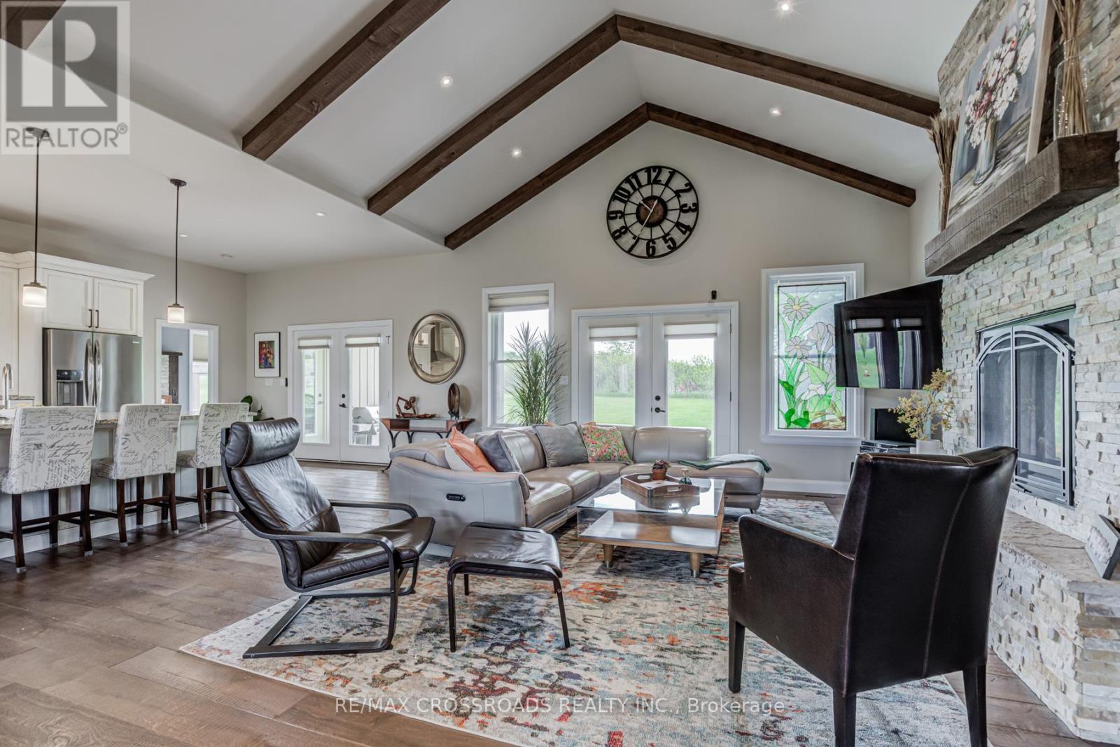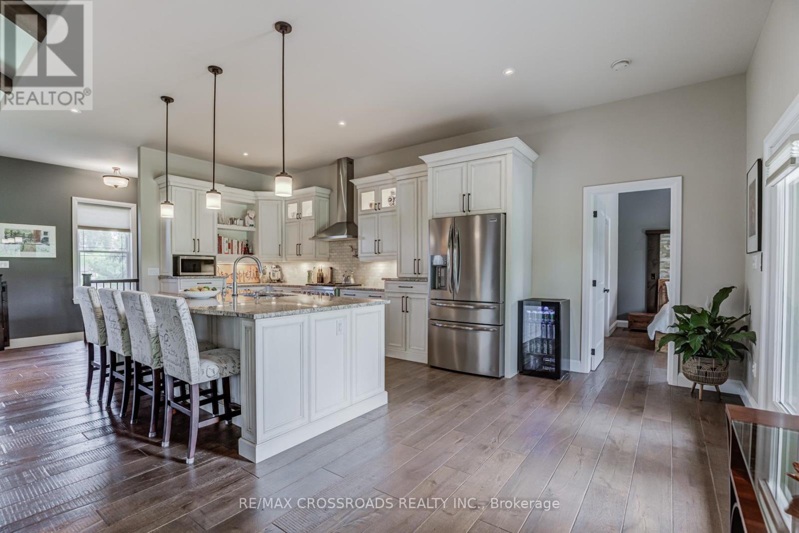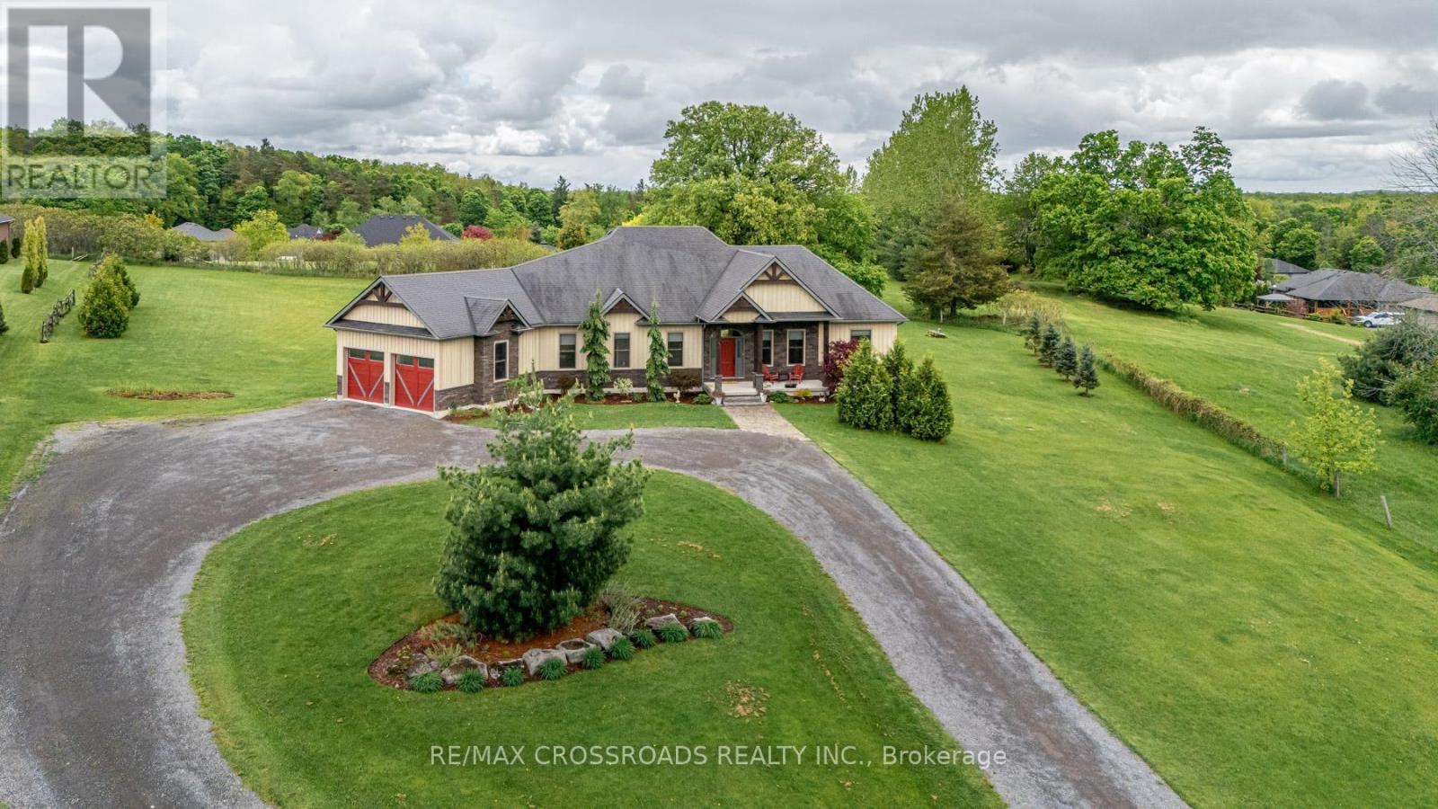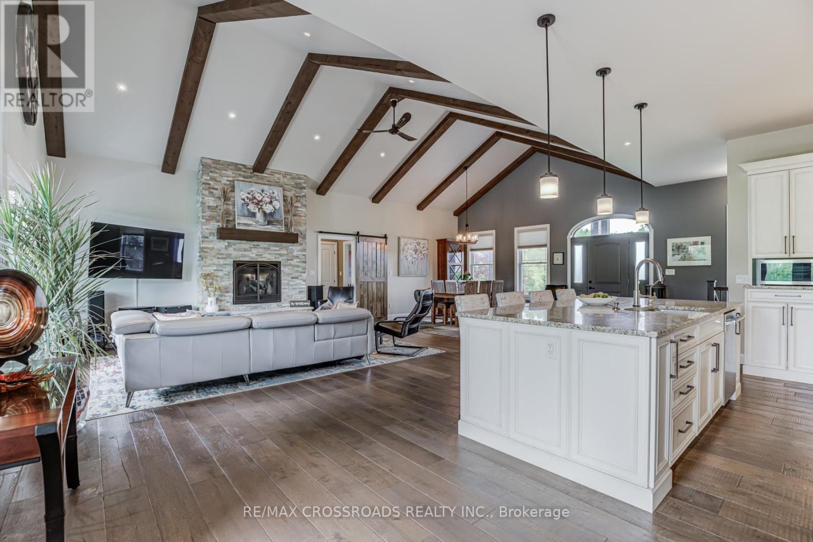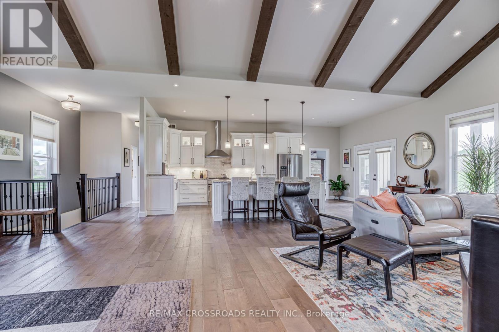Now's your opportunity to own this exceptional sprawling custom-built bungalow with approx. 3600 sq ft of living space in the coveted Hearthstone Ridge Estates, just 10 minutes to the 401! This stunning home offers 3+1 spacious bdrms & blends luxury, comfort, & country charm in every detail. Upon arrival, you'll be charmed by the striking combination of stone and board-and-batten exterior that complements the rolling countryside along with the professionally designed landscaping & meticulous gardens that surround the home making it the crown jewel of the neighbourhood. Step inside and experience the bright and airy open concept layout. The living room with its soaring cathedral ceilings adorned with wood beams & gas fireplace set the tone for elegant rustic living. The ultimate chefs kitchen is a showstopper, featuring rich wood cabinetry, gleaming granite countertops, premium s/s appliances including a Thermador gas range & dishwasher, & a generous island perfect for entertaining. French doors & large windows throughout invite the outdoors in, offering views of the gardens from every room. The large primary suite is your private retreat with a cozy reading nook overlooking the garden, direct patio access, & a luxurious ensuite w/ quartz countertops, heated floors, & a spacious walk-in multi-jet shower. A huge w/i closet with custom cabinetry add to the suites appeal. On the opposite wing of the home, you'll find two additional well-sized bdrms & a stylish main bath. The fully finished basement expands your living space with a 4th bdrm, full bath, & ultimate man cave complete with billiards, darts, an acoustically treated home theatre area, & plenty of space for an office, gym, & playroom. Storage is plentiful. The private backyard oasis features a covered stone patio, hi-fi audio, gas BBQ, & a large firepit perfect for year-round relaxation or entertaining. If you're seeking peaceful, upscale country living with city convenience, this Hearthstone Ridge gem is it. (id:51158)